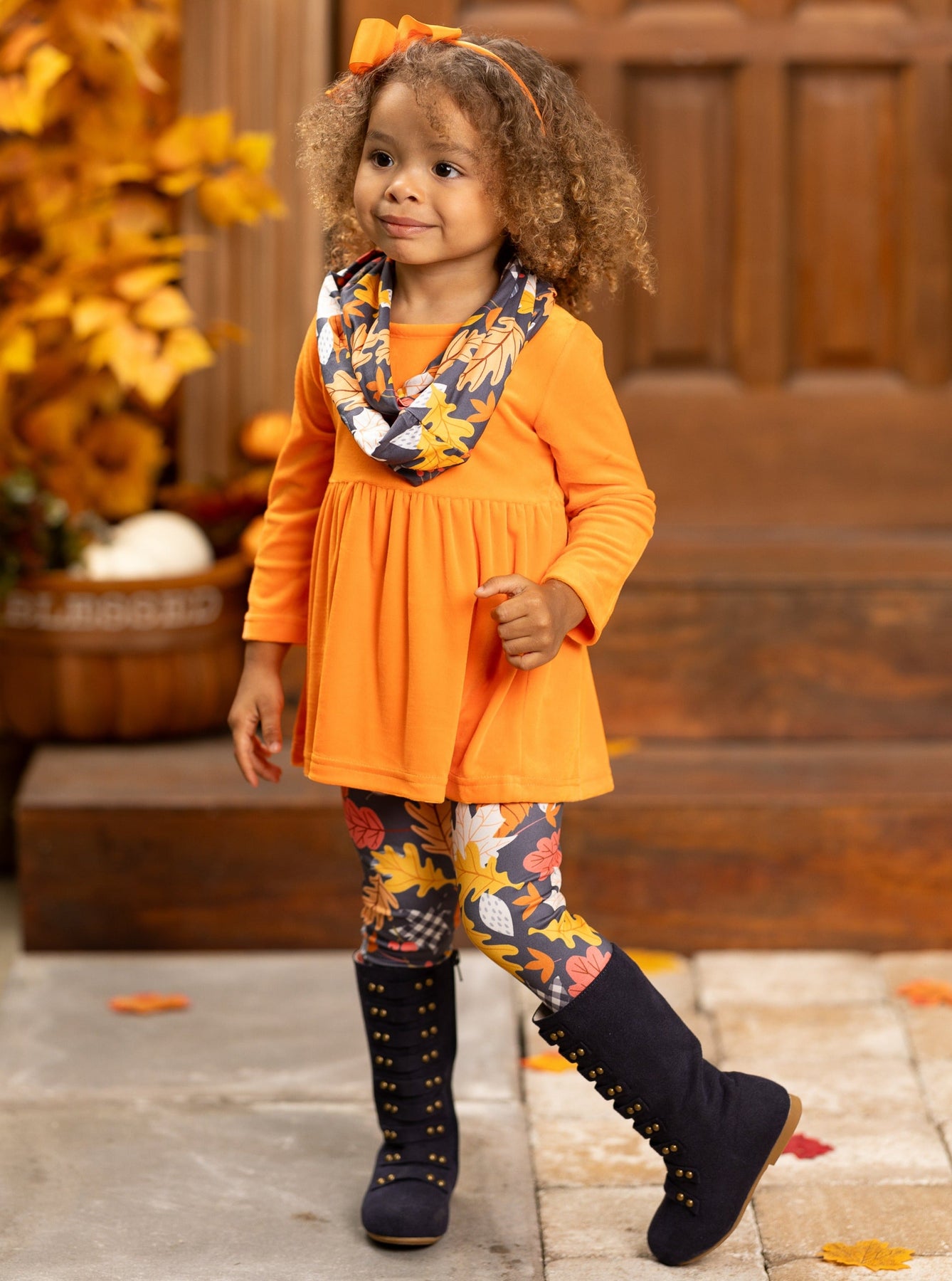 - Does your little girl love the Fall? Now she can say it with our faboulus three-piece legging set complete with ruffles and colorful leaves. Vibrant fall orange and a fun design on the matching leggings and infinity wrap scarf.