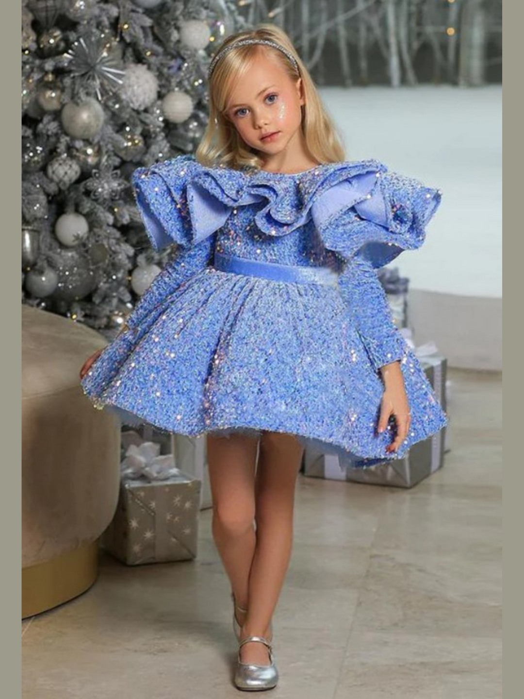 - Give her all the awards! Our sparkle mini gown has a stunning silhouette, a statement ruffle collar, and a bouffant skirt style that adds drama to the look. Whether for pageants or for parties, this dress will have your precious girl looking like the fairest of them all!