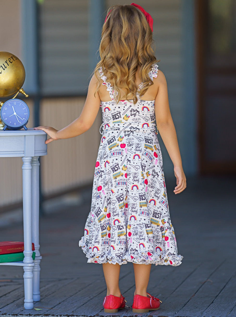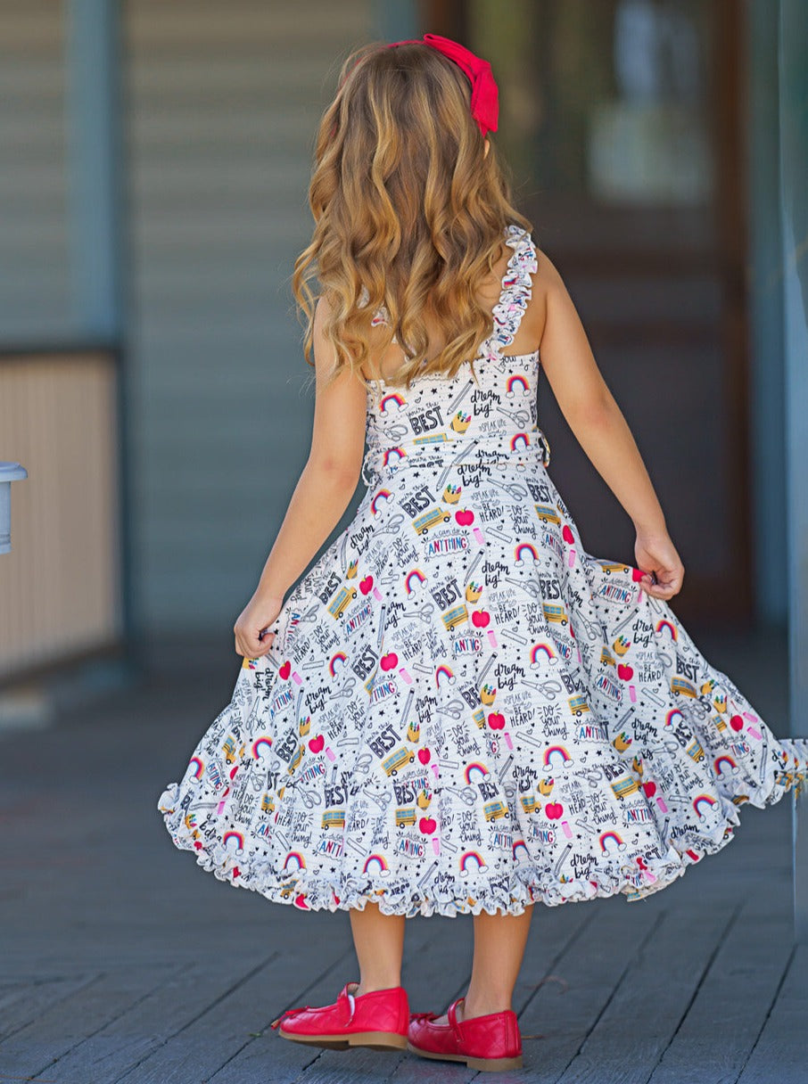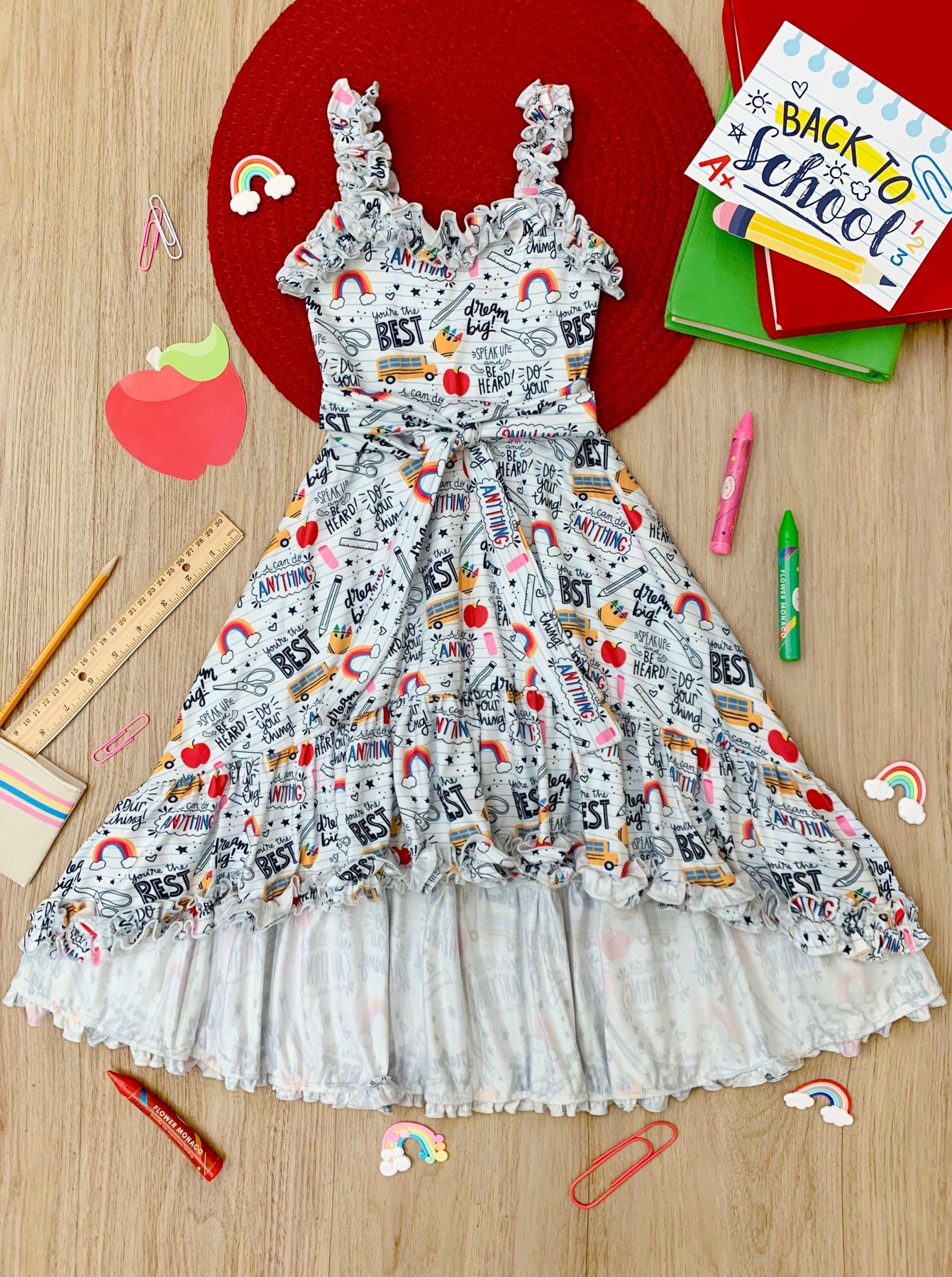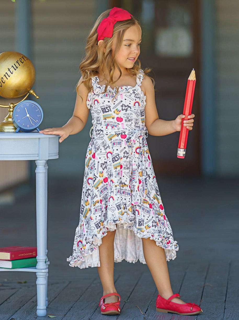 - Sleeveless school doodle print hi-lo dress with ruffle bib, ruffle hem, and belted sash at the waist