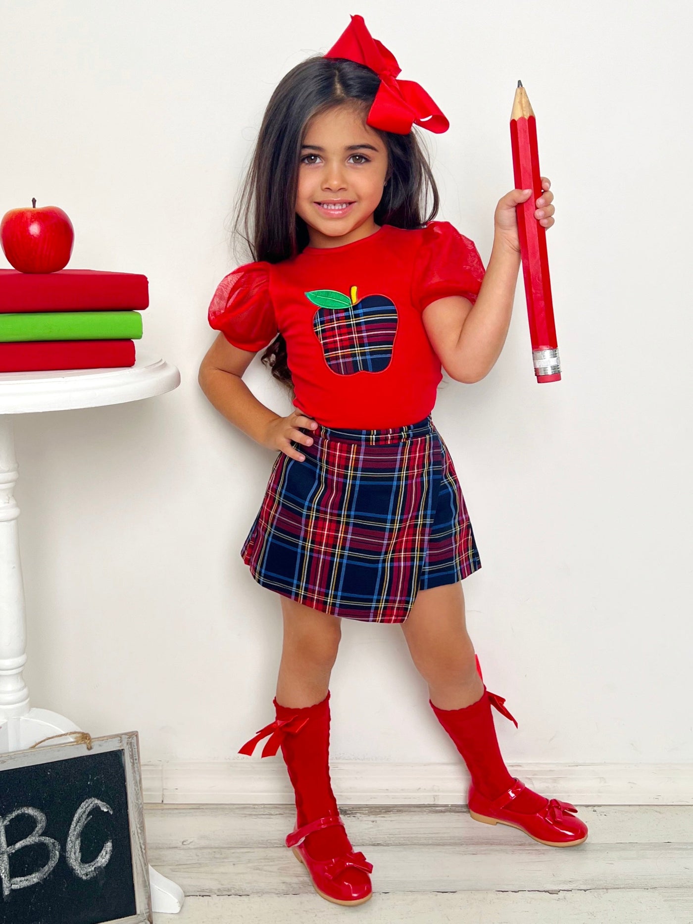 - Puff sleeve top with an embroidered plaid apple and matching plaid skort