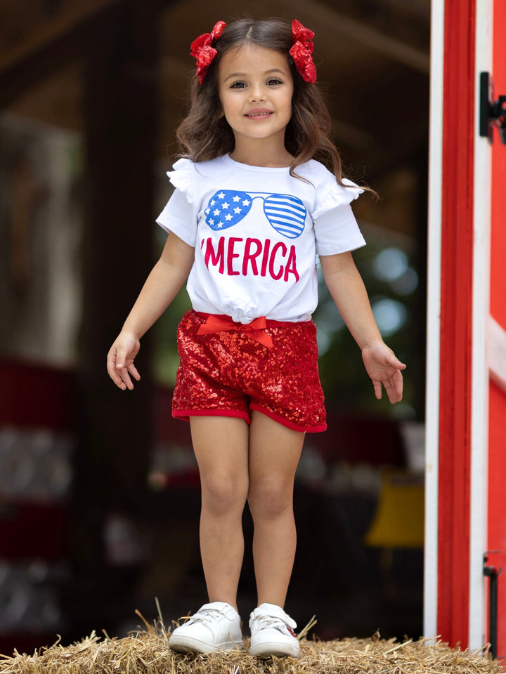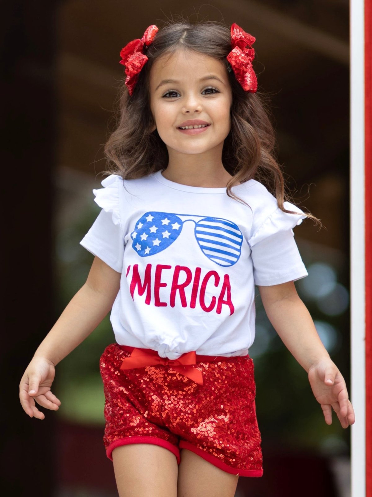 - "'Merica" ruffle sleeve knot hem top and red sequin shorts