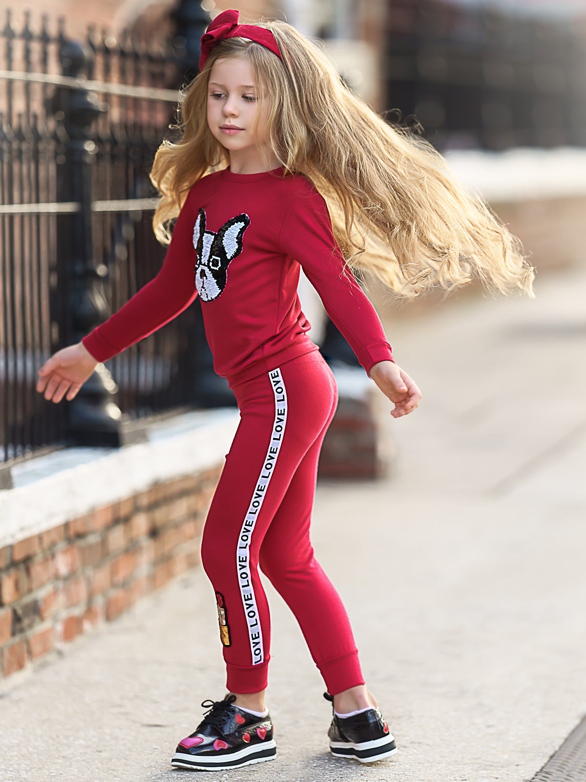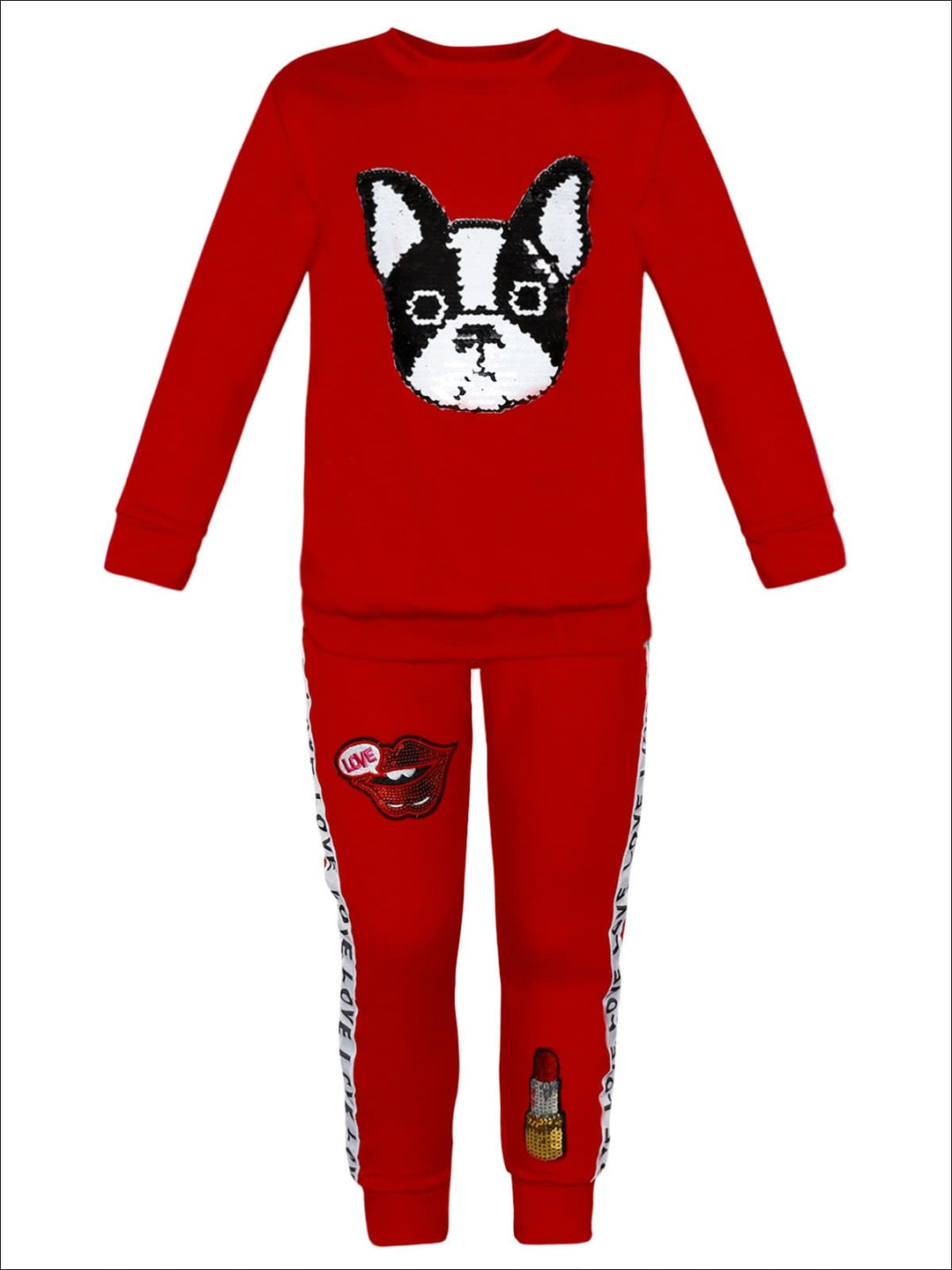 Girls Sequin Puppy Red Sweatshirt And Jogger Set - Mia Belle Girls