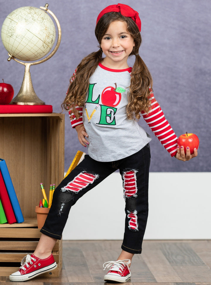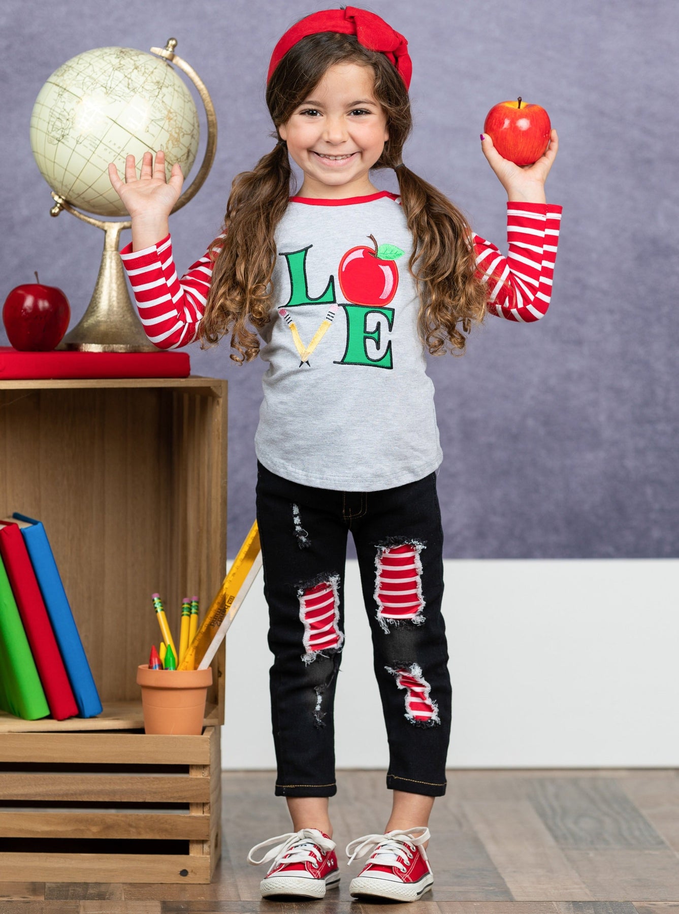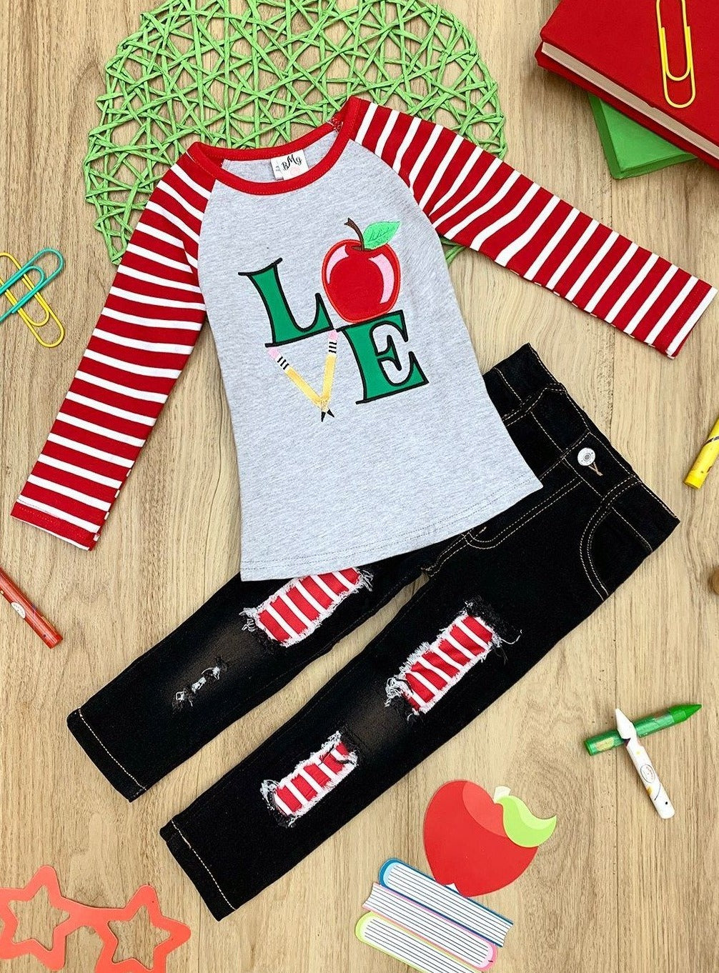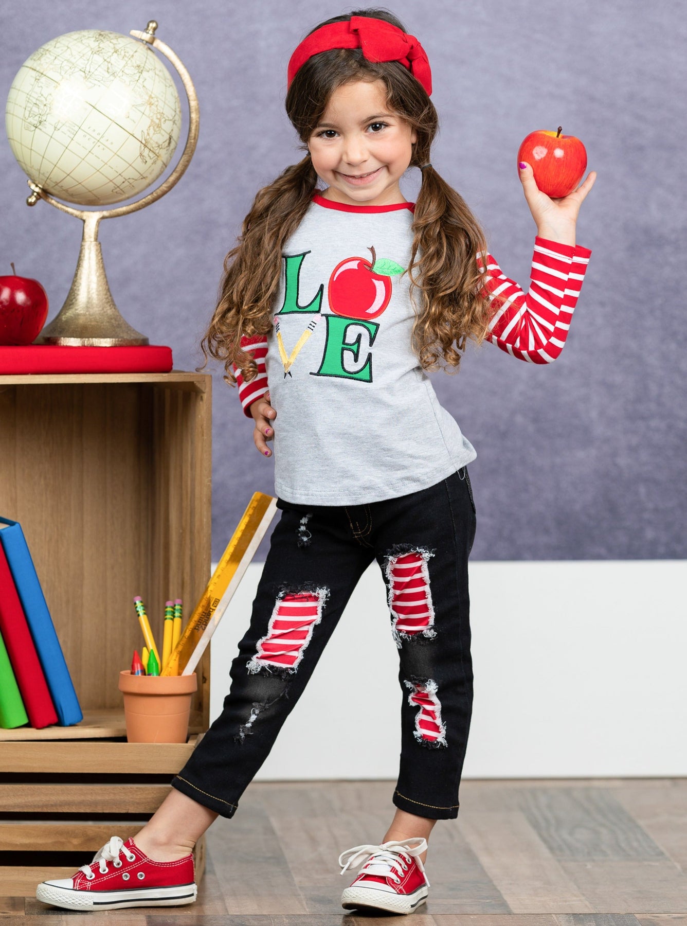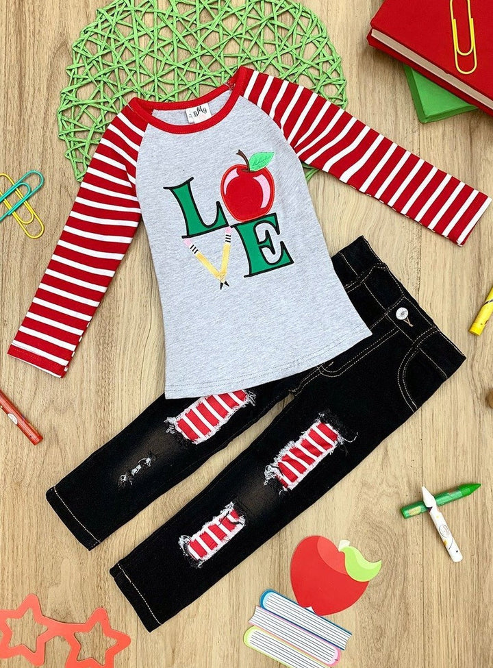 An apple a day means her outfit will SLAY! This precious patched jean set features a super-cute kitten design. Your little girl will be ready to tackle everything the school year has in store.