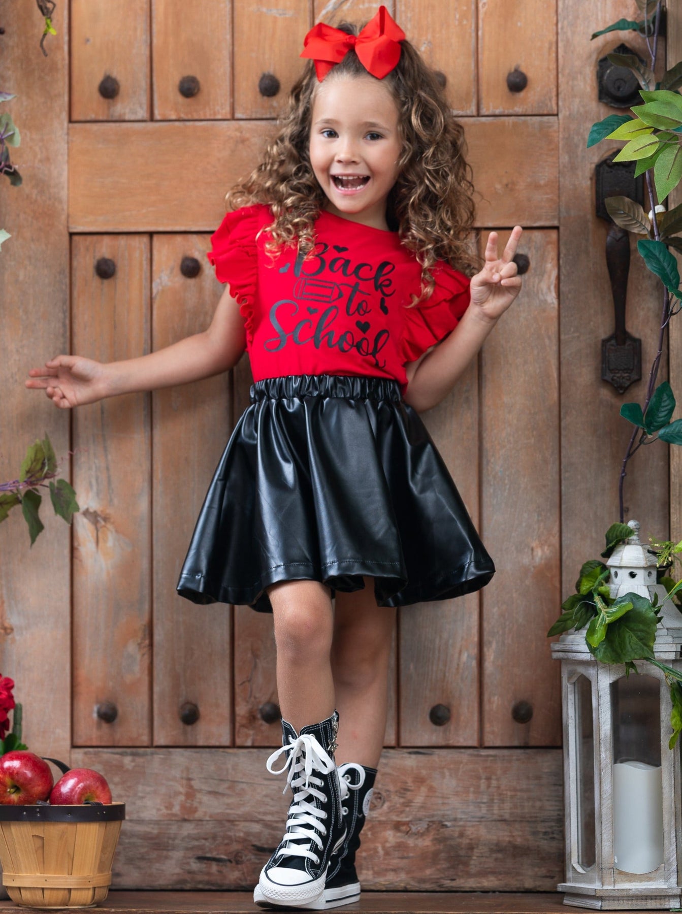 - Send her back to school in sassy sophistication thanks to this vegan leather skirt set. Cute graphic design meets fabulous flair! Best 1st Day pics, EVER!