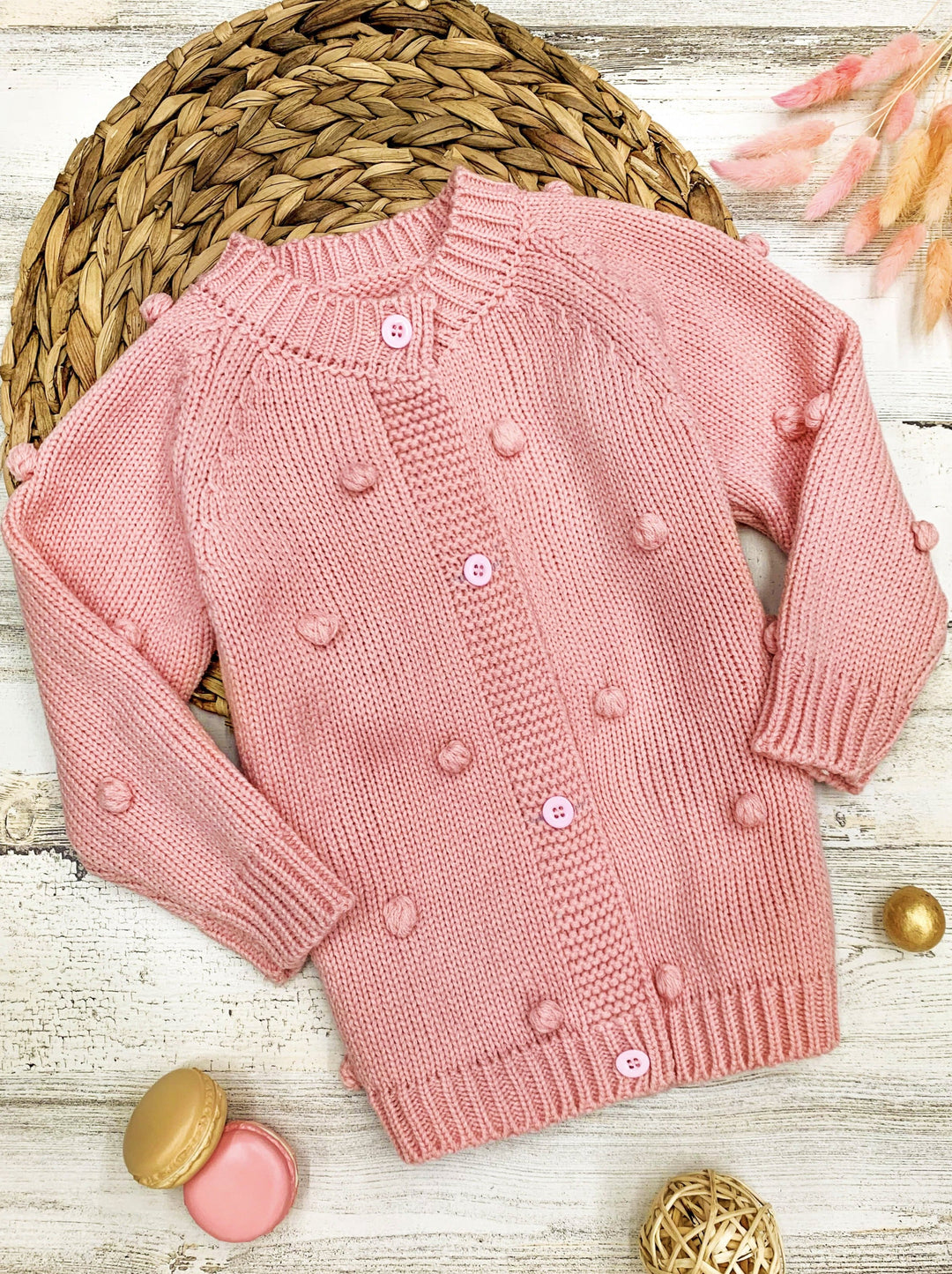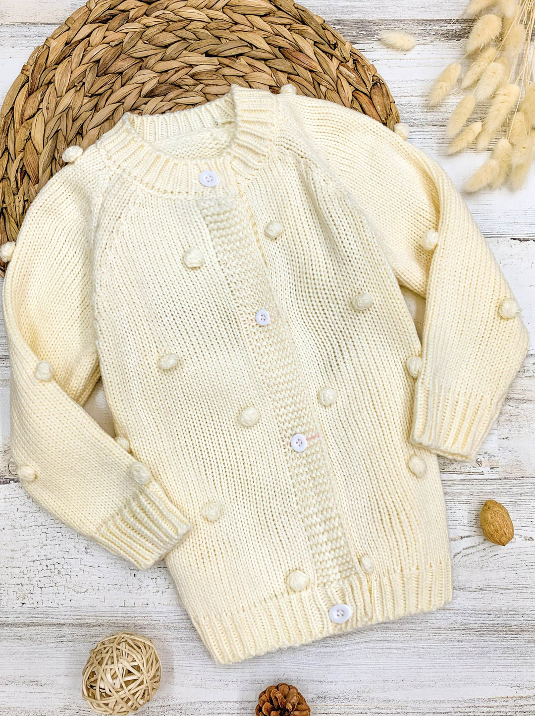 Long-sleeve button-down cardigan with pom-pom accents