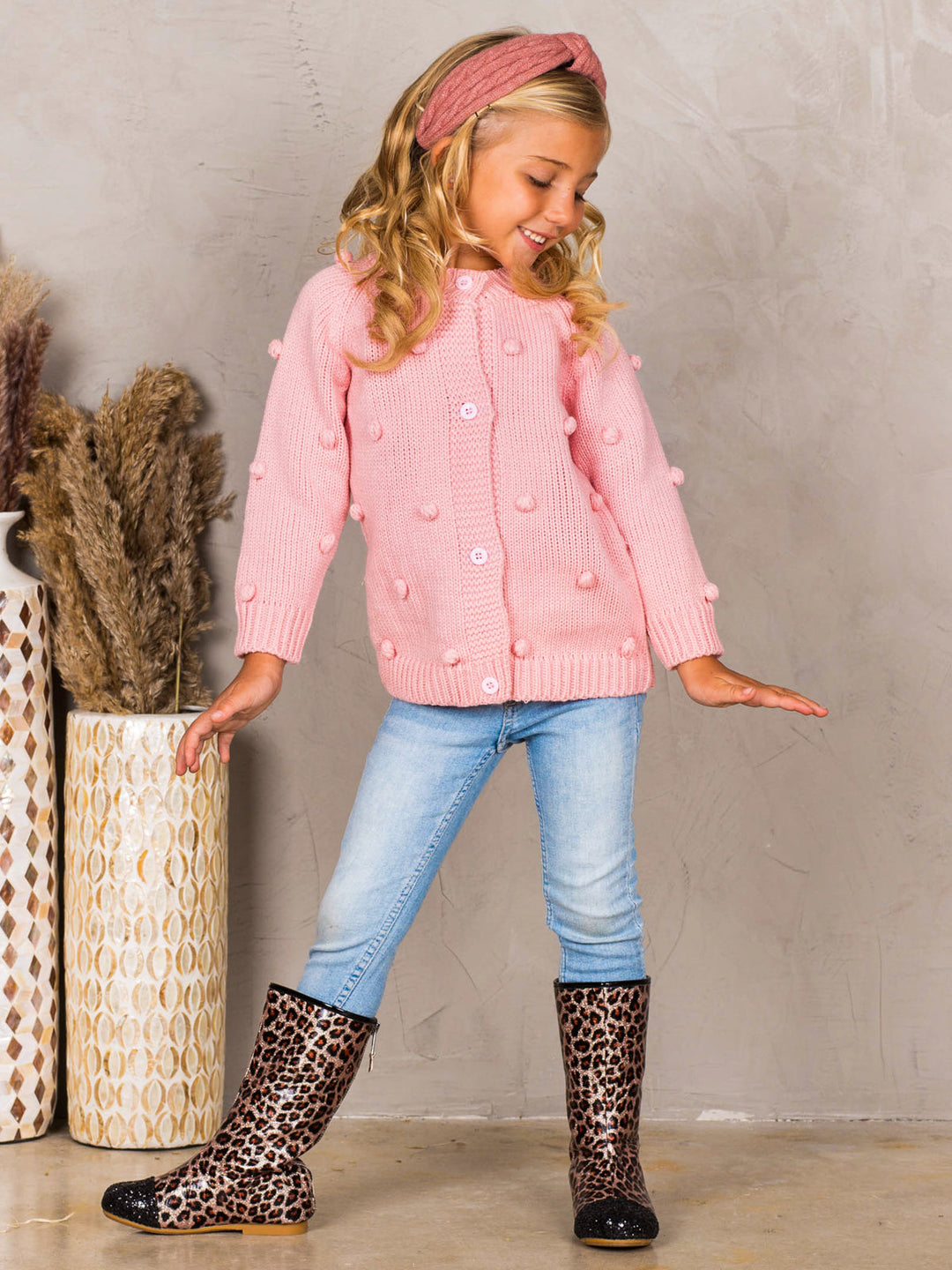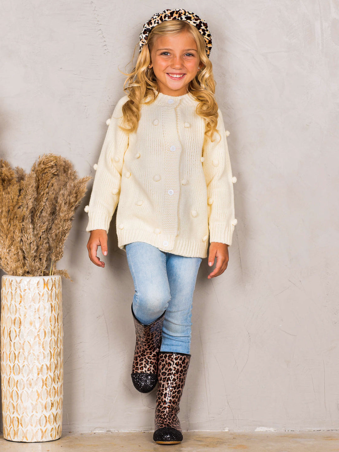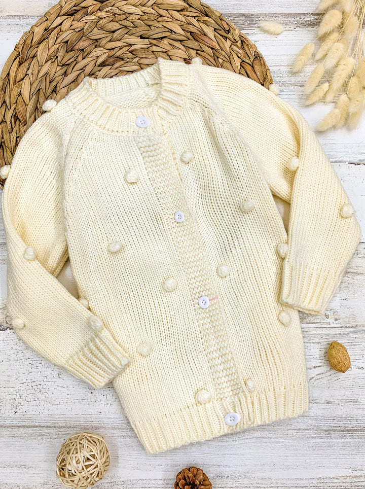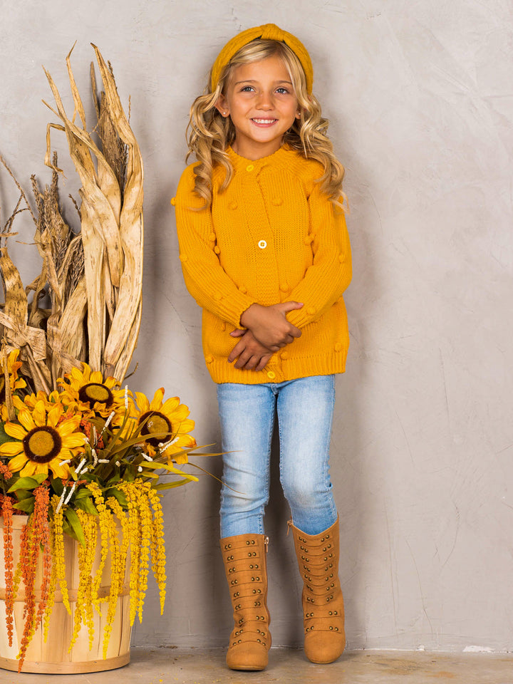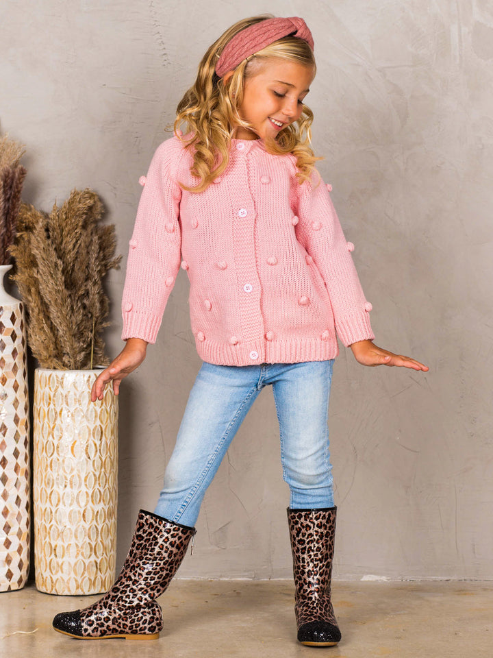 Cozy up your cutie's closet with this trend-right cardigan accented by pom poms and crafted from soft, fuzzy fabric. She’ll stay warm while still showing off her innate sense of style with this casual cardigan boasting a classic look.