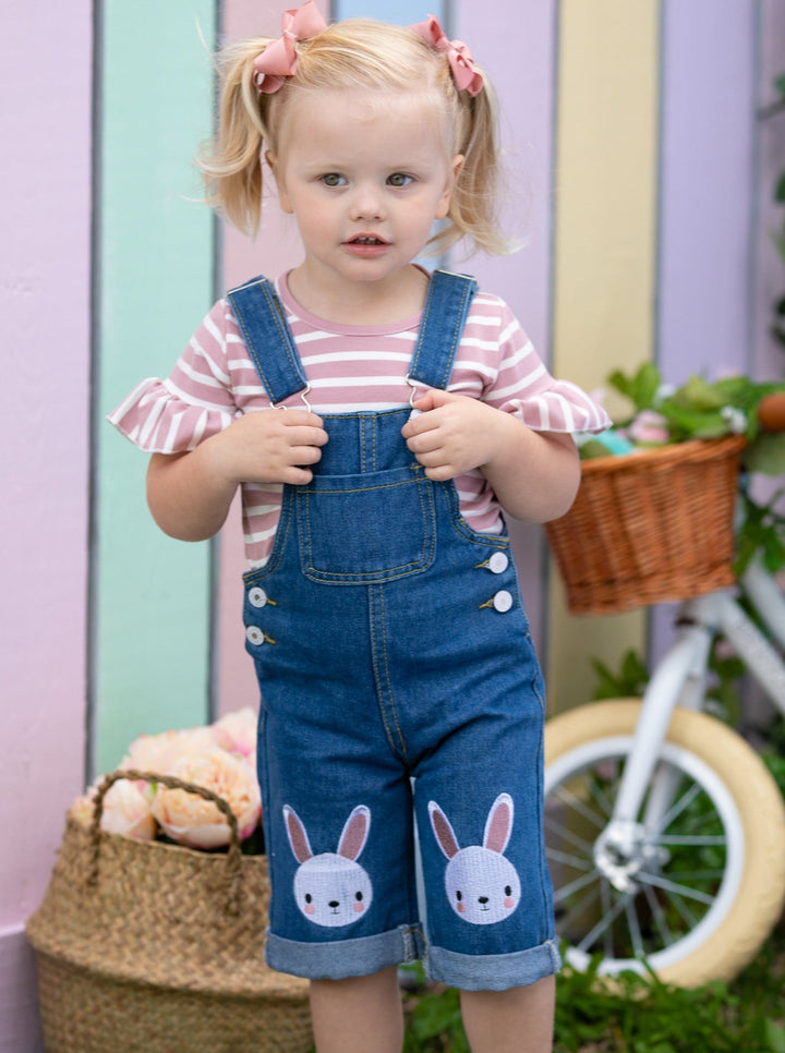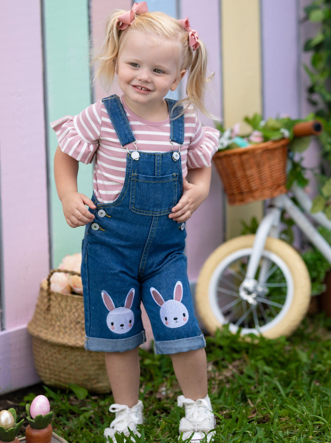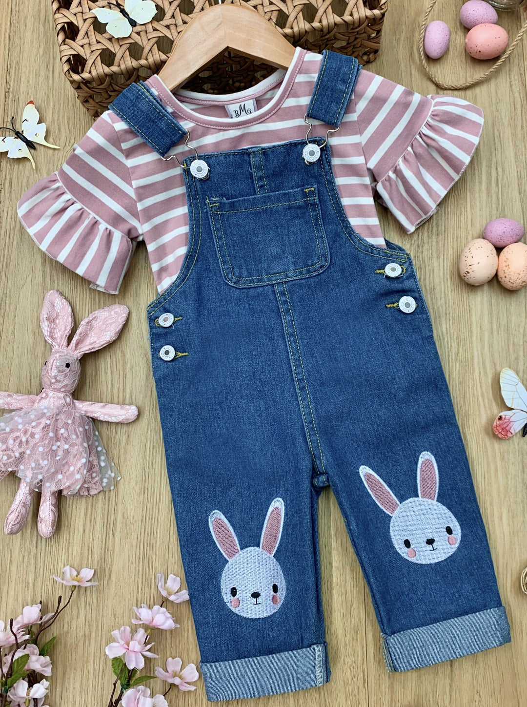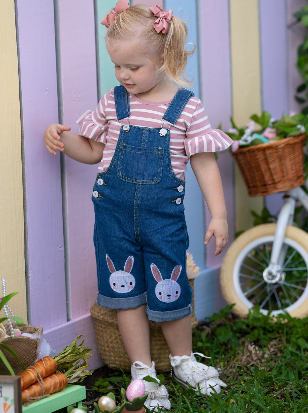 The set features a striped top with ruffled short sleeves and denim overall capris with bunny applique