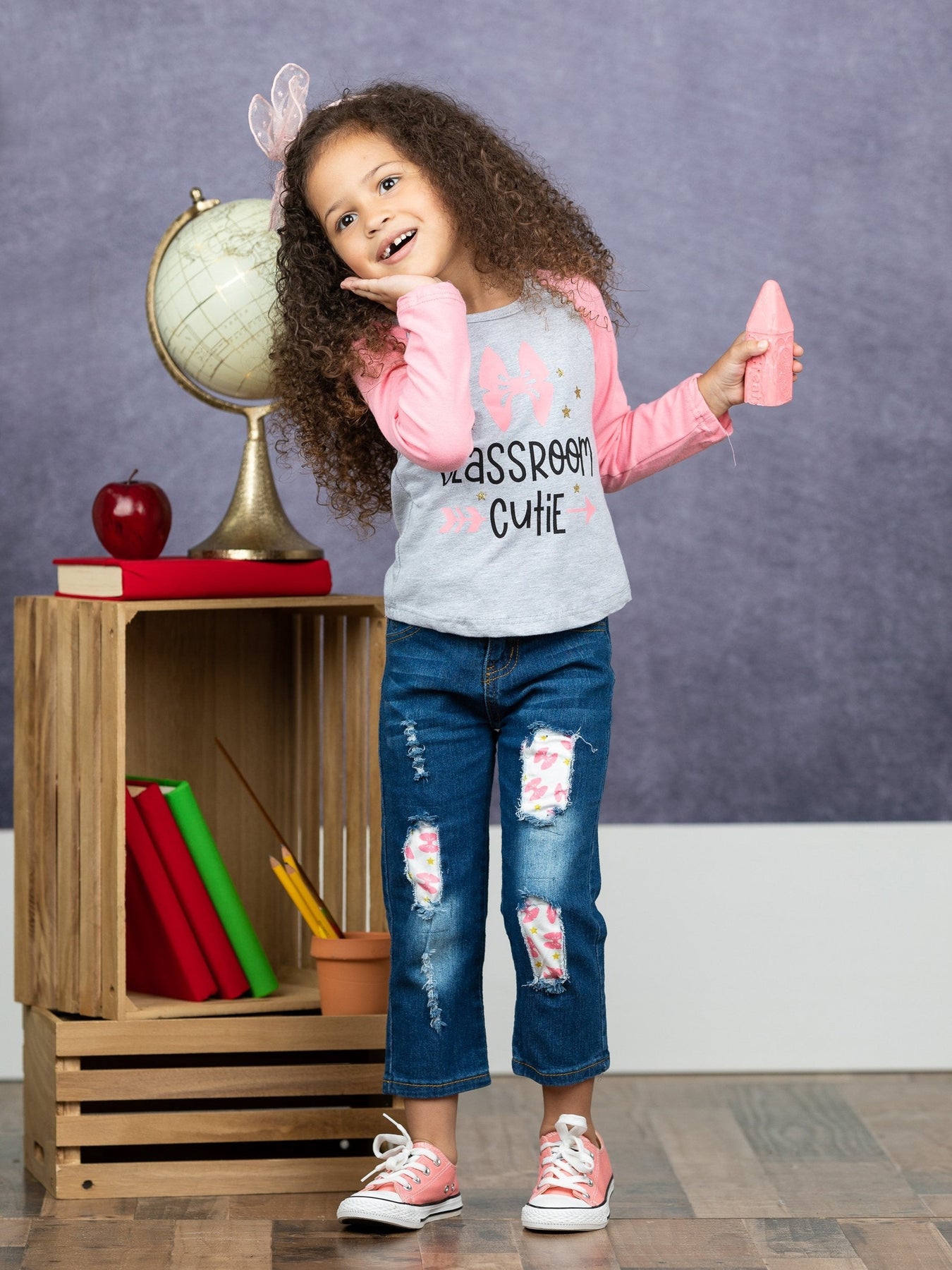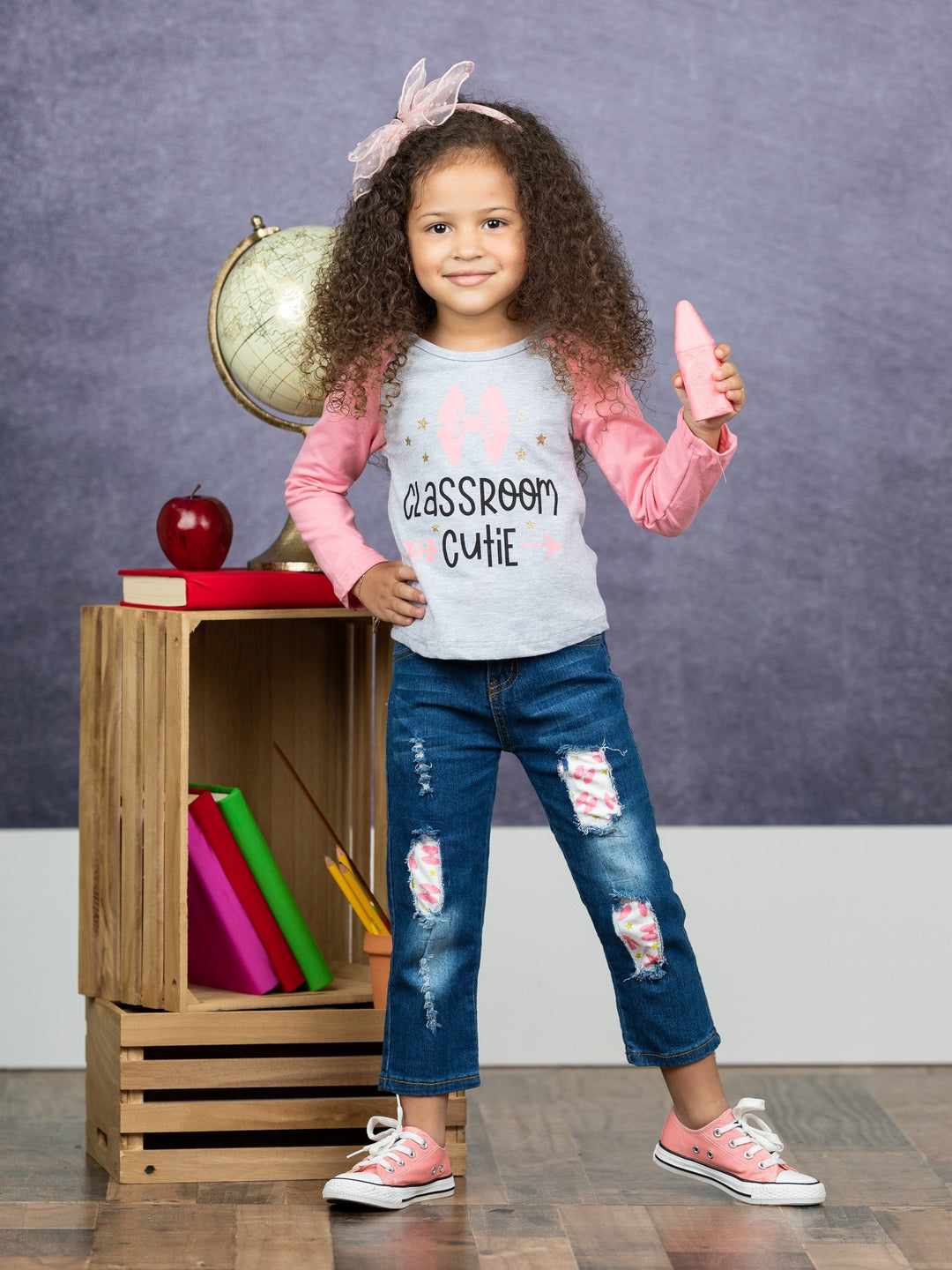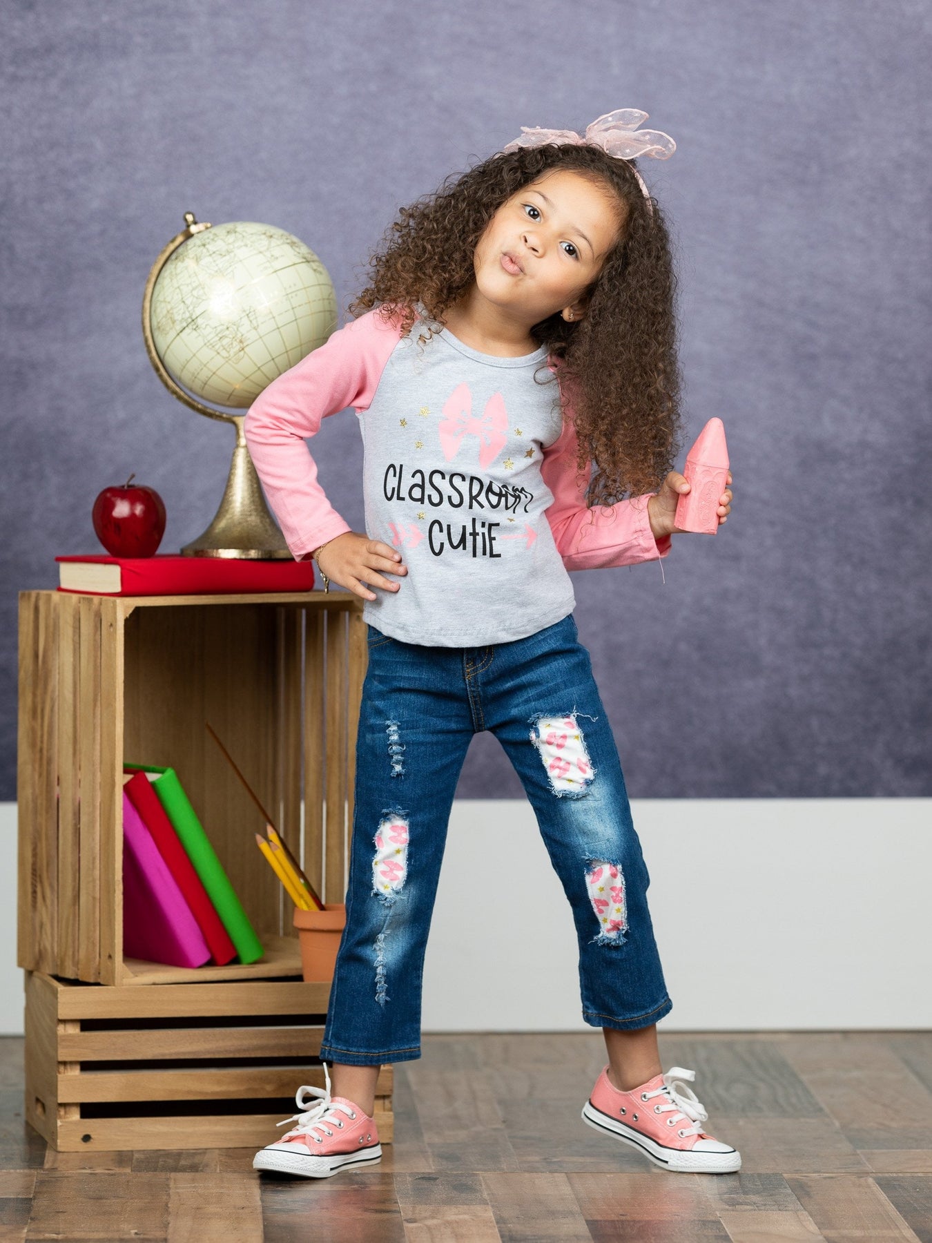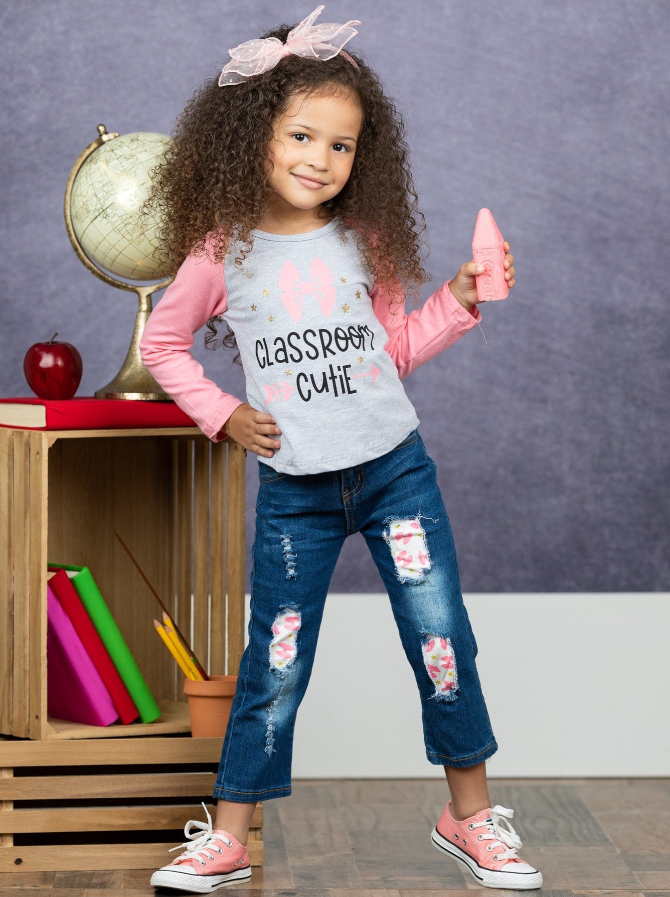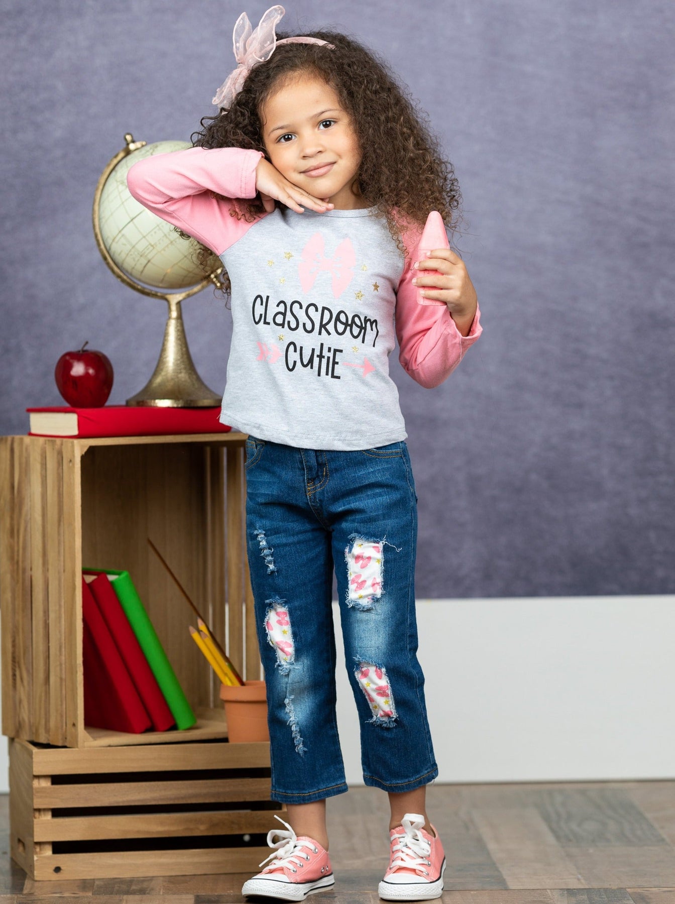 - Raglan-sleeve "Classroom Cutie" graphic top and patched jeans