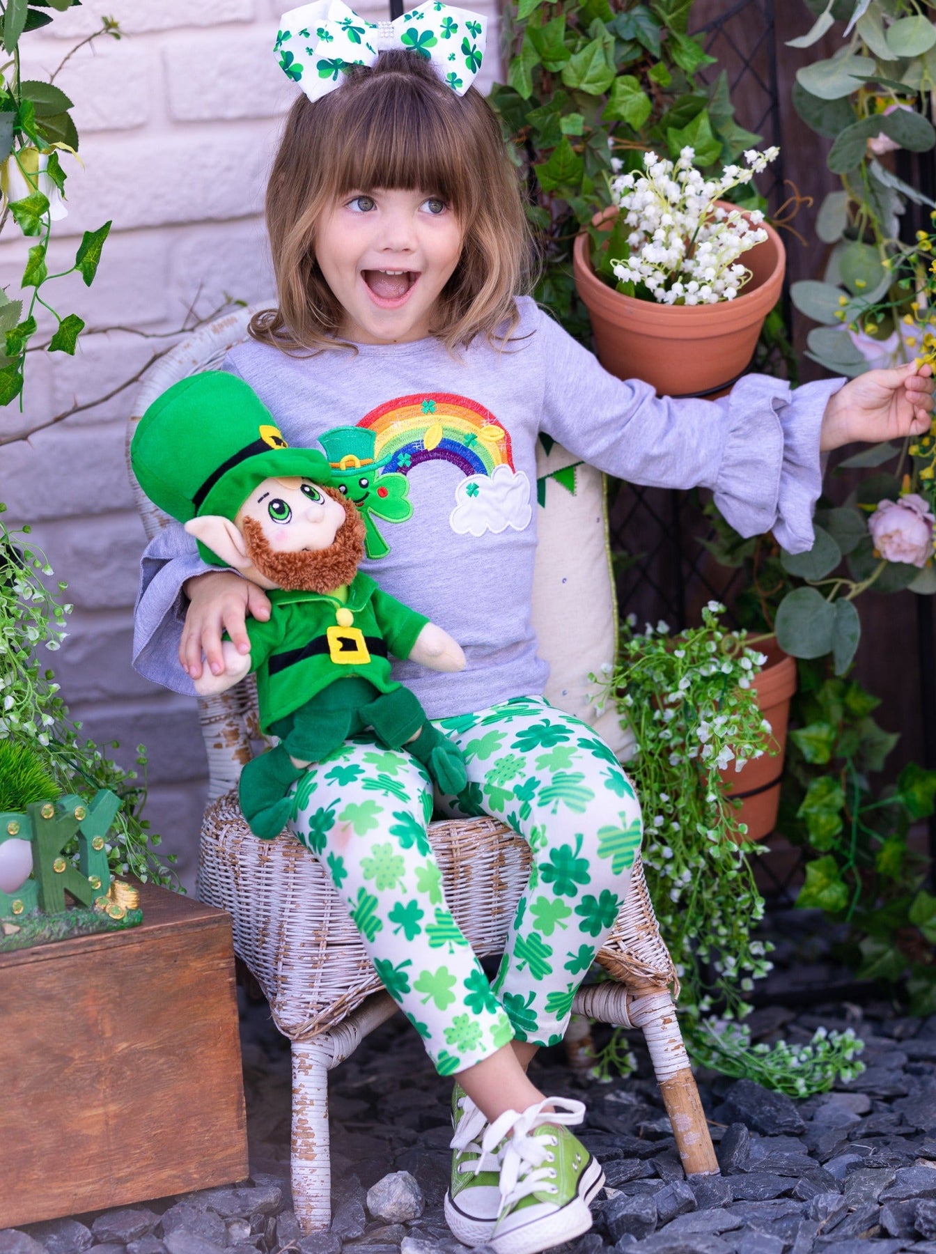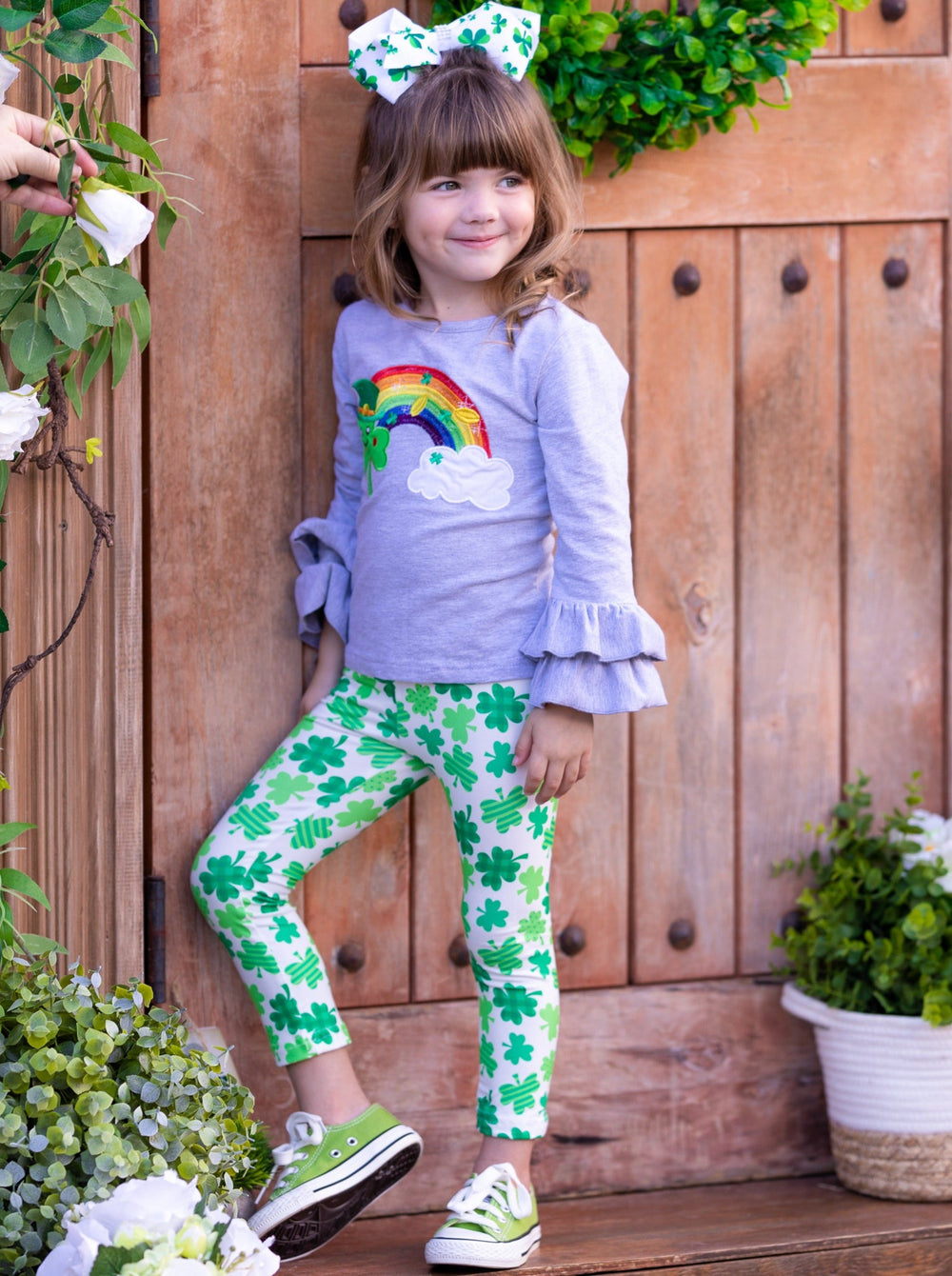 - Clovers, gold, and rainbows! What more could a sweet fashionista ask for in her St. Patrick's Day outfit? Soft to the touch, stretchy for all-day play, and covered in clovers, this ruffle cuff graphic top and all-over print leggings are as cute as can be for your lovely lass to wear to school, parties and parades.