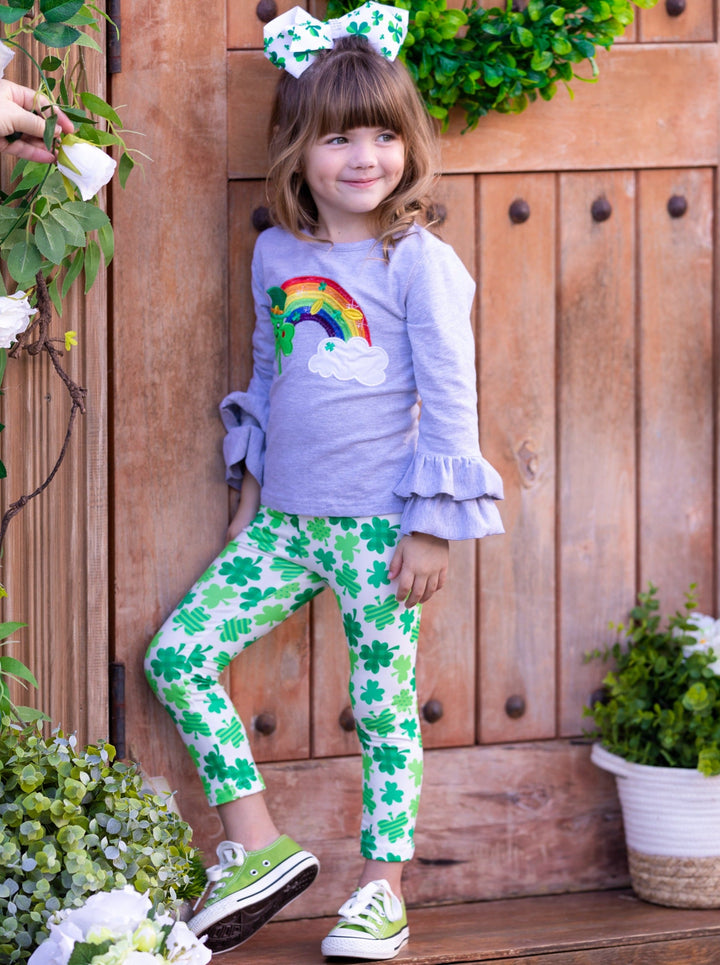 - Set features a long sleeve ruffle cuff top with a clover, rainbow, and gold coin design, and stretchy clover print leggings