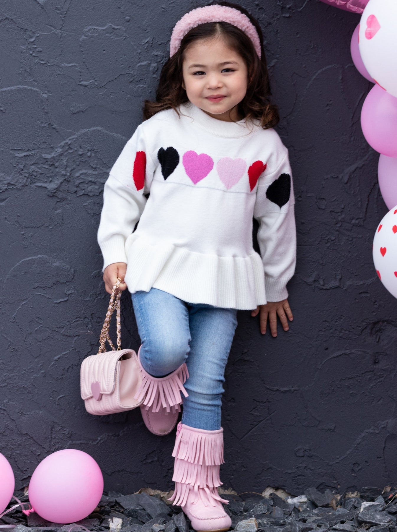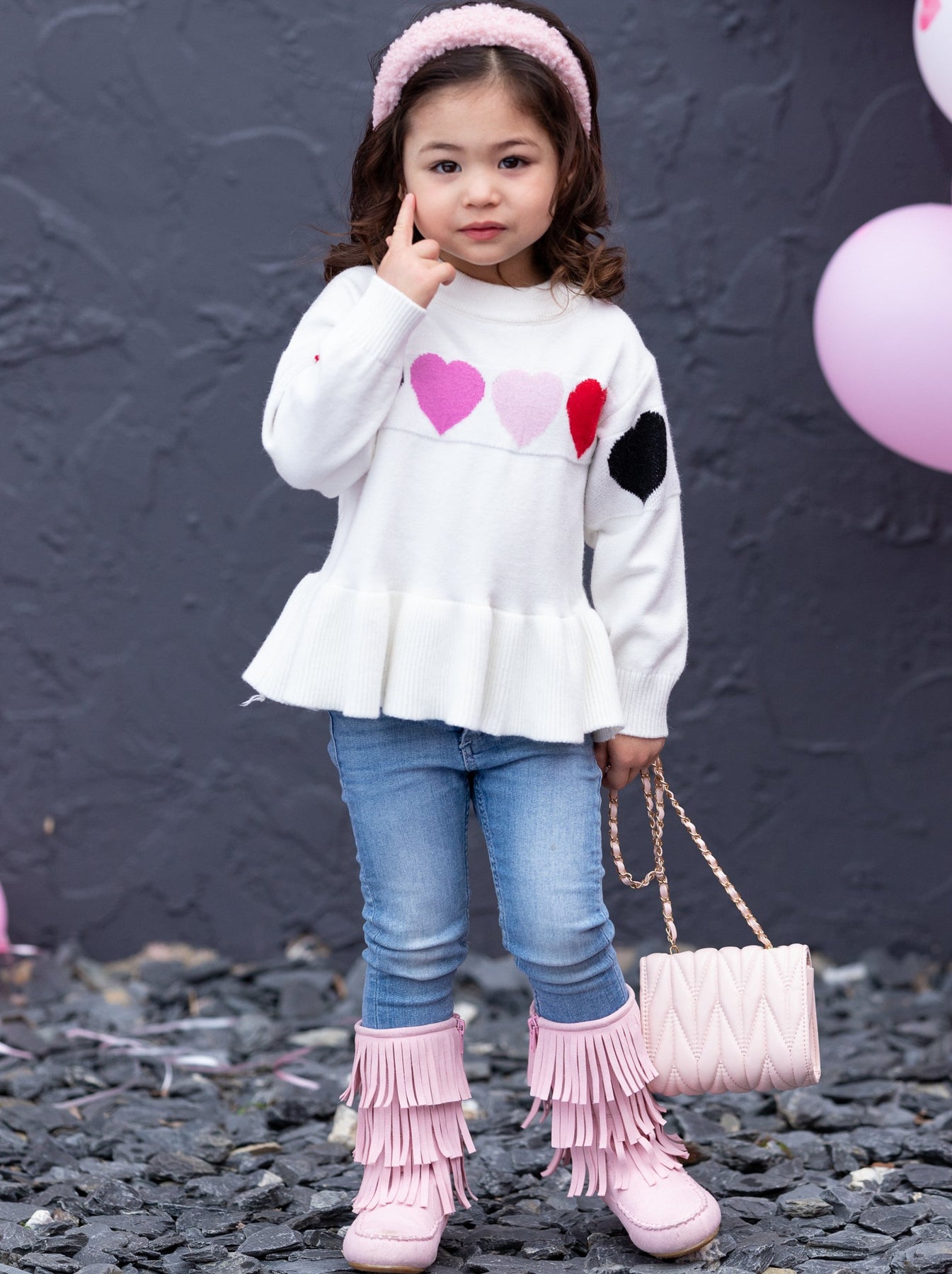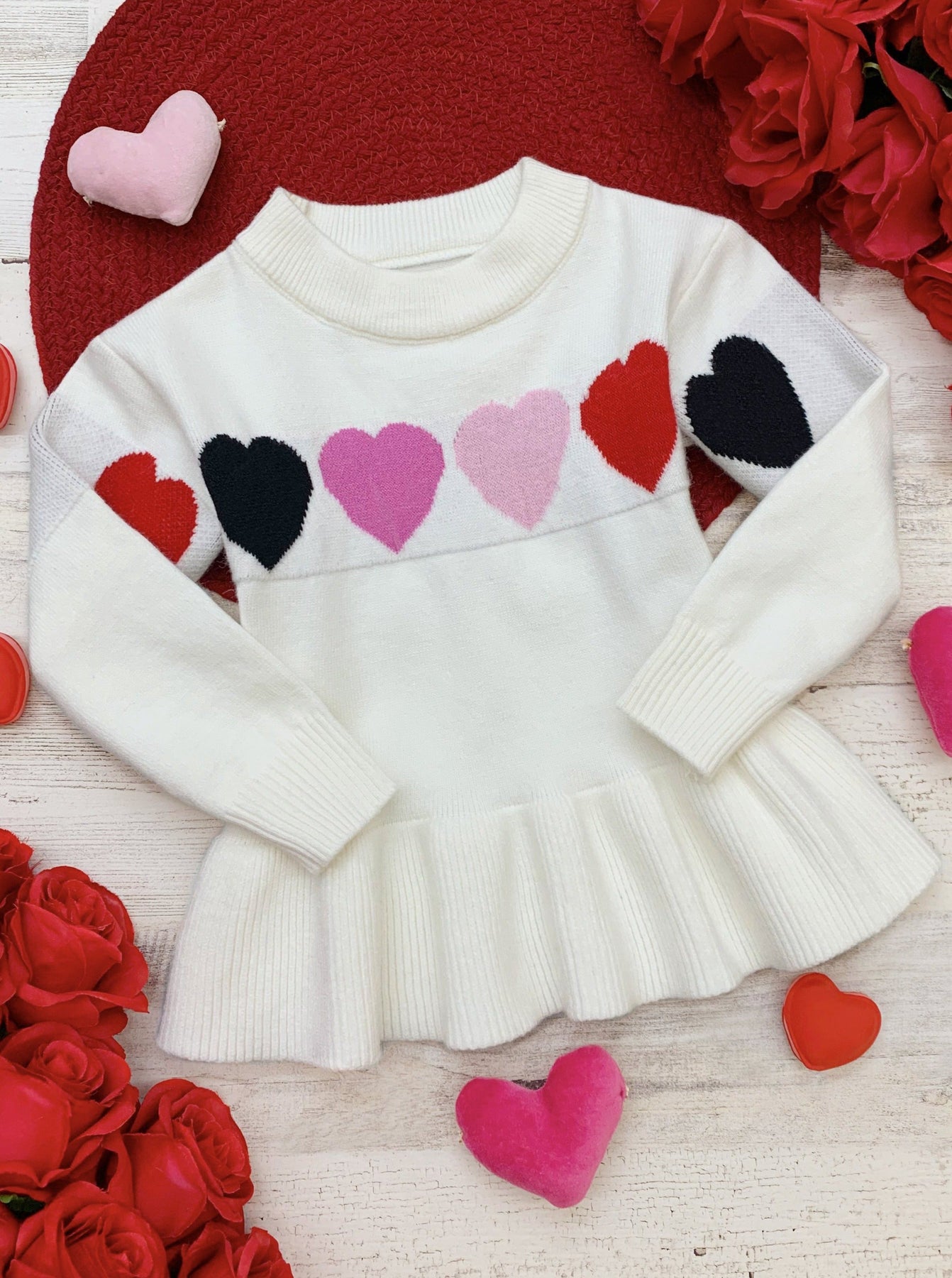 - Creme peplum knit sweater features cute colorful fuzzy hearts across the chest and sleeves