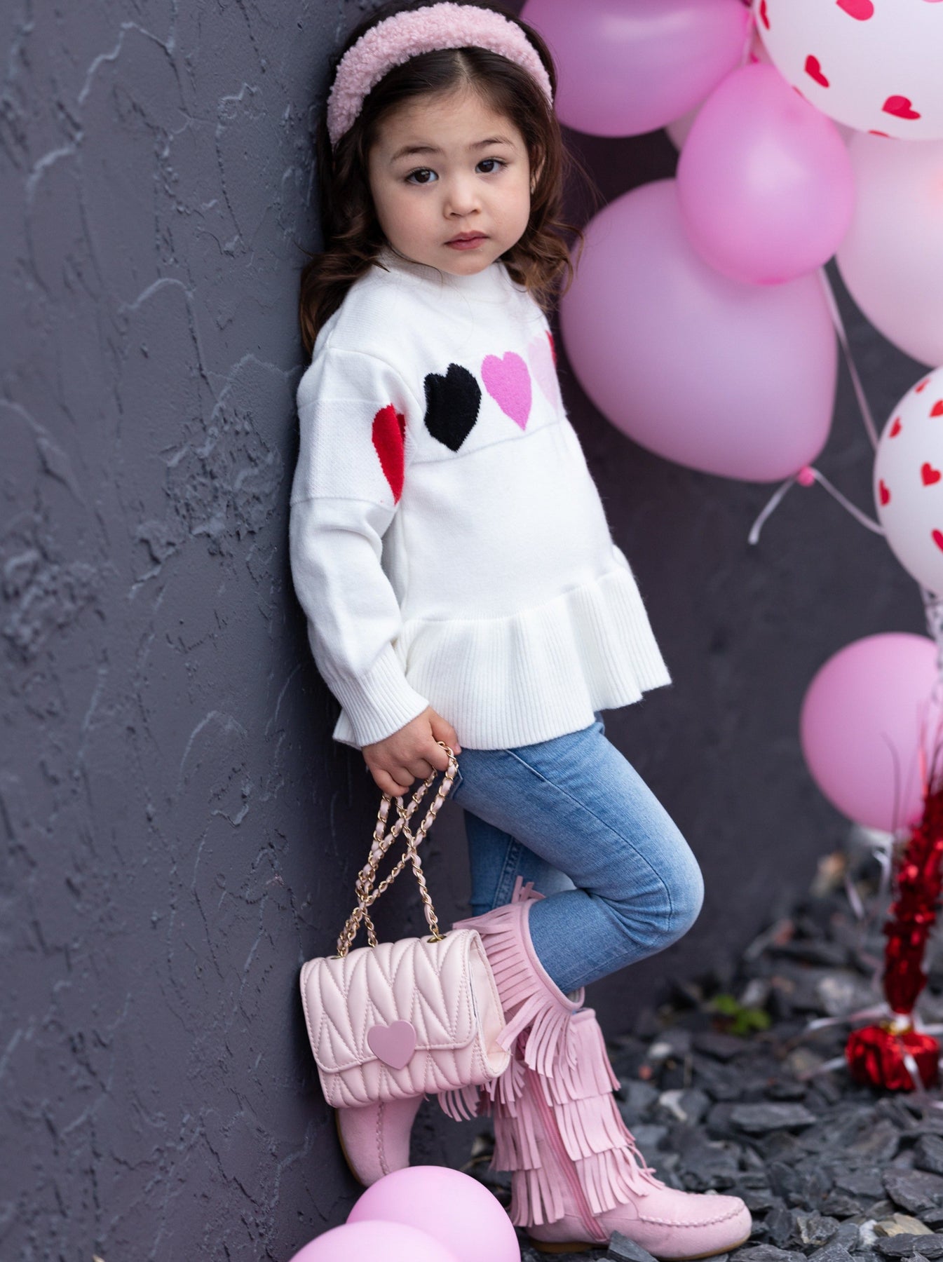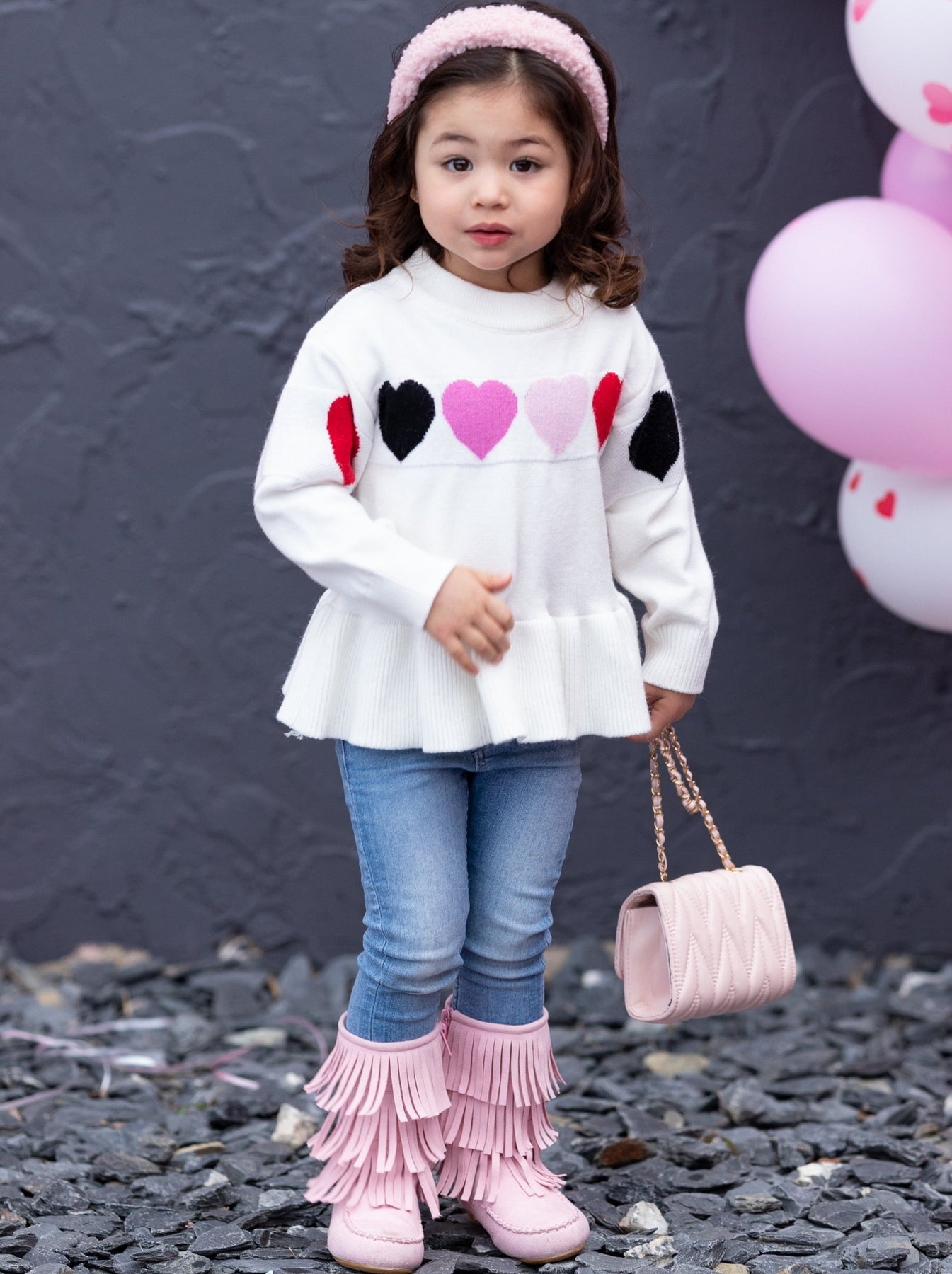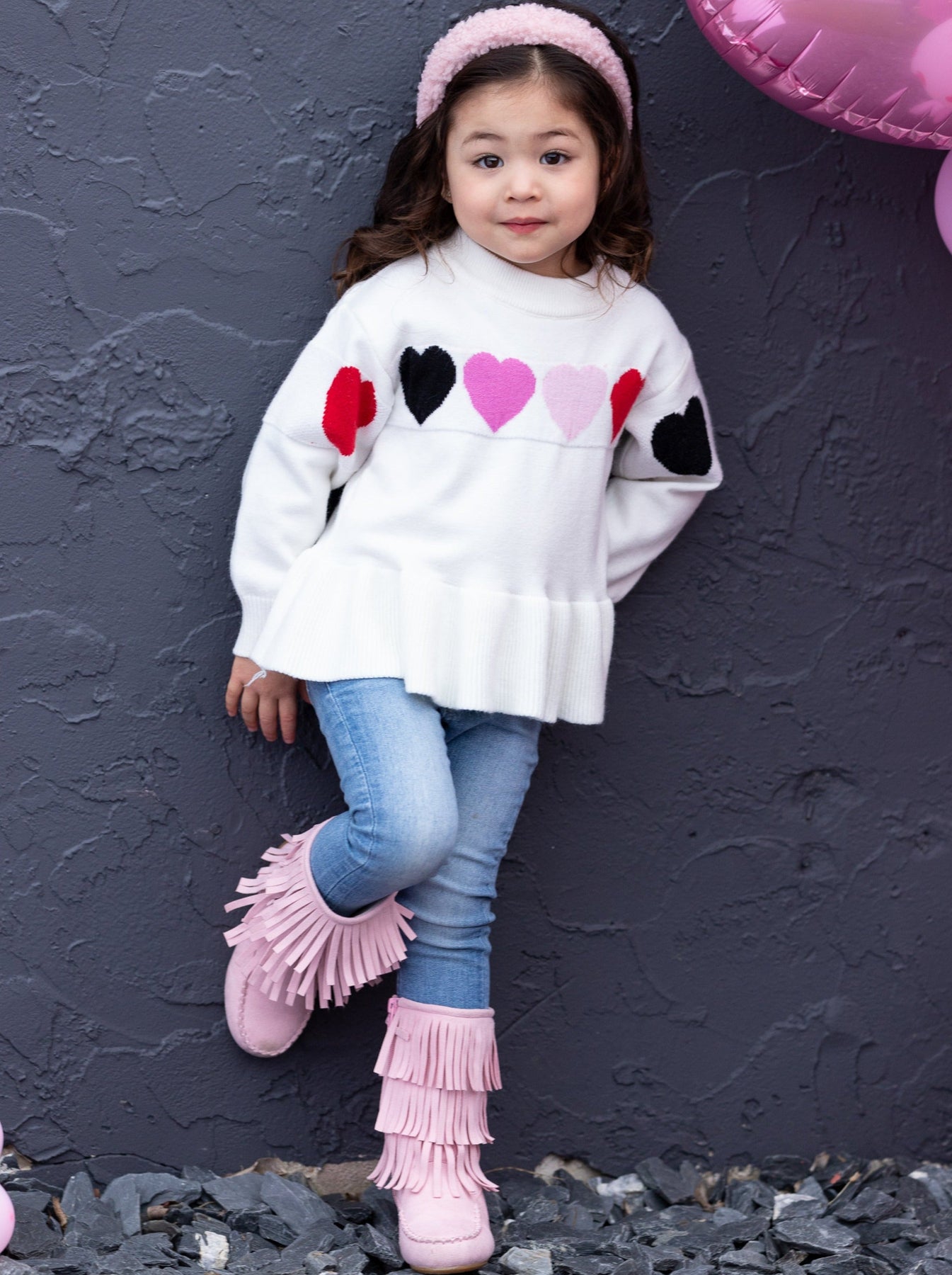 - Creme peplum knit sweater features cute colorful fuzzy hearts across the chest and sleeves