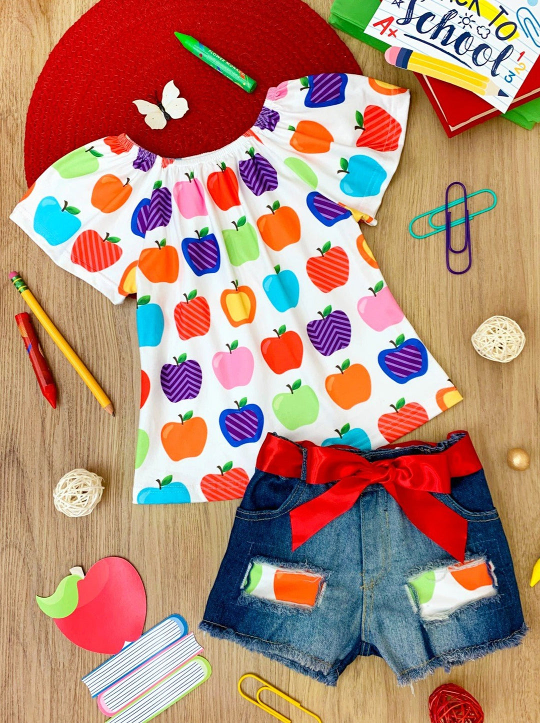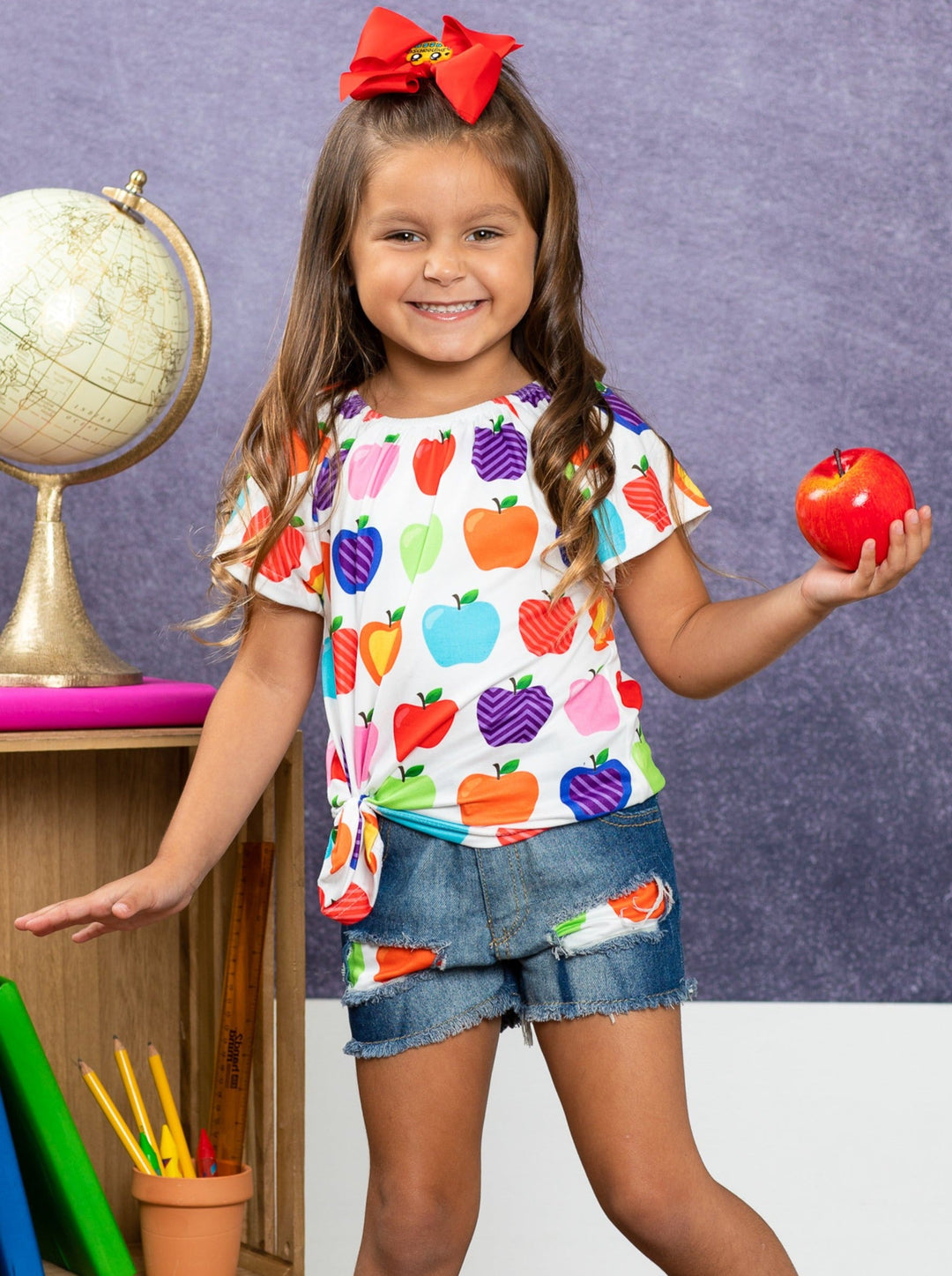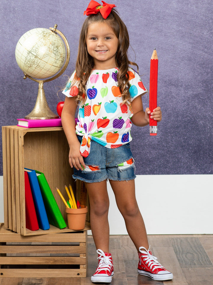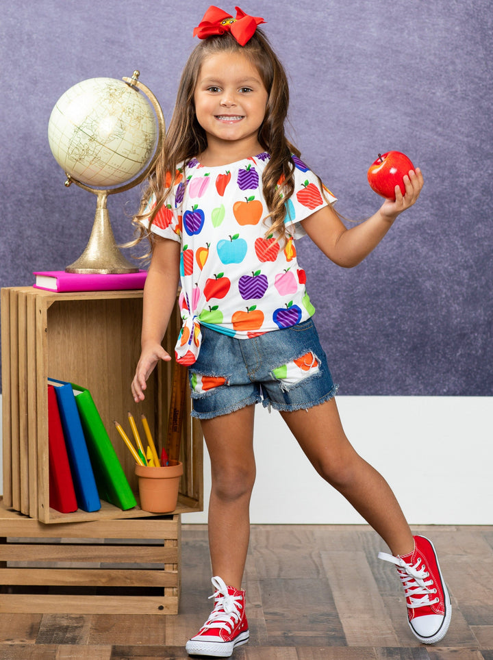 Let's learn in the cutest way possible! With this adorable apple top and patched denim short set, your little girl will impress her peers and teachers.
