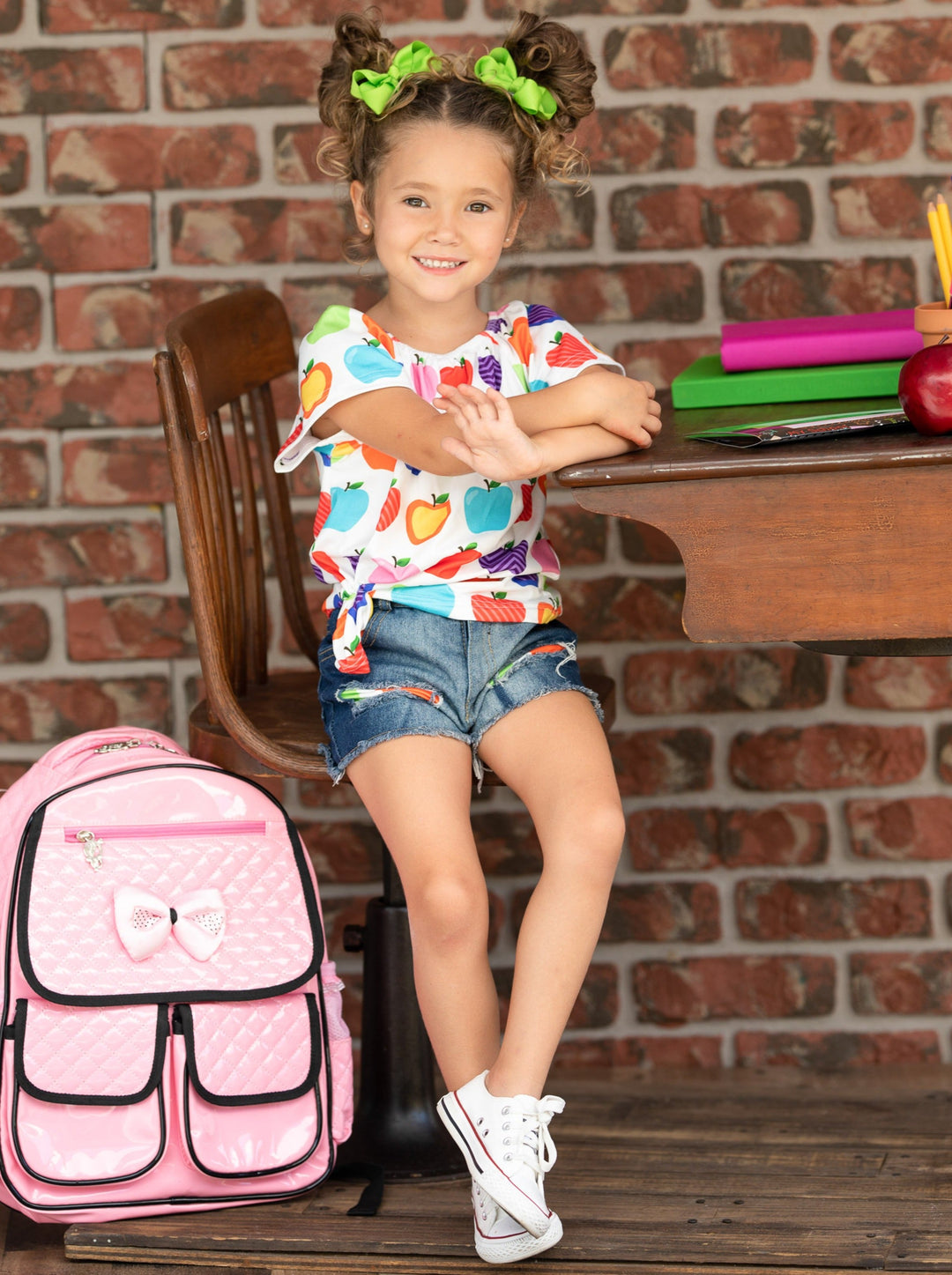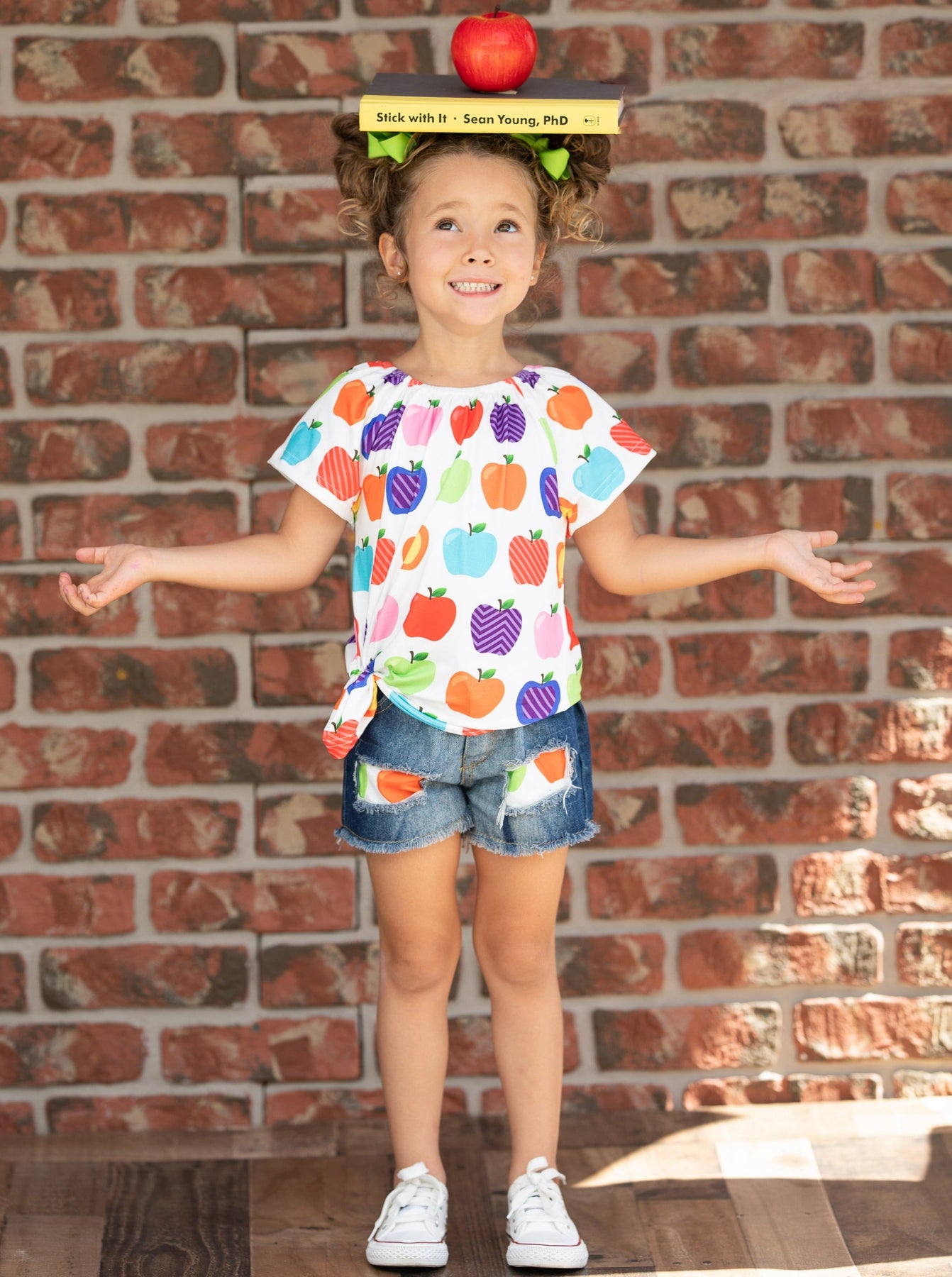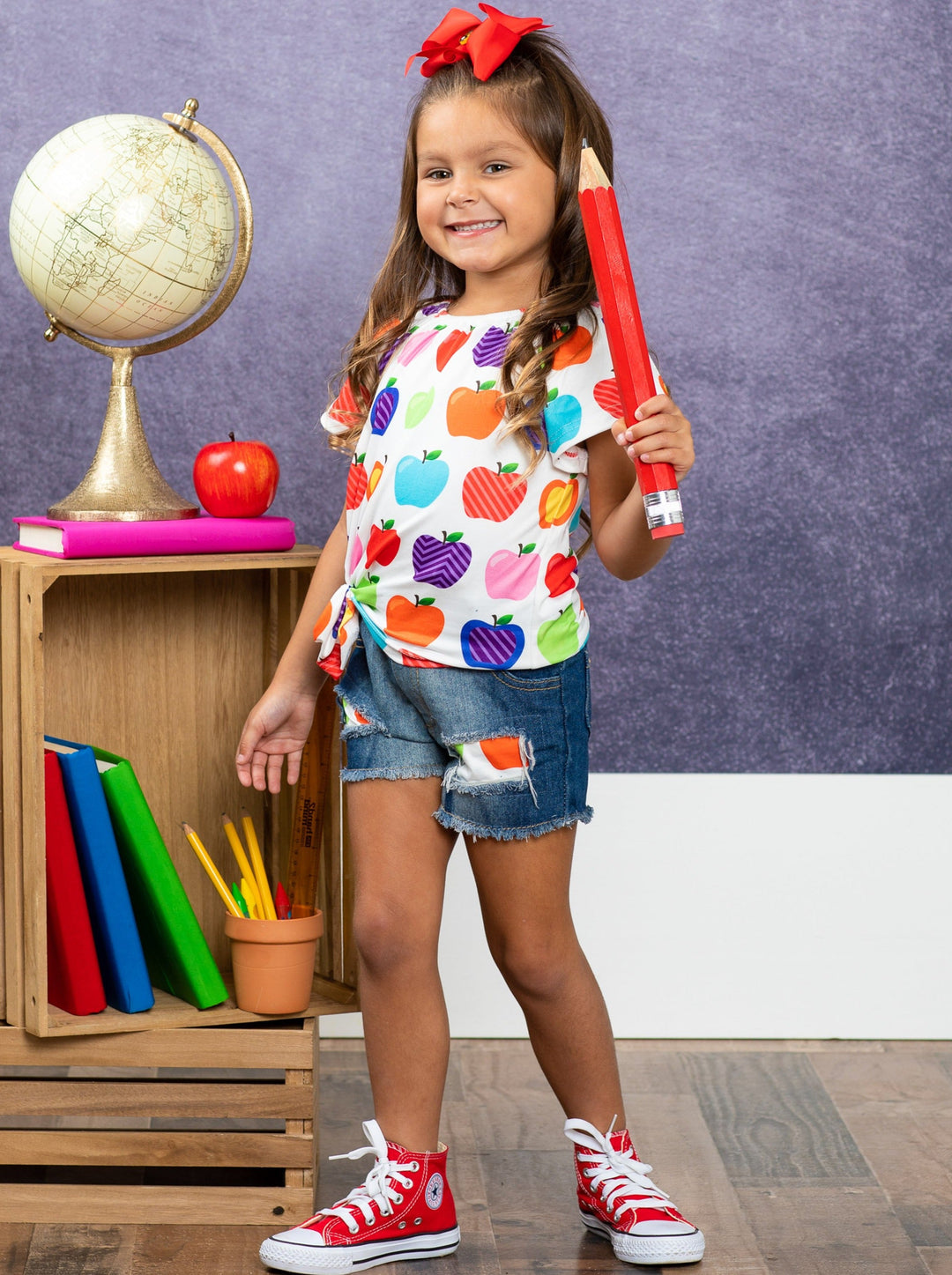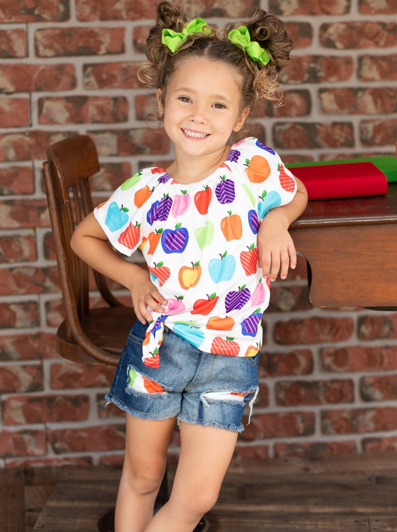 Let's learn in the cutest way possible! With this adorable apple top and patched denim short set, your little girl will impress her peers and teachers.