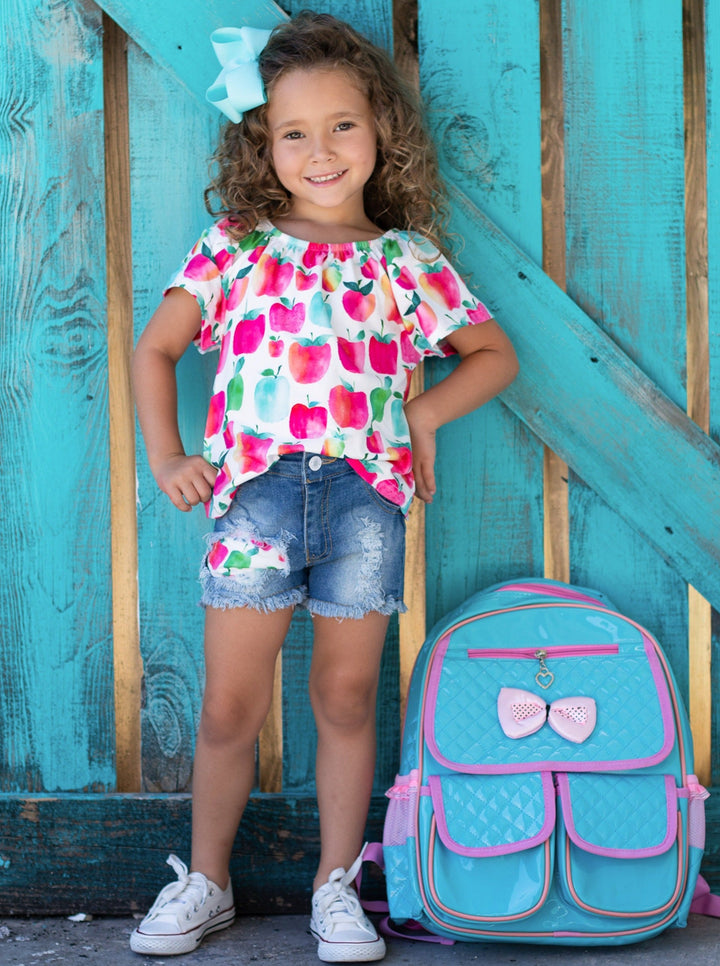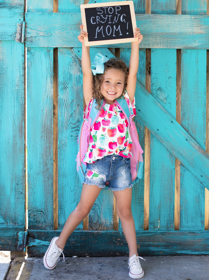 - When it comes to style, this denim short set understands the assignment! Covered in apples, this charming design is lightweight and perfect for days in the classroom. Super-soft and adorable to boot, it screams, "I'm ready for school!"