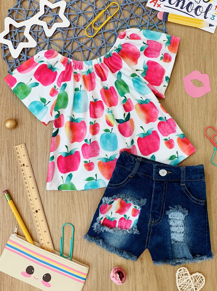 - Short-sleeve apple print top and matching patched denim shorts