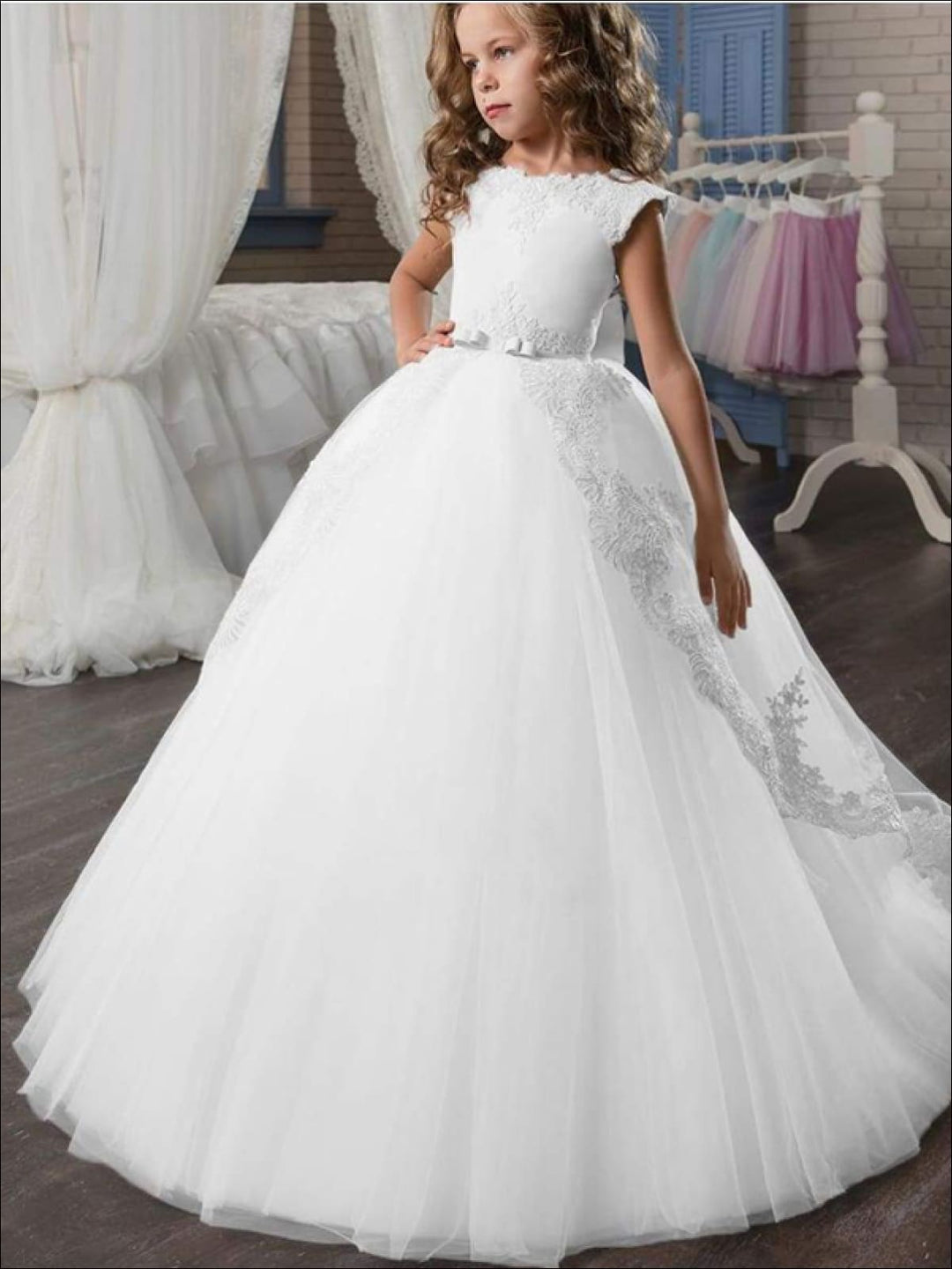 - Sleeveless V-back communion dress with lace details, full-length tulle outer skirt, and large waistband bow in back