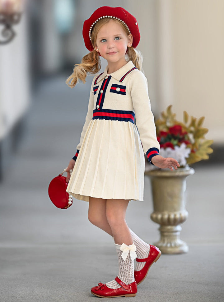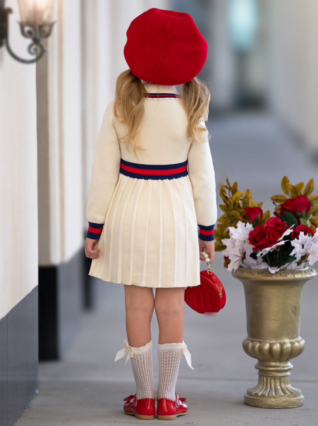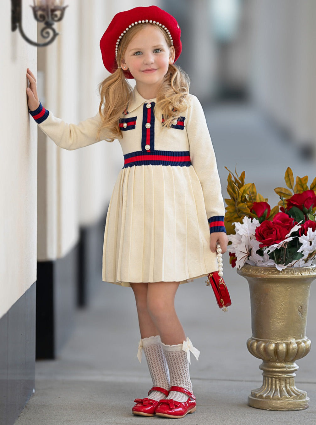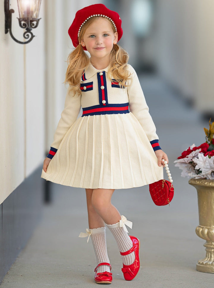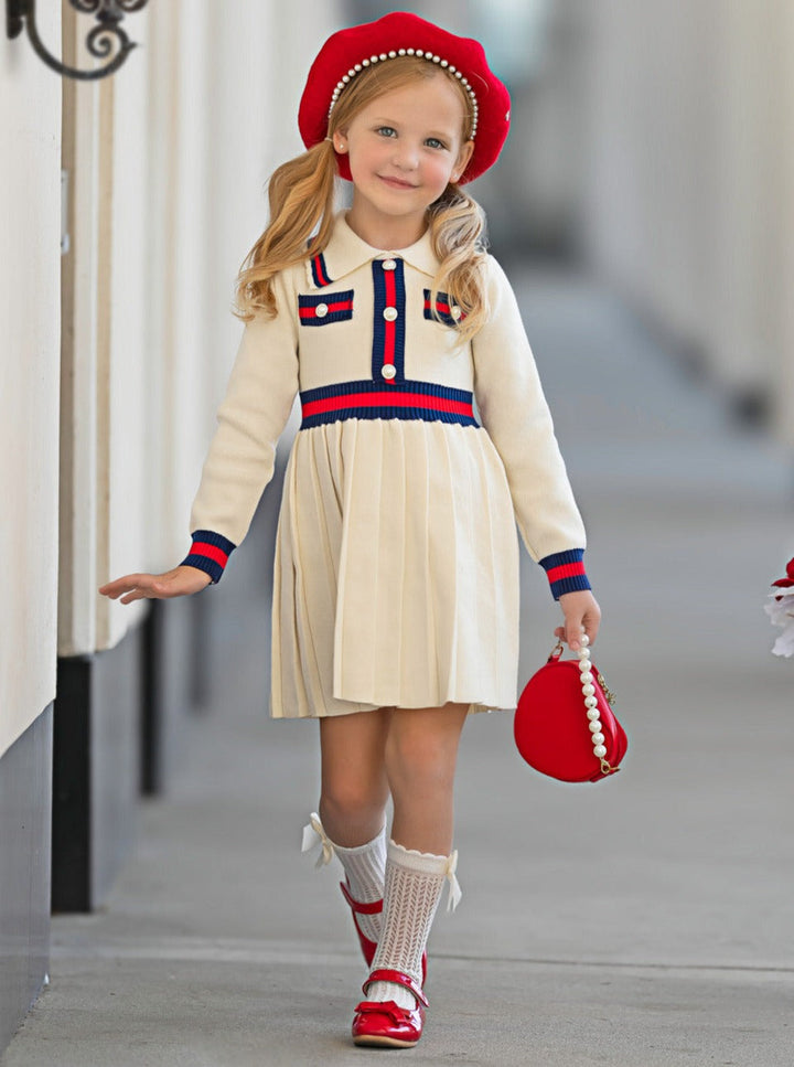 - The perfect combo of style and comfort! With our white knit sweater dress, your little one can stay cozy while looking extra fashionable too. Striped details and a fun, pleated skirt make sure she nails the preppy-chic look so effortlessly!