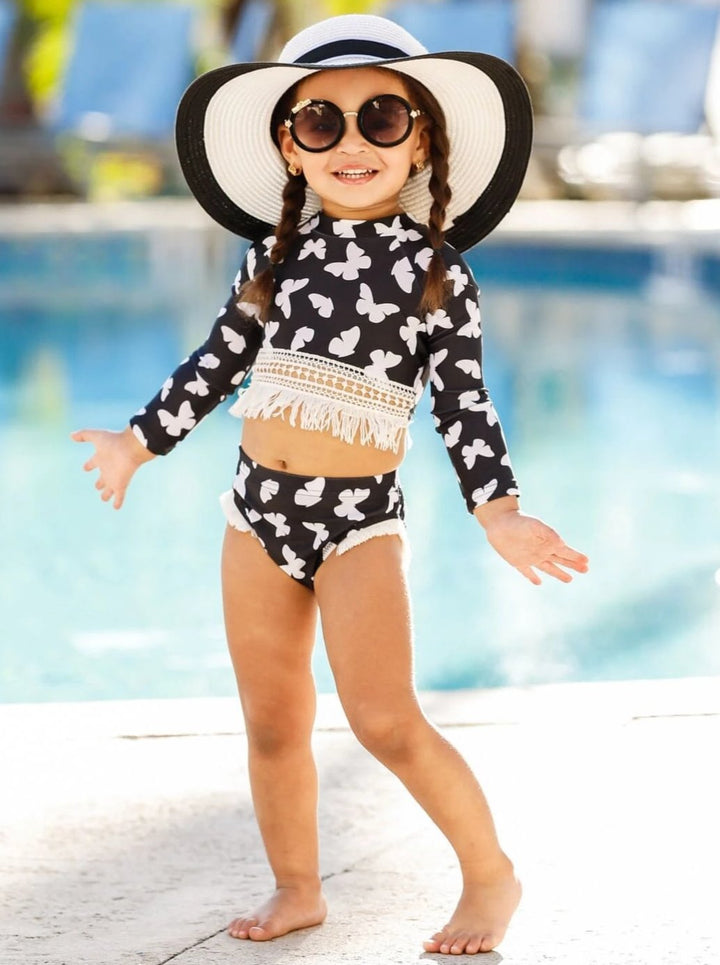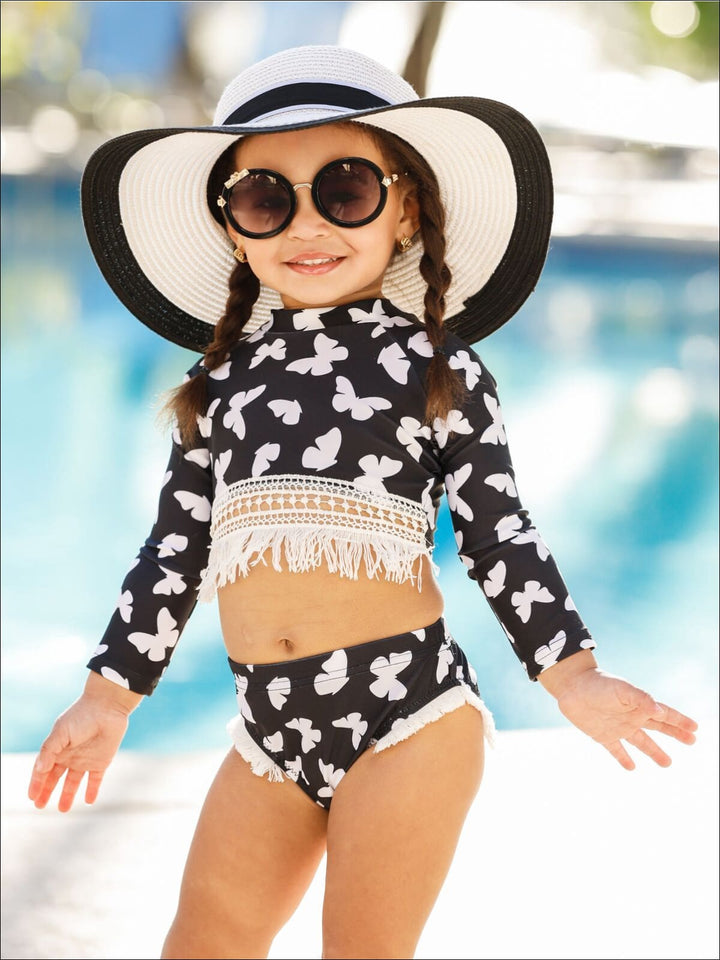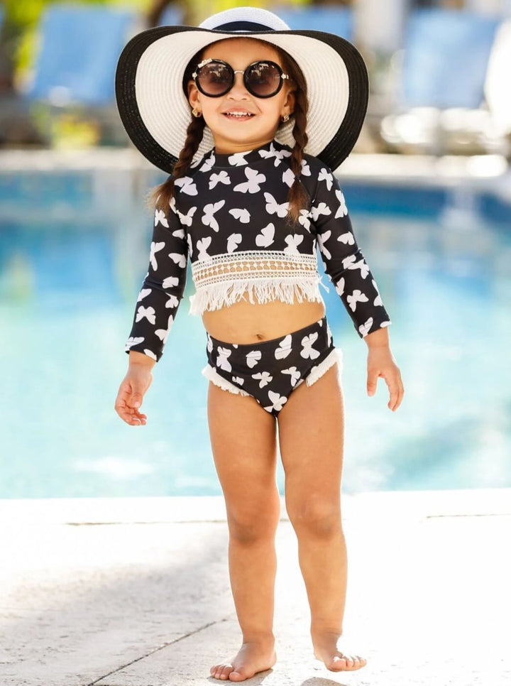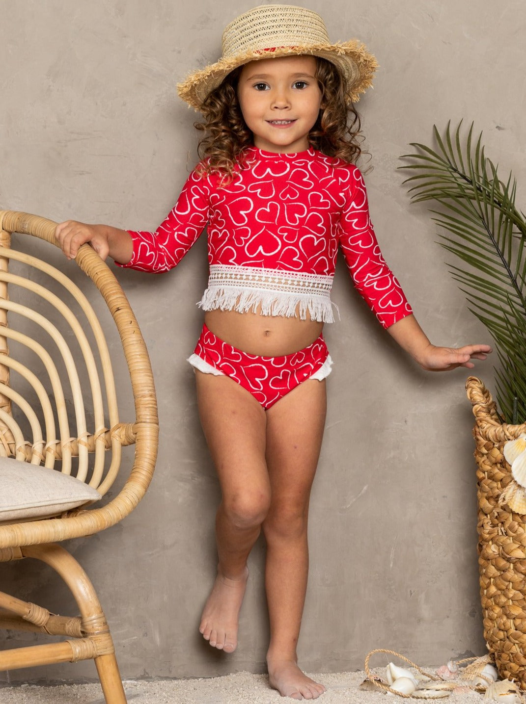 Two-piece rash guard swimsuit features long sleeve top with crochet fringe hem and matching bottoms with ruffle trim