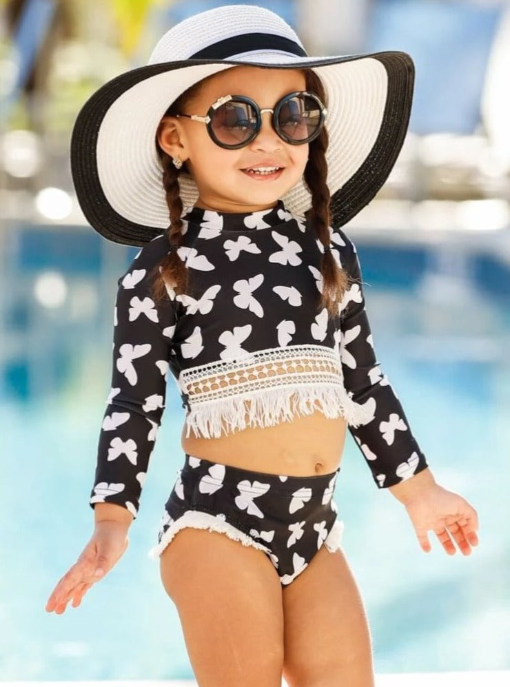 Add a sophisticated splash to her poolside picks with this two-piece rash guard swimsuit fashioned with a fun graphic print and crochet fringe to elevate her look and give her coverage when she needs it!