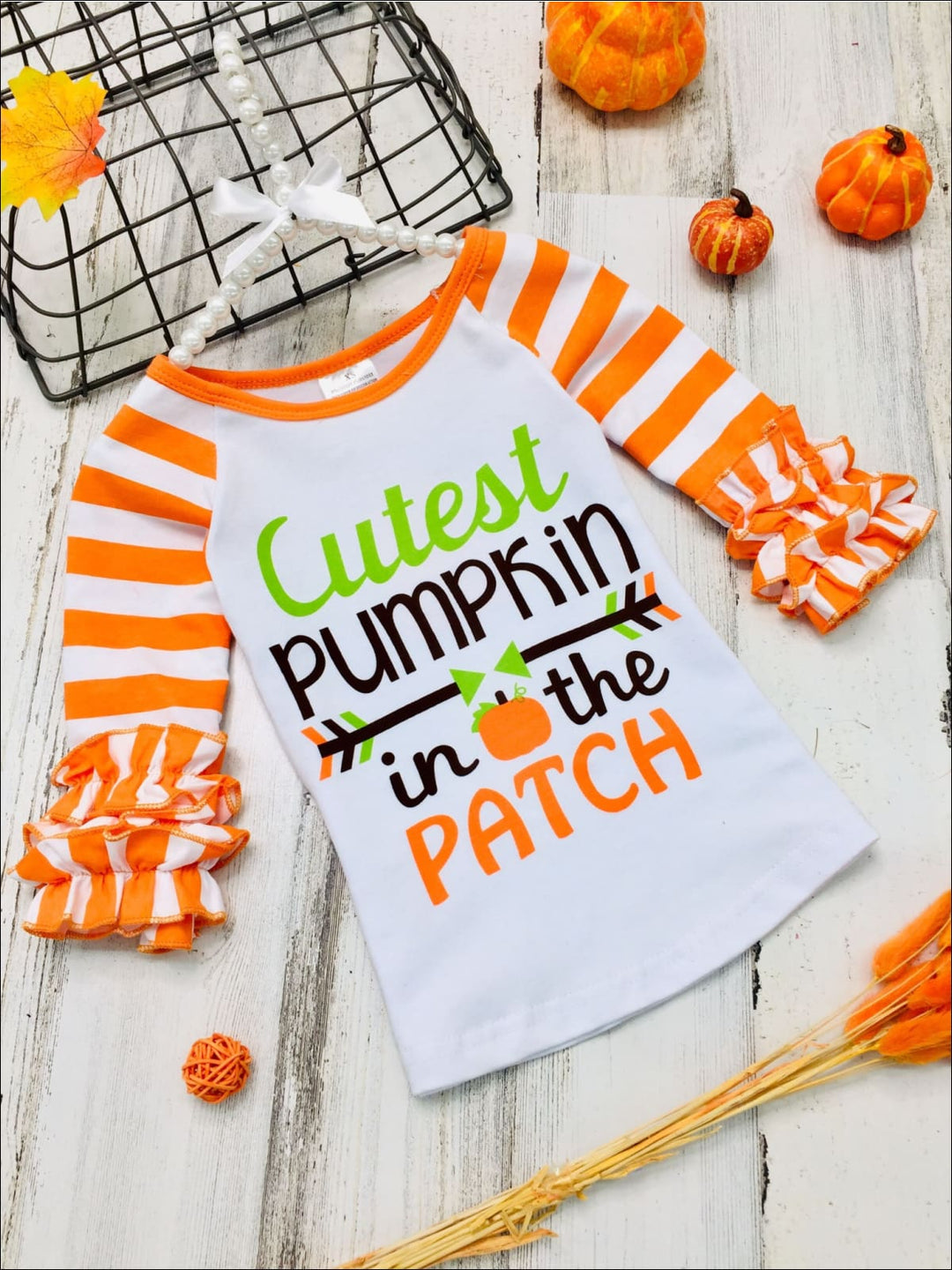 Girls "Cutest Pumpkin in the Patch" Long Striped Ruffled Raglan Sleeve Top