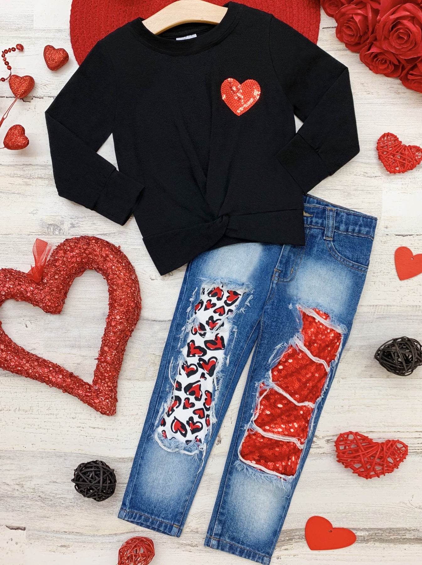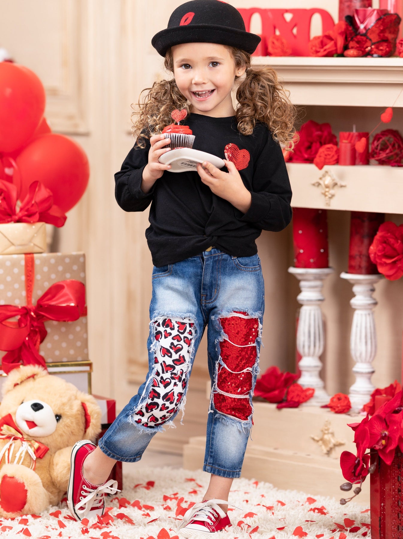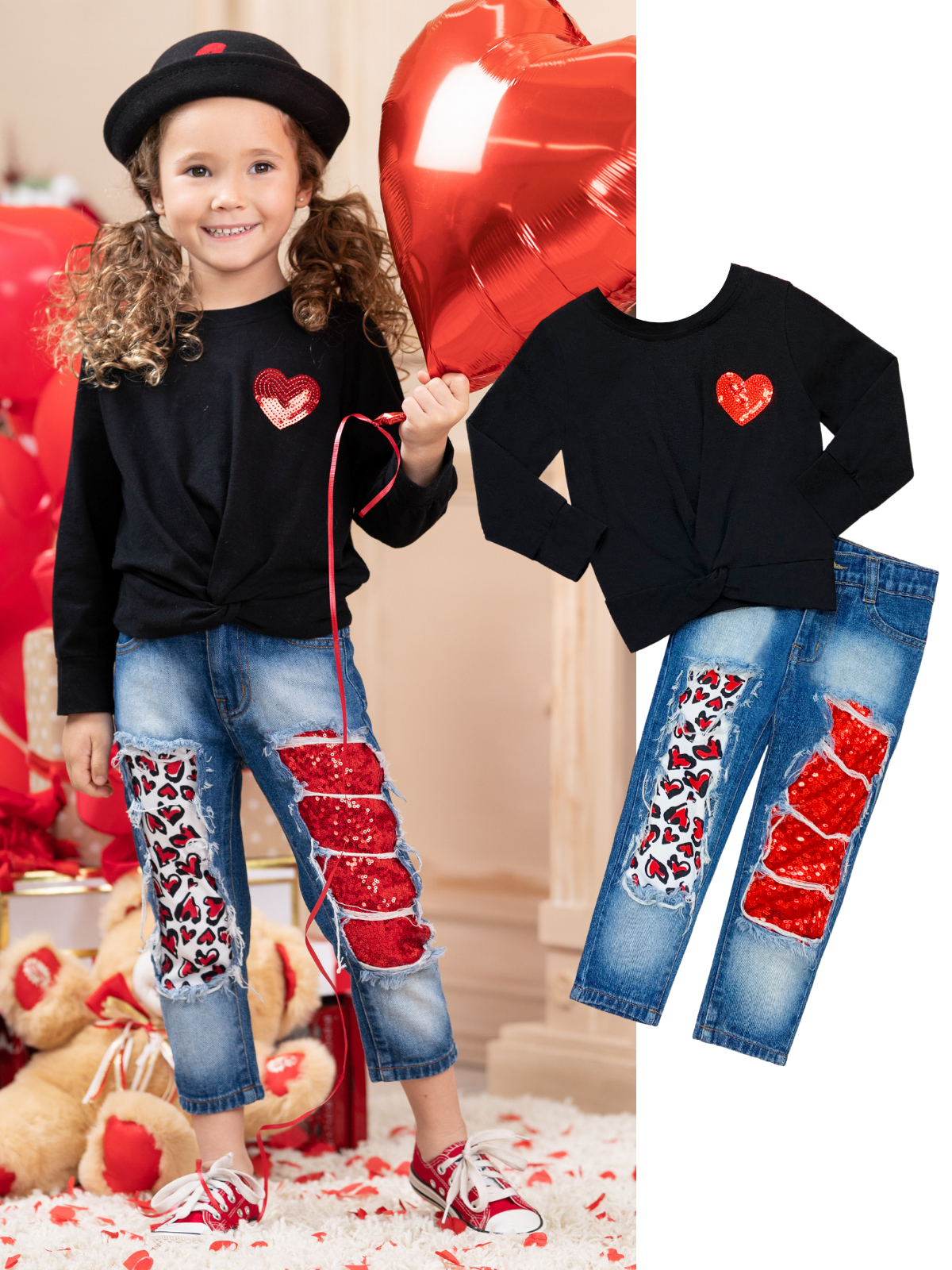 Long-sleeve knot-hem top with a sequin heart applique and heart print and sequin patched denim jeans