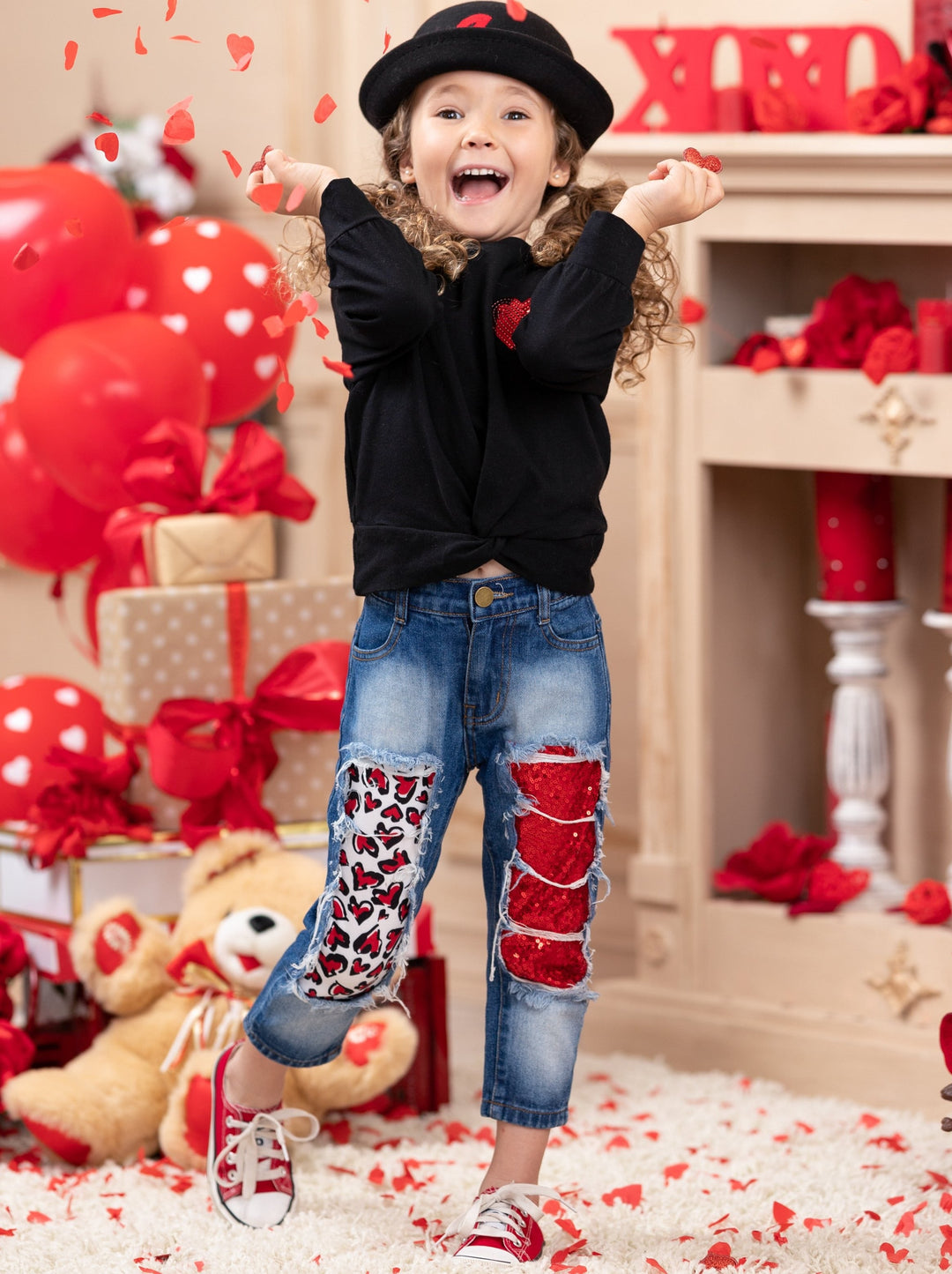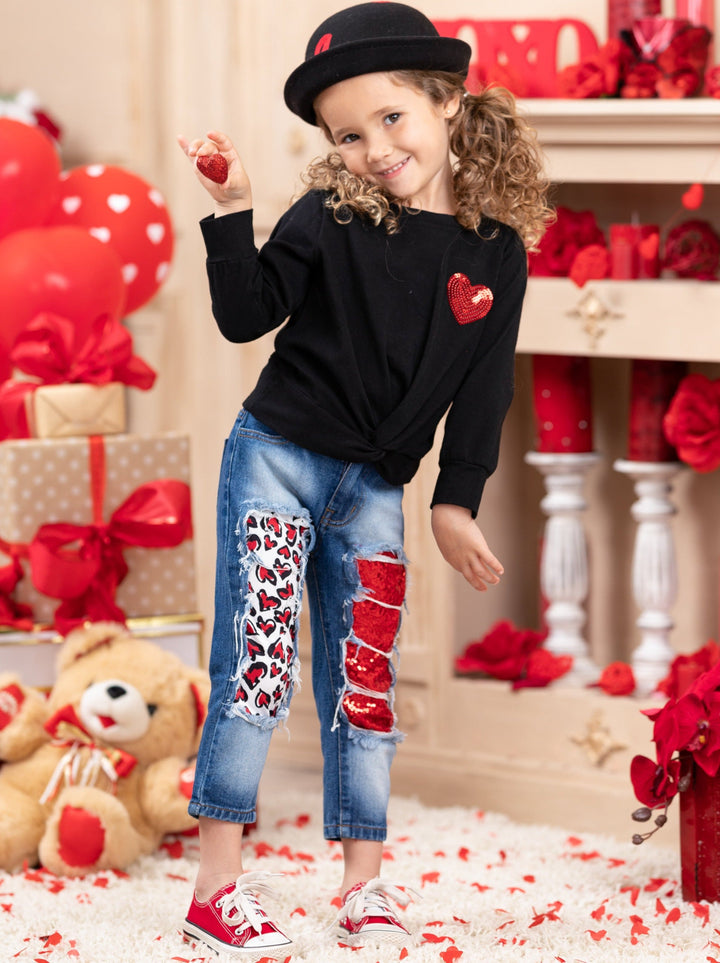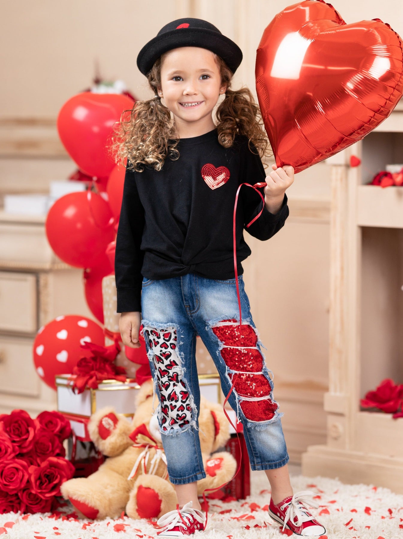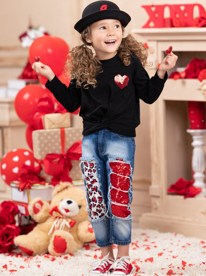 Long-sleeve knot-hem top with a sequin heart applique and heart print and sequin patched denim jeans