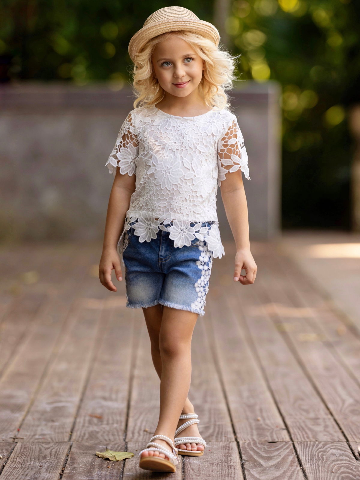 • Her love of lace doesn't have to leave with her Winter clothes. Now she can sport cute lacey fashion statements all Spring long with our floral eyelet top and lined denim shorts set. Lightweight and comfy for all-day play!