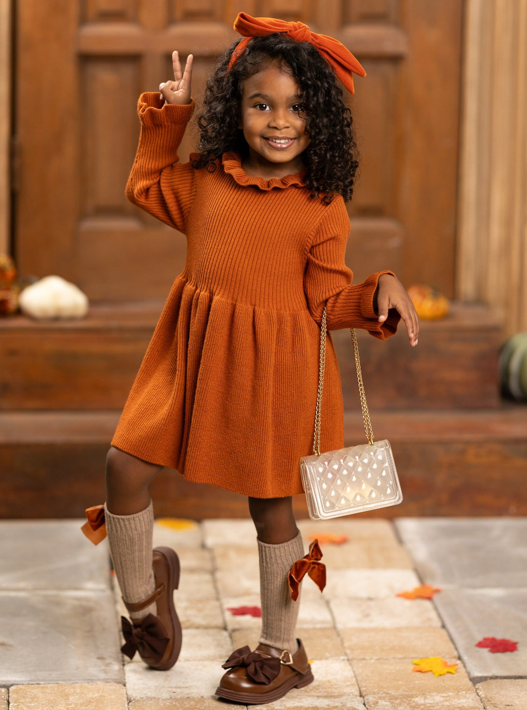 - Made for cozy fall days, our brown knit sweater dress will treat your little one to luxurious comfort. Decorated with ruffle neck details for a dose of charm that will surely make her even more adorable. Time to snuggle up!