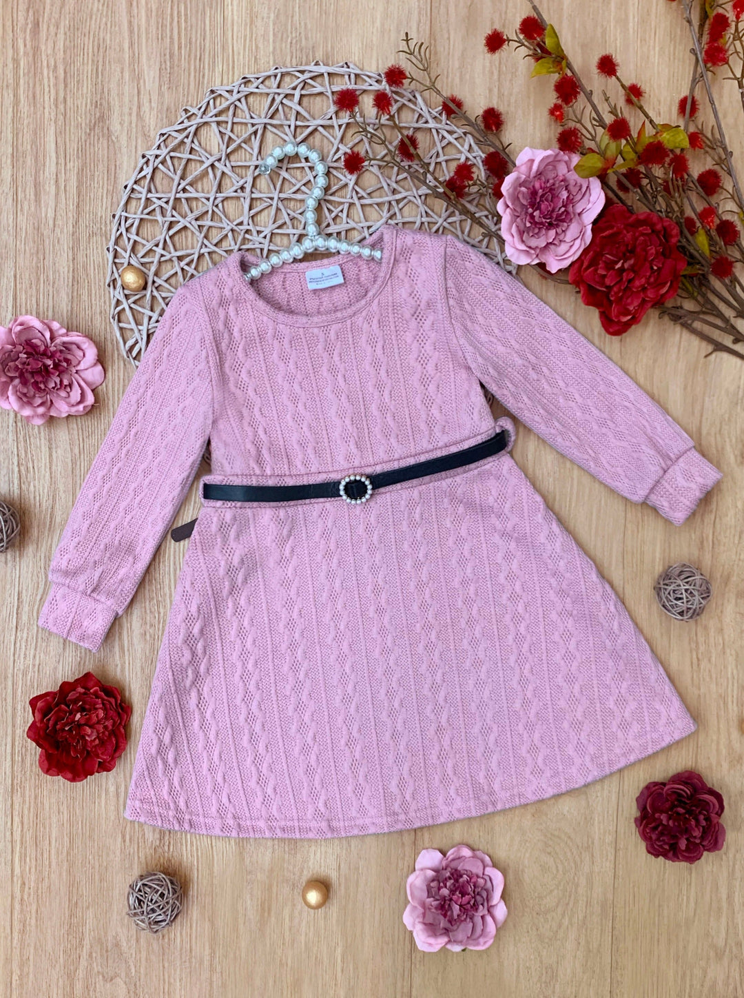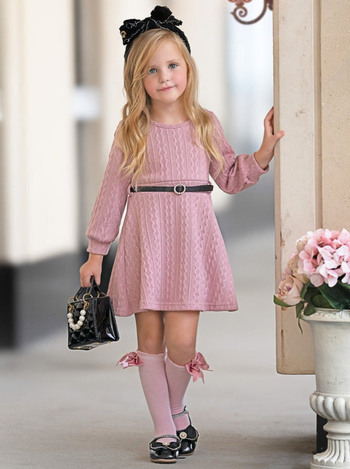 Pretty in Pink Cable Knit Belted Sweater Dress