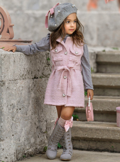 Forever Chic Grey Turtleneck and Belted Pink Tweed Shacket Dress Set