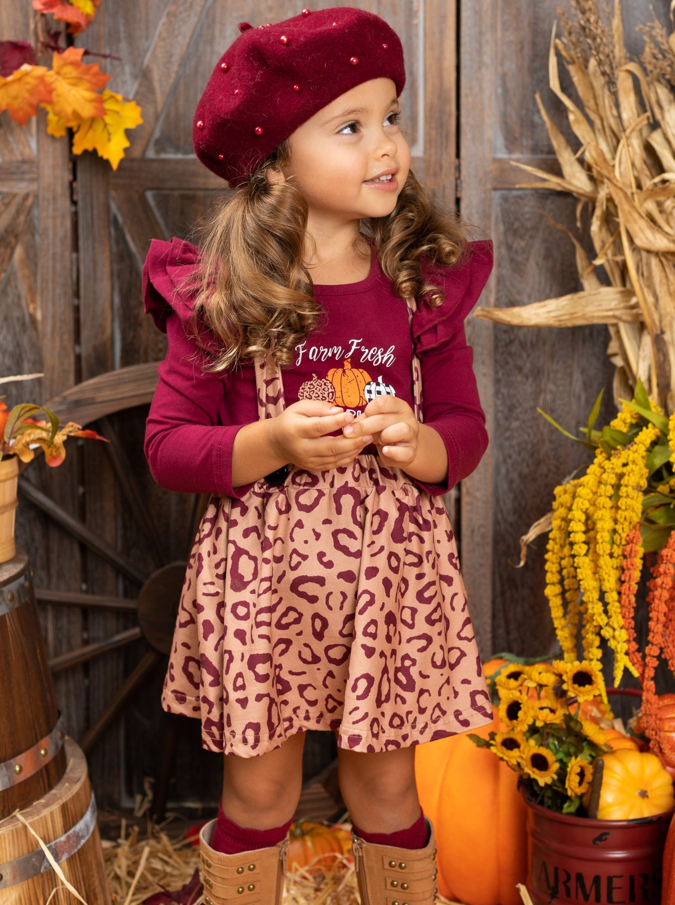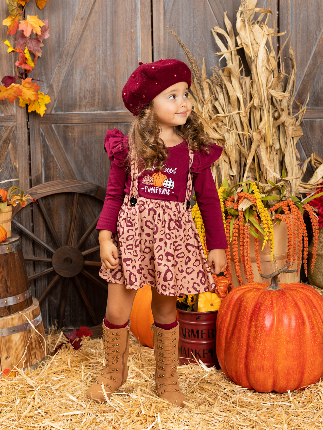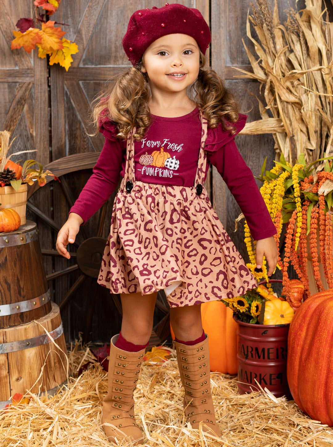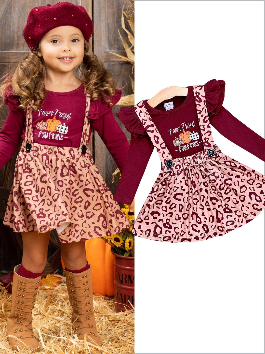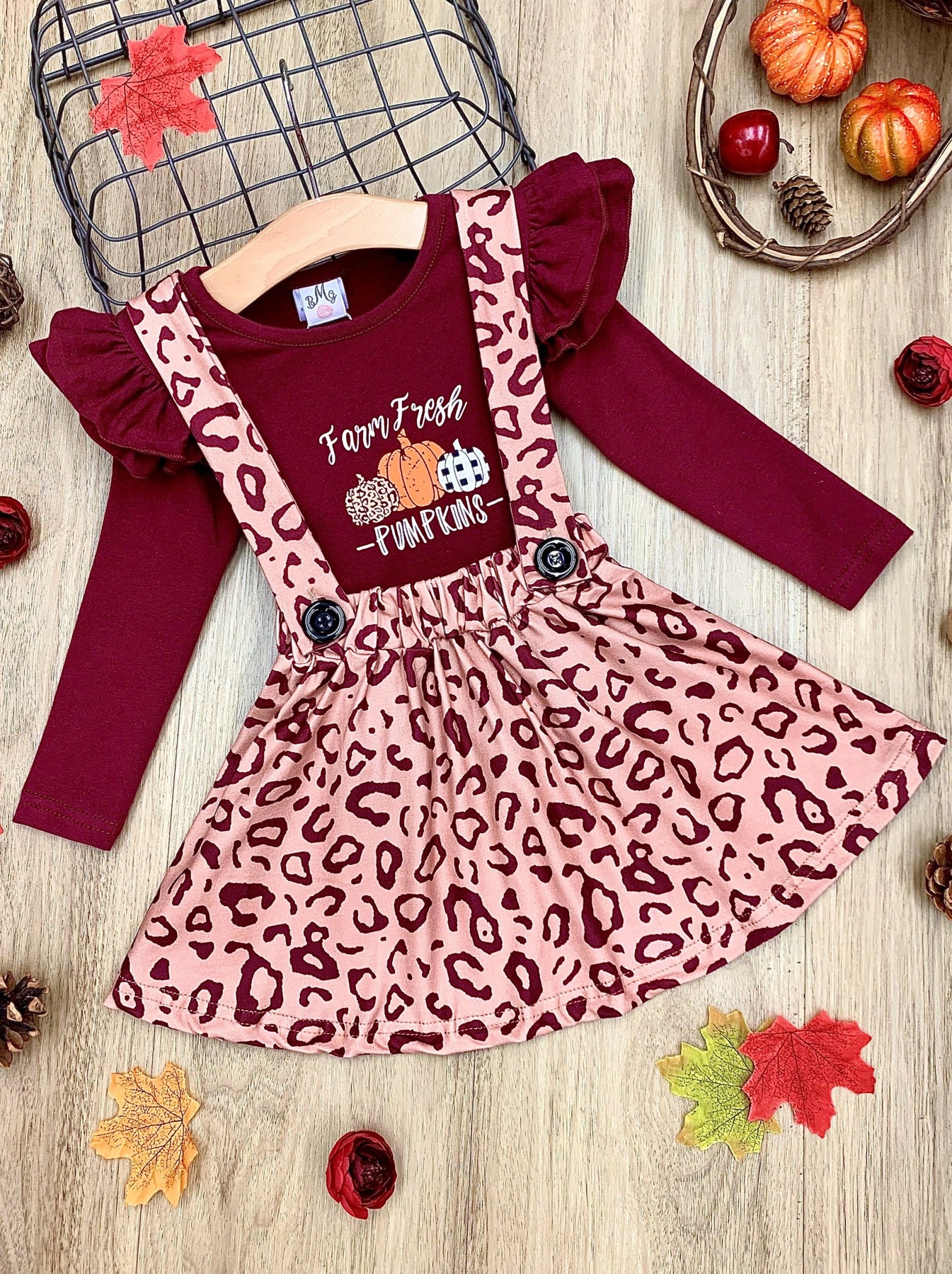 Long-sleeved "Farm Fresh Pumpkins" graphic top with ruffle shoulder accents and leopard print pinafore skirt