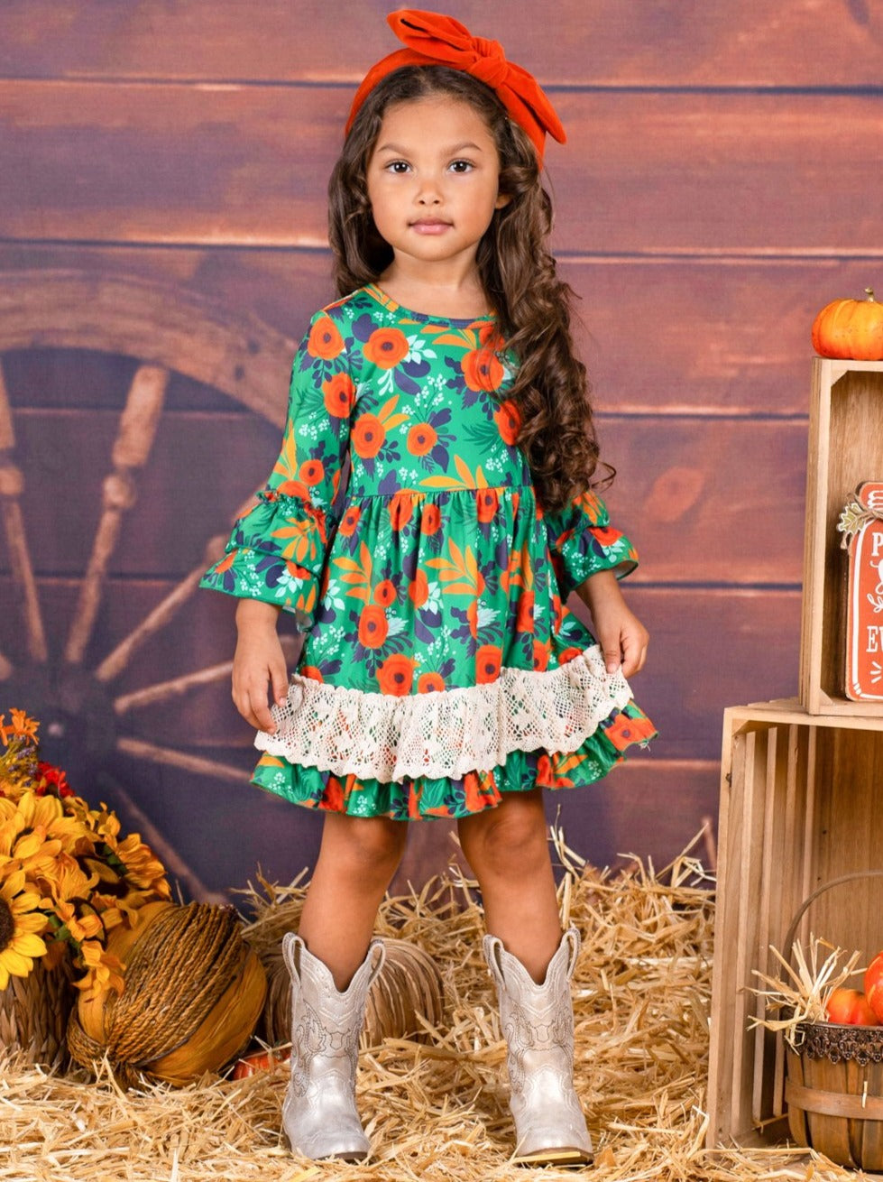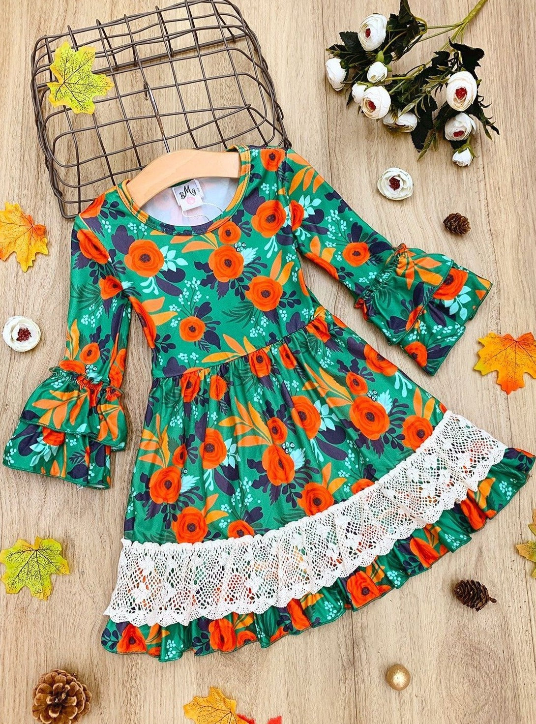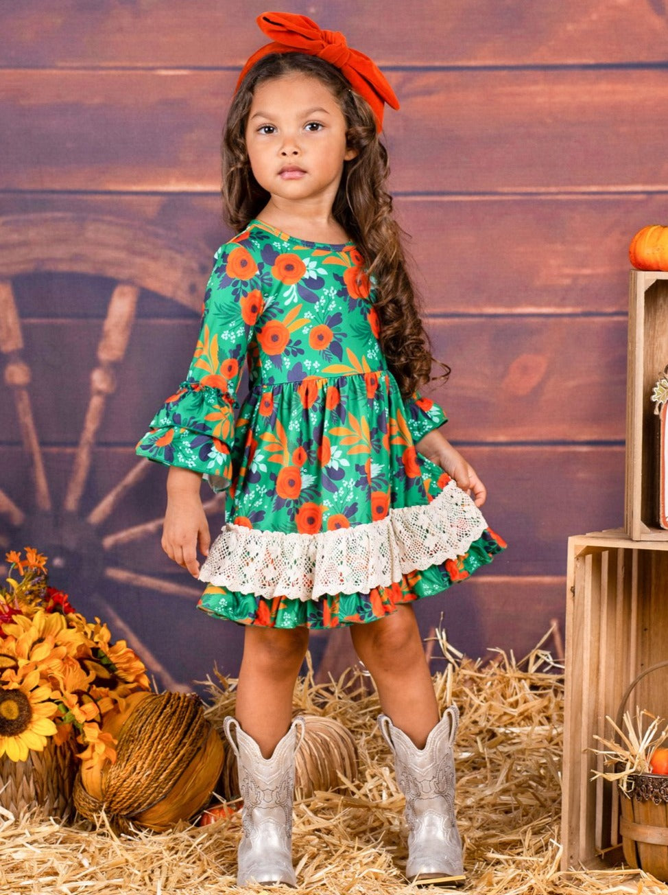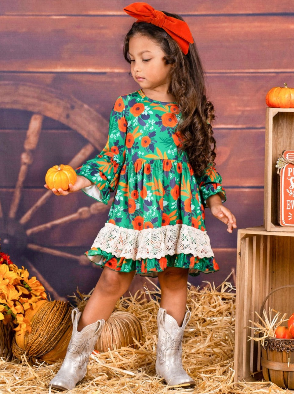 Set up your little fashionista to make a sweet statement throughout the fall season in this lightweight dress that flaunts fabulous frills and vibrant-as-can-be florals. Getting dressed for birthday parties, family outings or fall festivities will be a breeze!