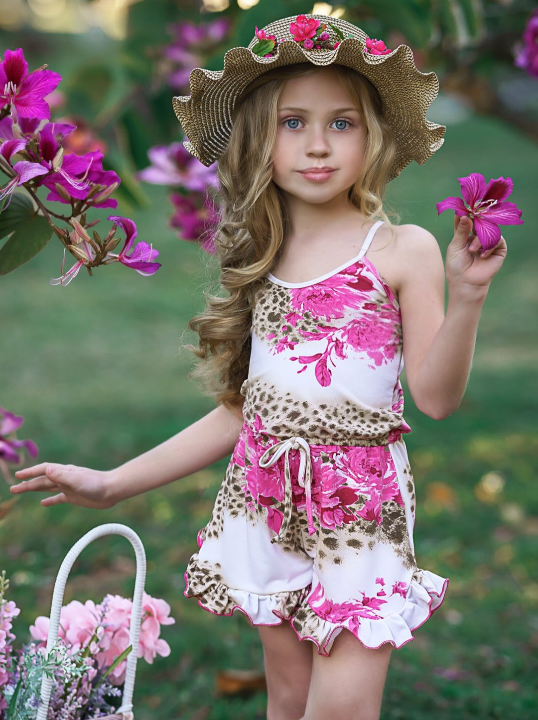 She's ready for sun and fun wearing this fierce floral and leopard print halter romper. The unique pattern is bright, colorful, and perfect for sunny-weather adventures with friends and family looking as cute as can be.