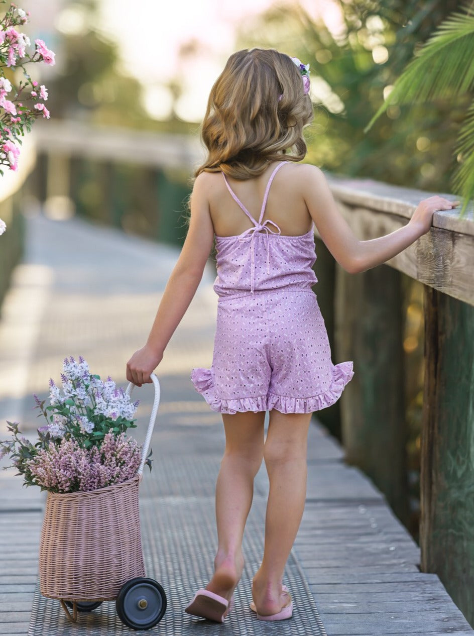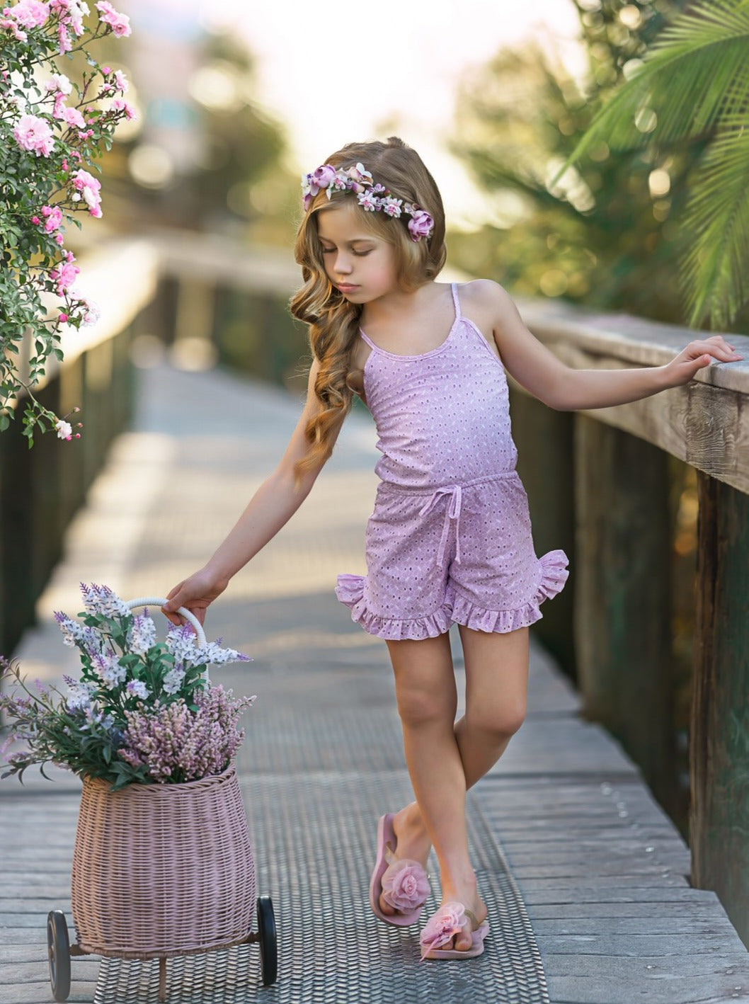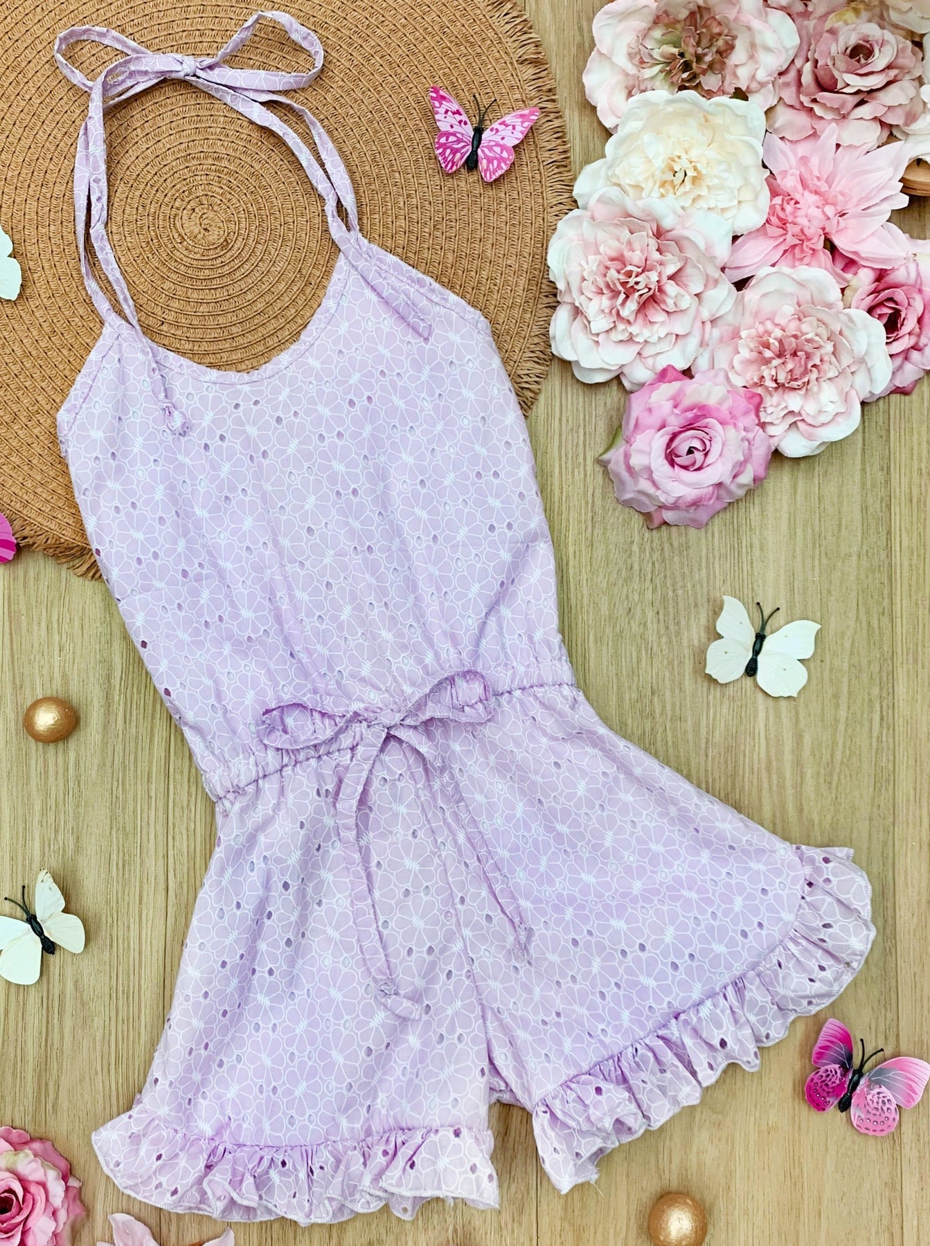 • She's ready for sun and fun wearing this heavenly eyelet ruffle romper. The lovely lilac color combined with the halter top bodice, built-in drawstring, and ruffle hem makes for one the cutest Spring looks of the year!