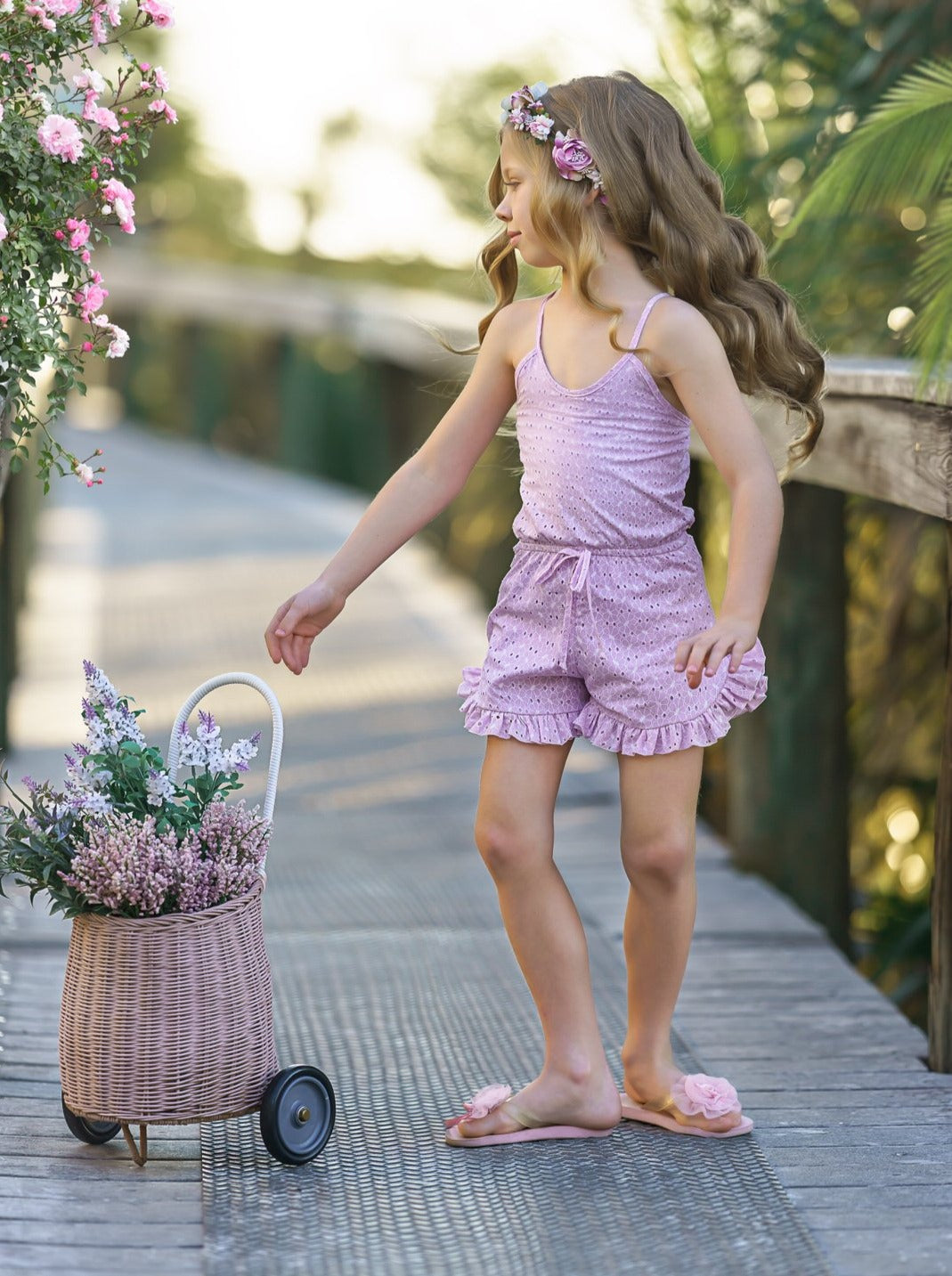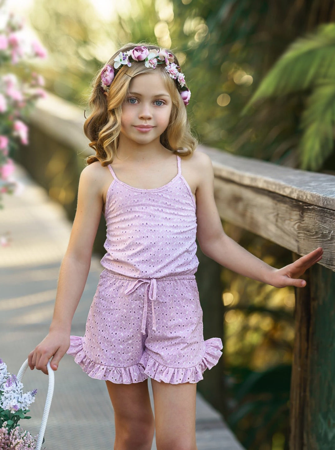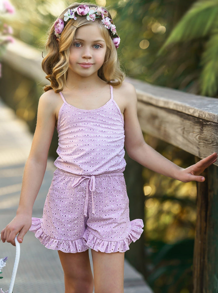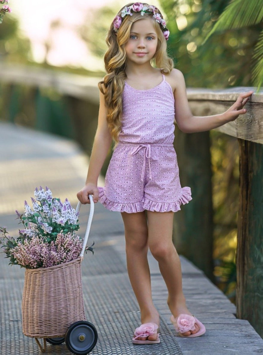 • She's ready for sun and fun wearing this heavenly eyelet ruffle romper. The lovely lilac color combined with the halter top bodice, built-in drawstring, and ruffle hem makes for one the cutest Spring looks of the year!