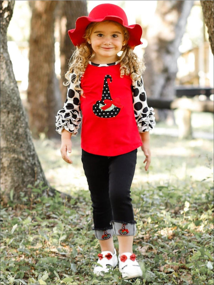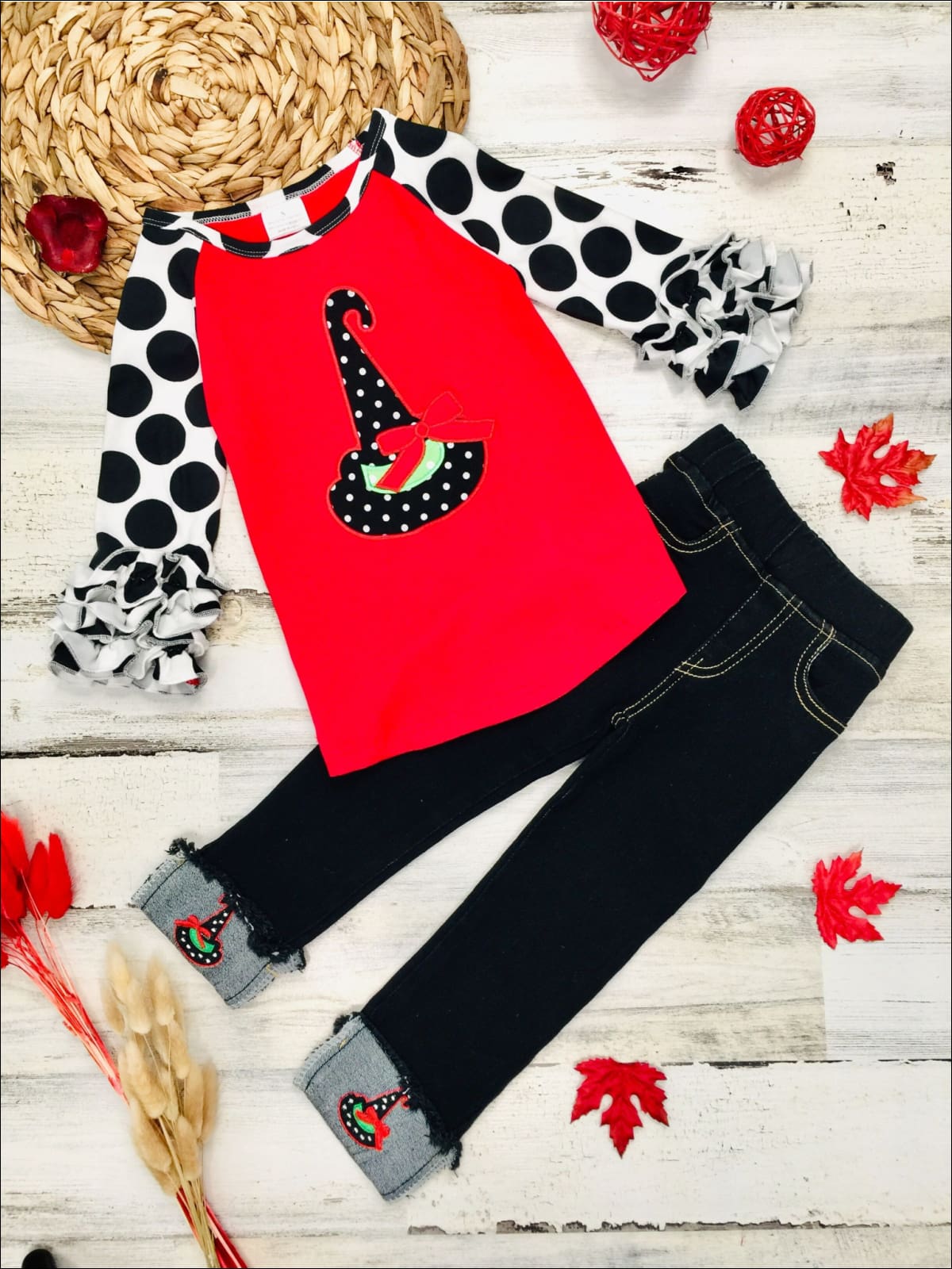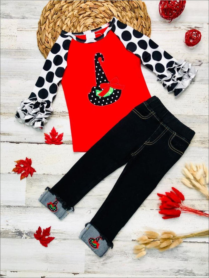 Girls Long Ruffled Raglan Sleeve Top with Candy Corn Cutie & Witch Hat Prints & Applique Cuffed Jeans Set - Red / 2T - Girls Halloween Set
