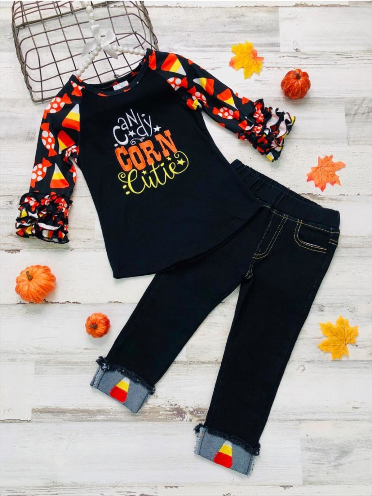 Girls Long Ruffled Raglan Sleeve Top with Candy Corn Cutie & Witch Hat Prints & Applique Cuffed Jeans Set - Girls Halloween Set