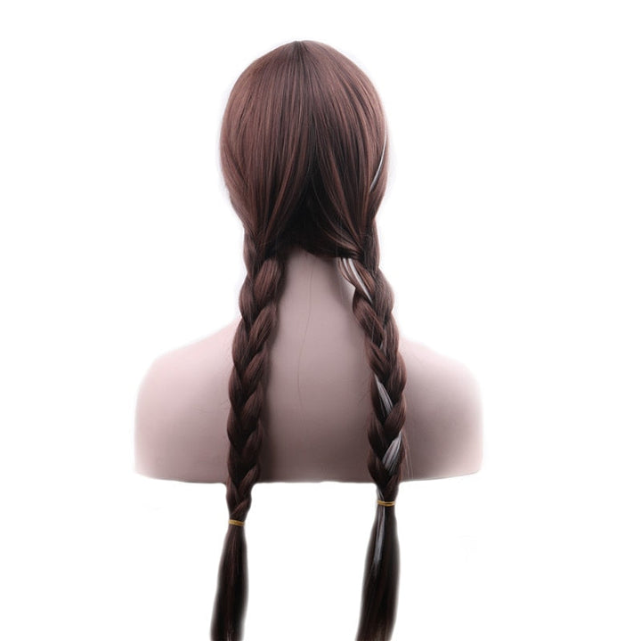 Long brunette wig styled with bangs and two side braided pigtails, has one section of white hair