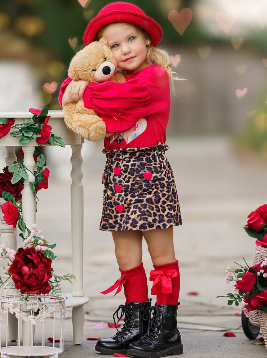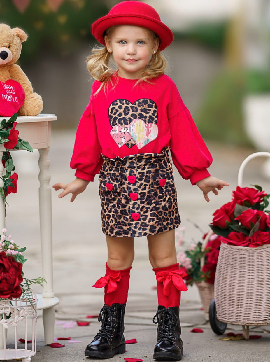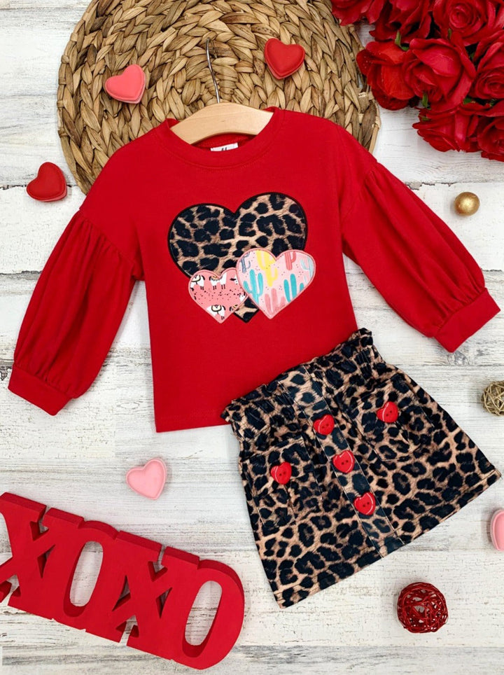 - Want even more to love about Valentine's Day? Dress your darling diva in this fierce puff sleeve top and leopard print skirt set. She'll adore her unique new look, complete with heart buttons and front pockets on the cute paperbag waist skirt.