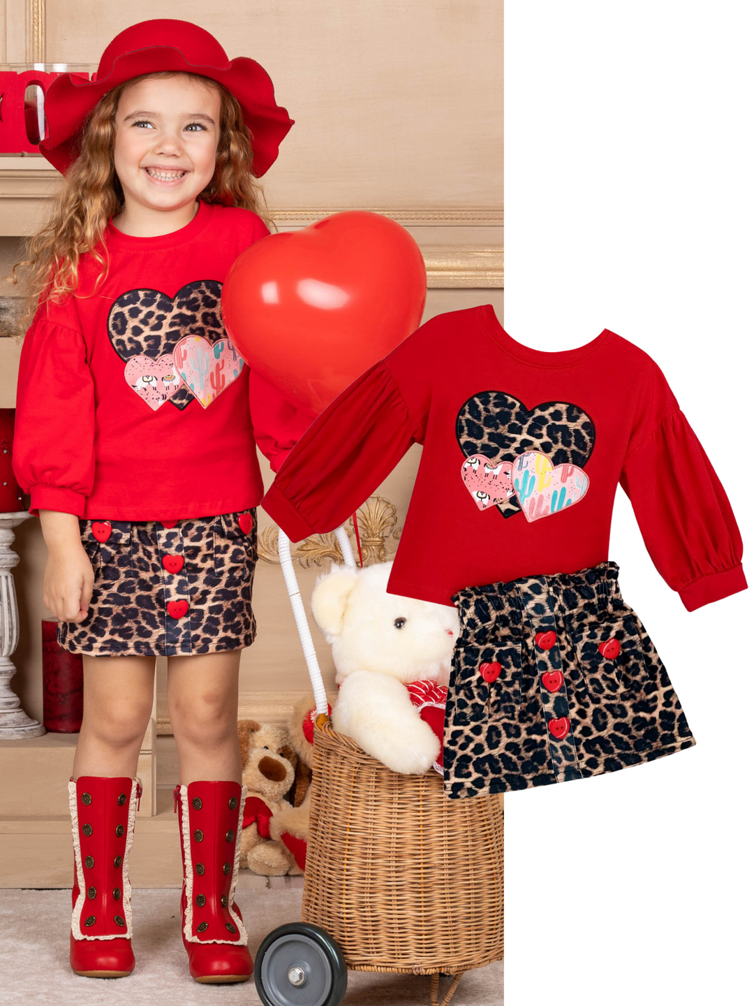 - Long puff sleeve top with mixed leopard print, llama, and cactus print heart applique and a leopard print paperbag waist skirt with red heart buttons and two front pockets
