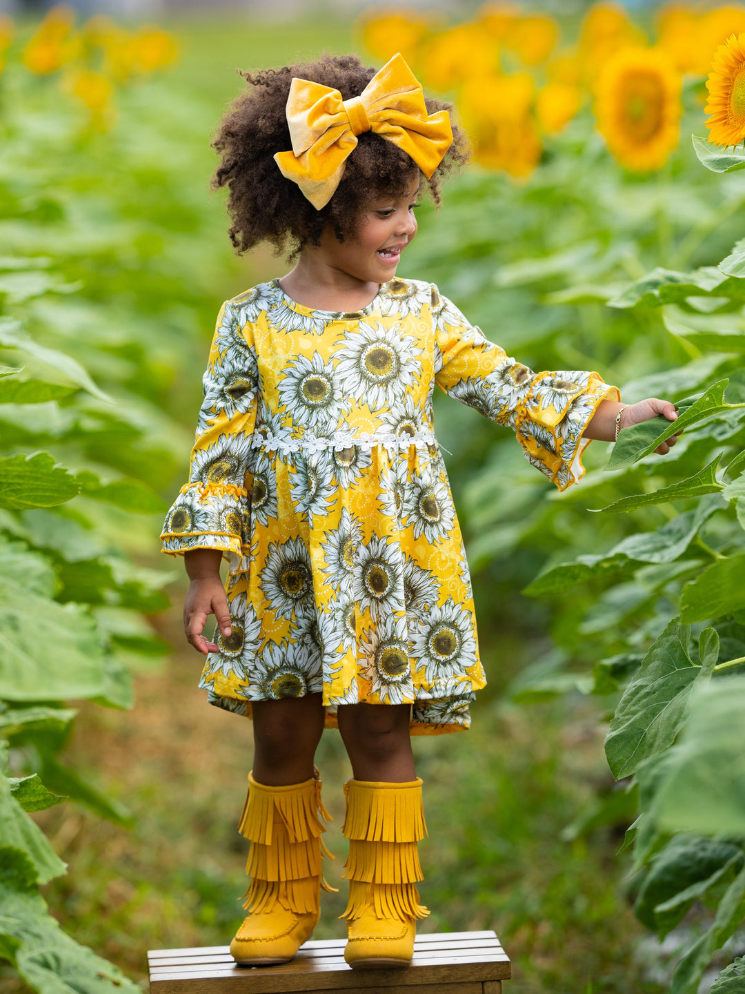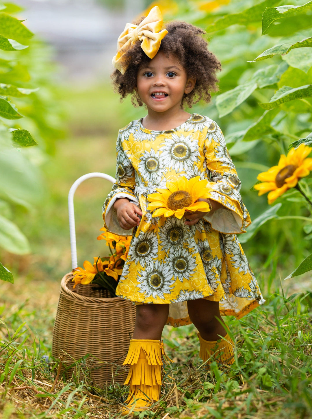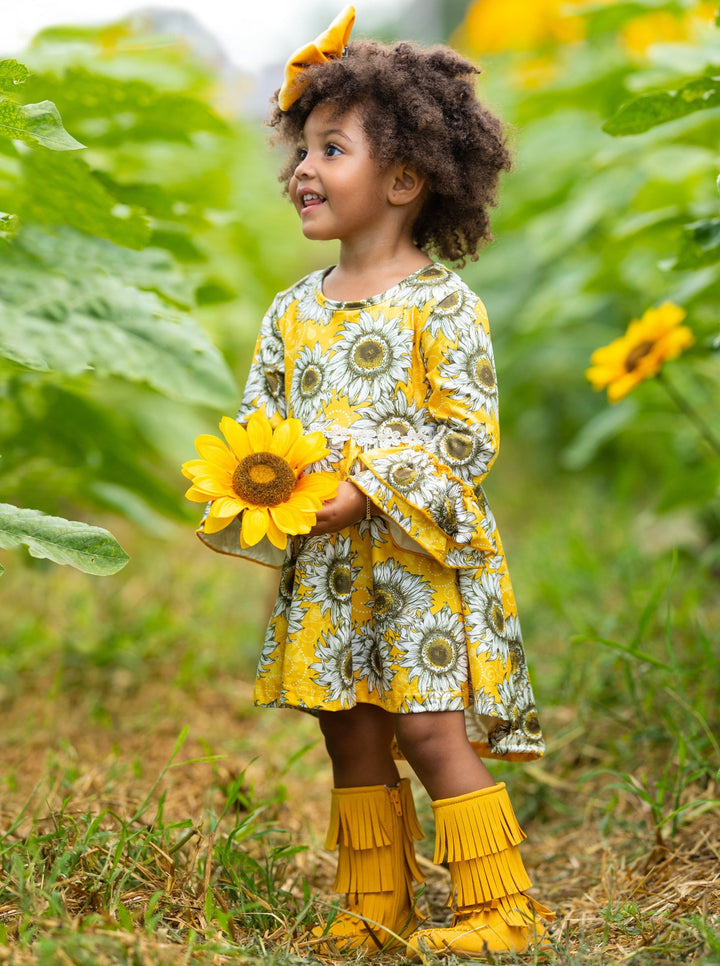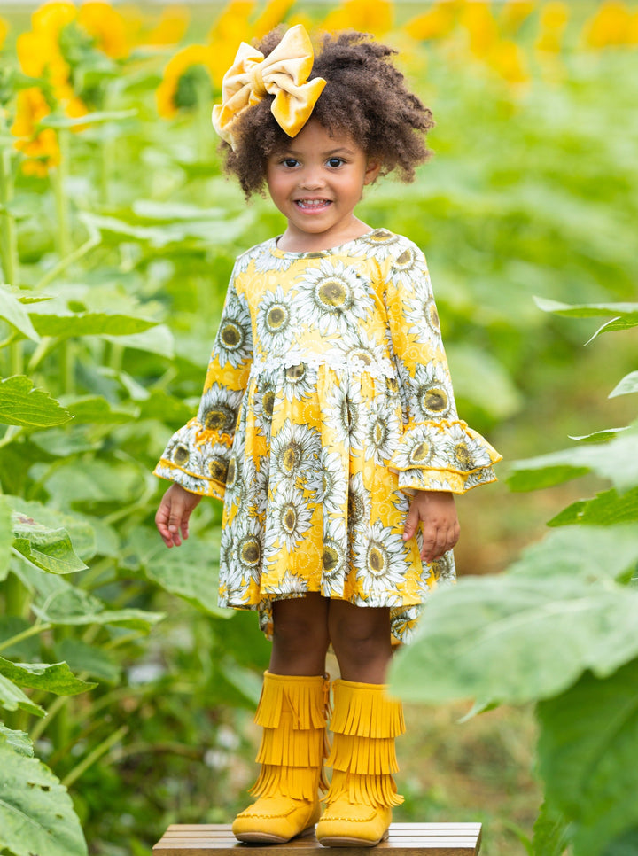 Set up your little fashionista to make a sweet statement throughout the Fall season in this sweet sunflower hi-lo dress she won't want to take off! Styled with flair and made with love, it's a bright and lively fashion statement guaranteed to make your little smile from ear to ear!