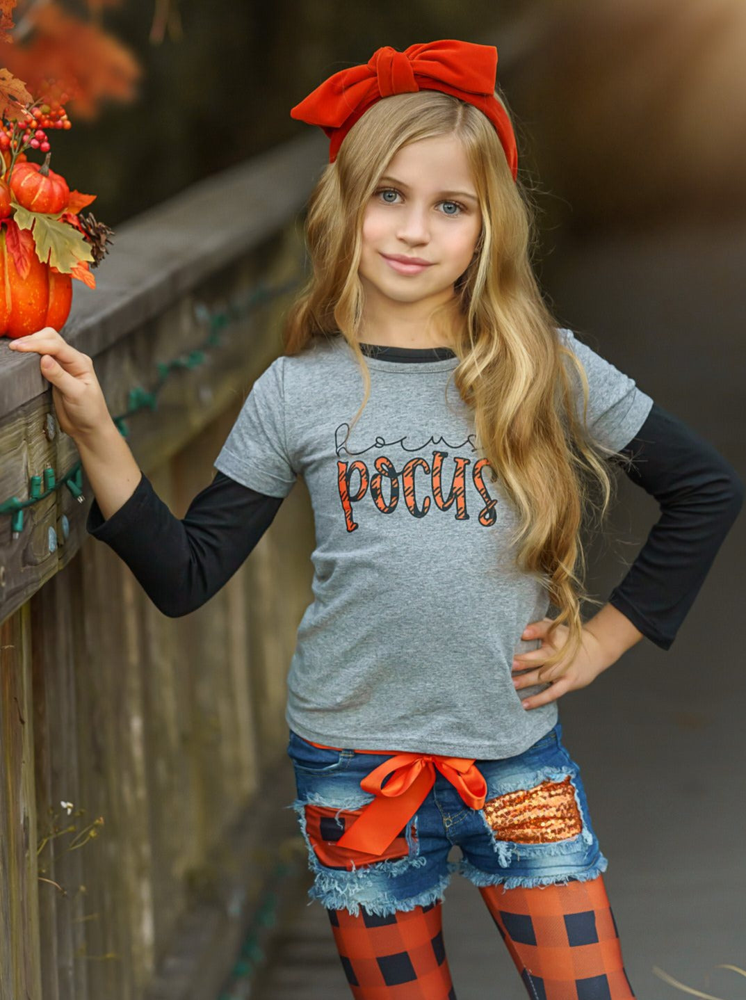 Long-sleeve "Hocus Pocus" graphic print top, plaid print leggings and matching fabric and sequin patched denim shorts with satin belt sash