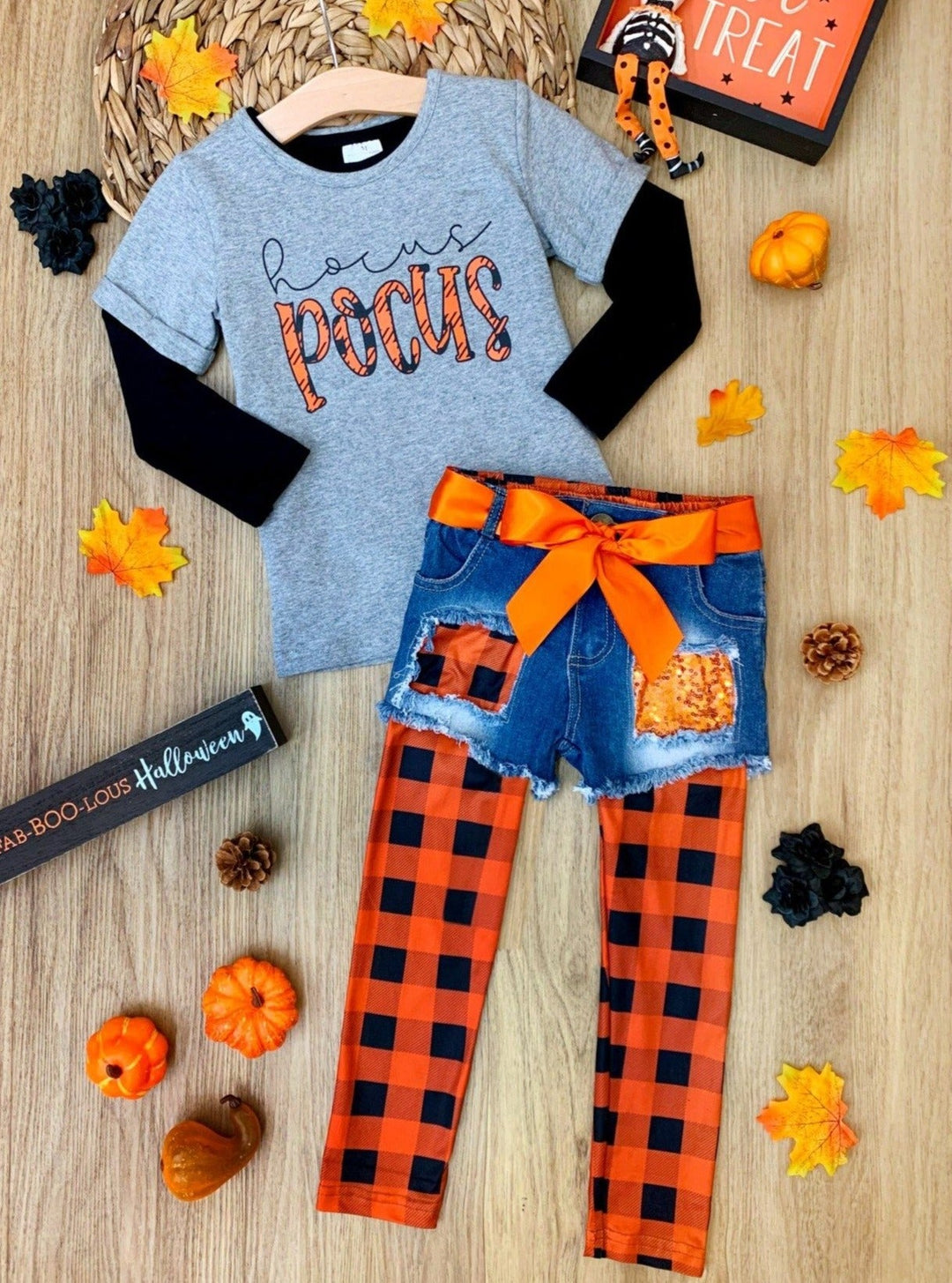 Hocus Pocus Top, Patched Denim Shorts and Plaid Legging Set