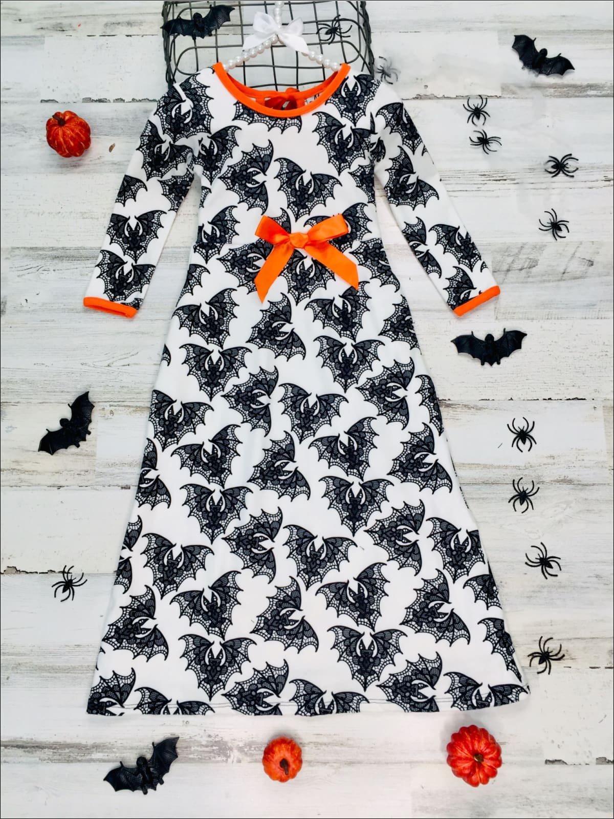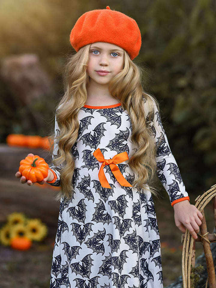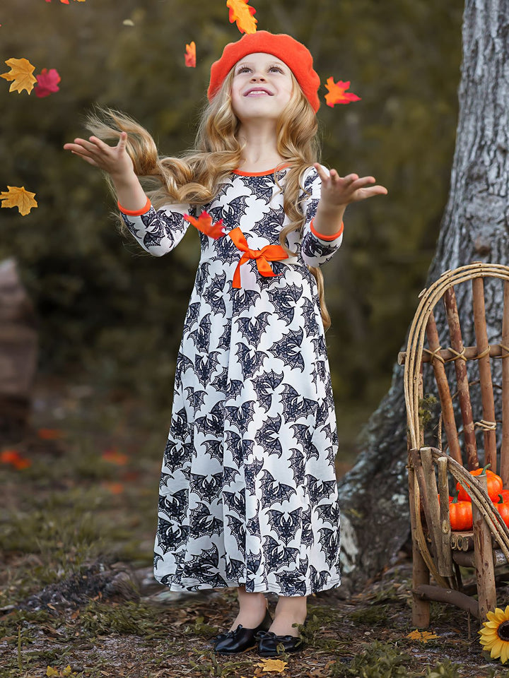 Here's one maxi dress your little girl will go absolutely batty over! With a unique bat design and hints of orange, all eyes will be on her this Halloween season.