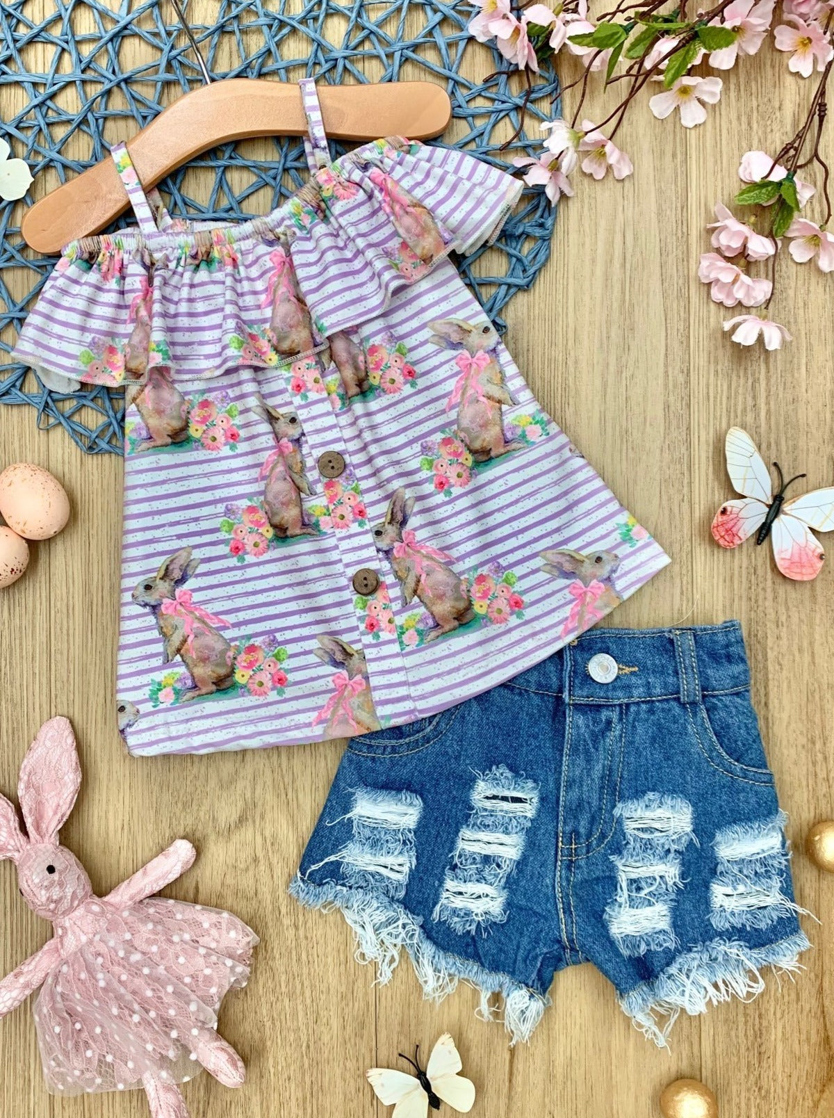 Hare today, fashionista tomorrow! Help your little girl hop into the spotlight with this airy and light denim shorts set that's sure to be her new Easter go-to outfit. The cold-shoulder ruffle trim top comes covered with stripes, flowers, and cute bunnies. It pairs surprisingly sweetly with the ripped and fringed jean shorts for the ultimate casual comfort.