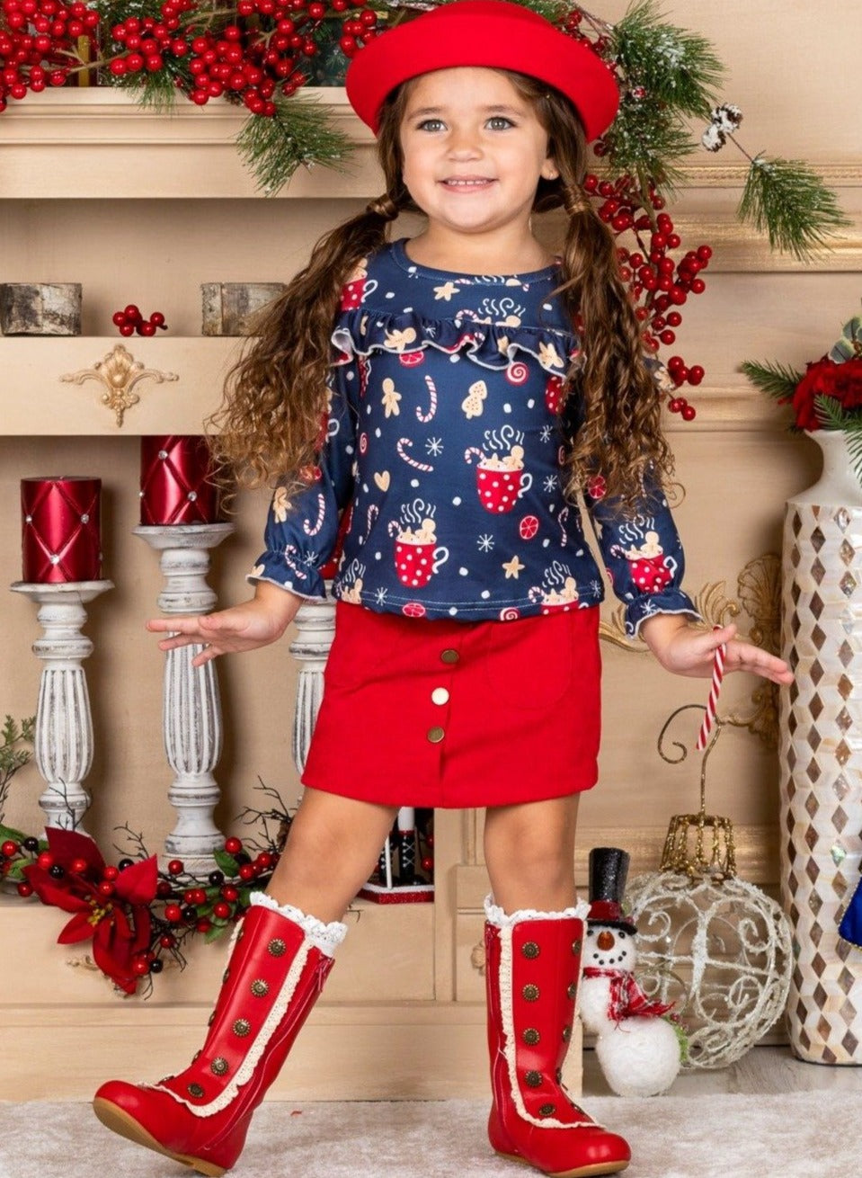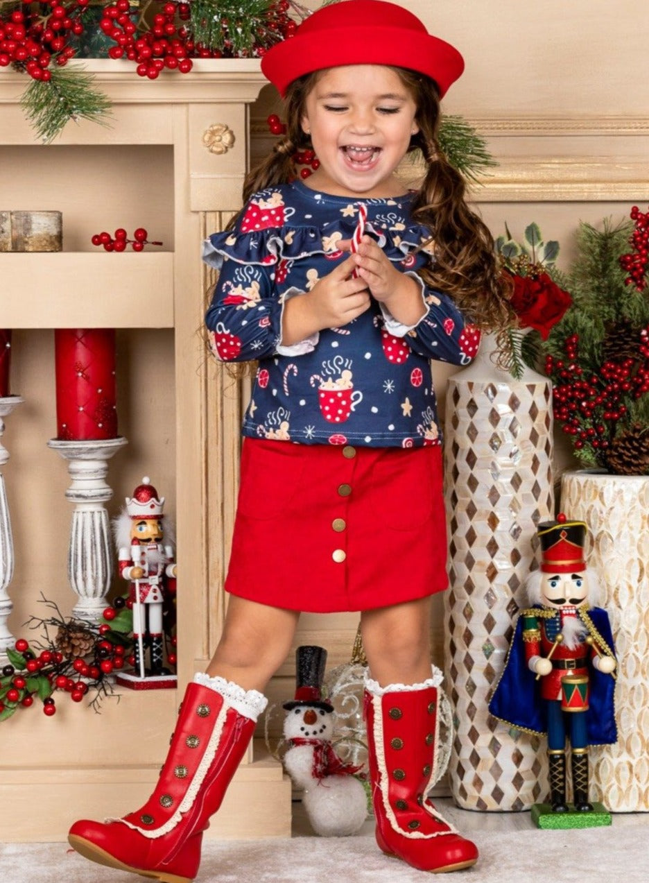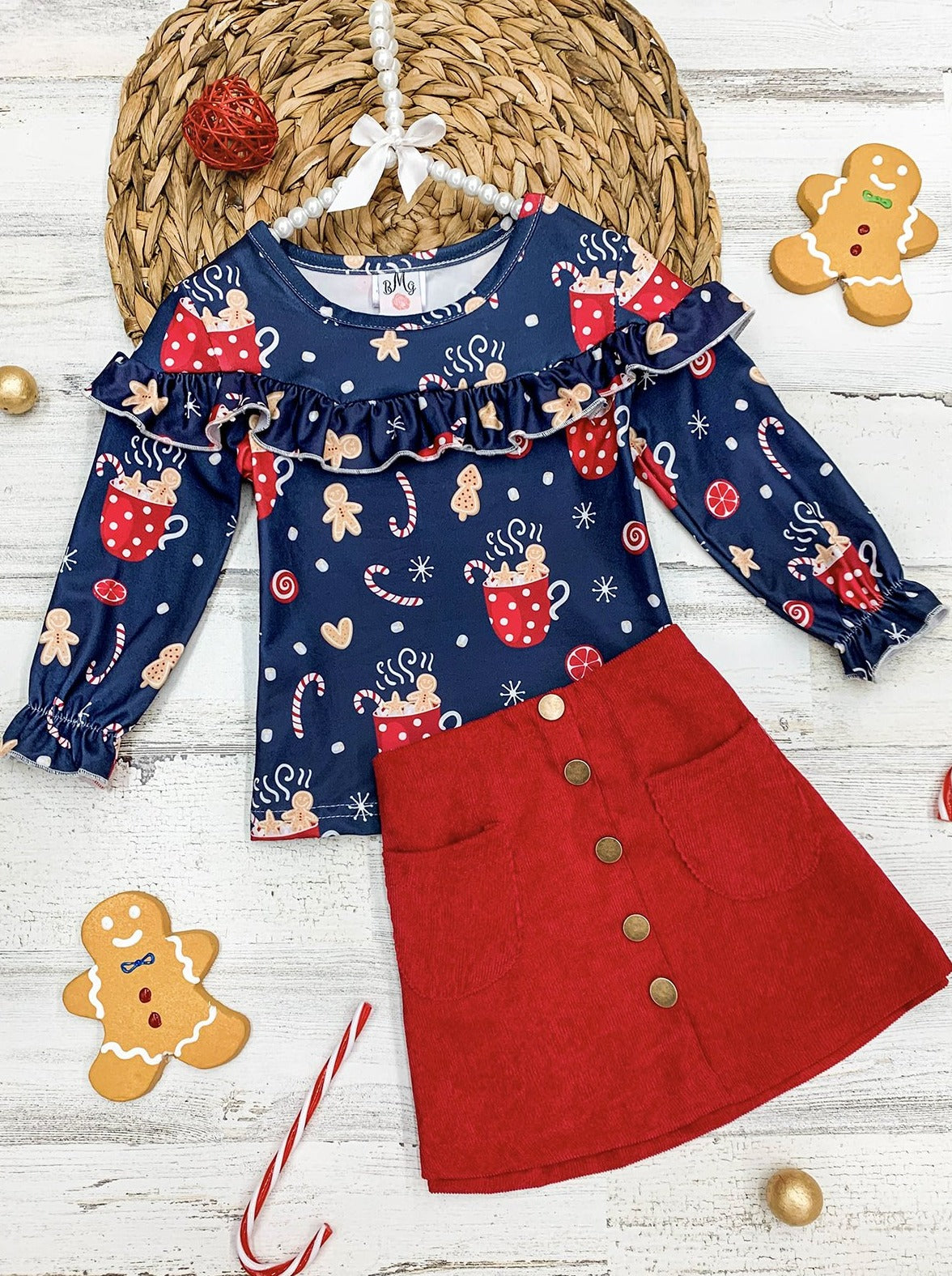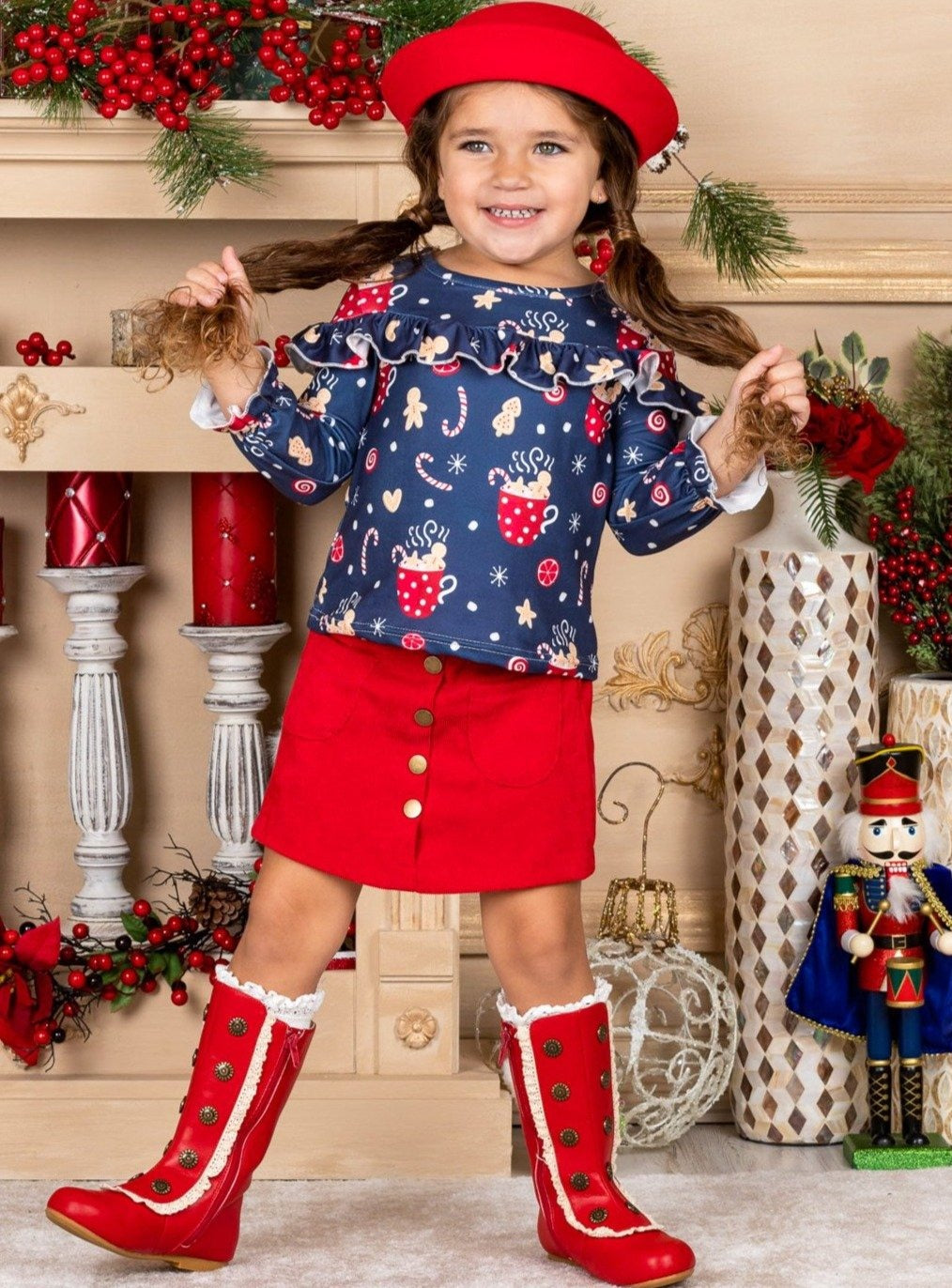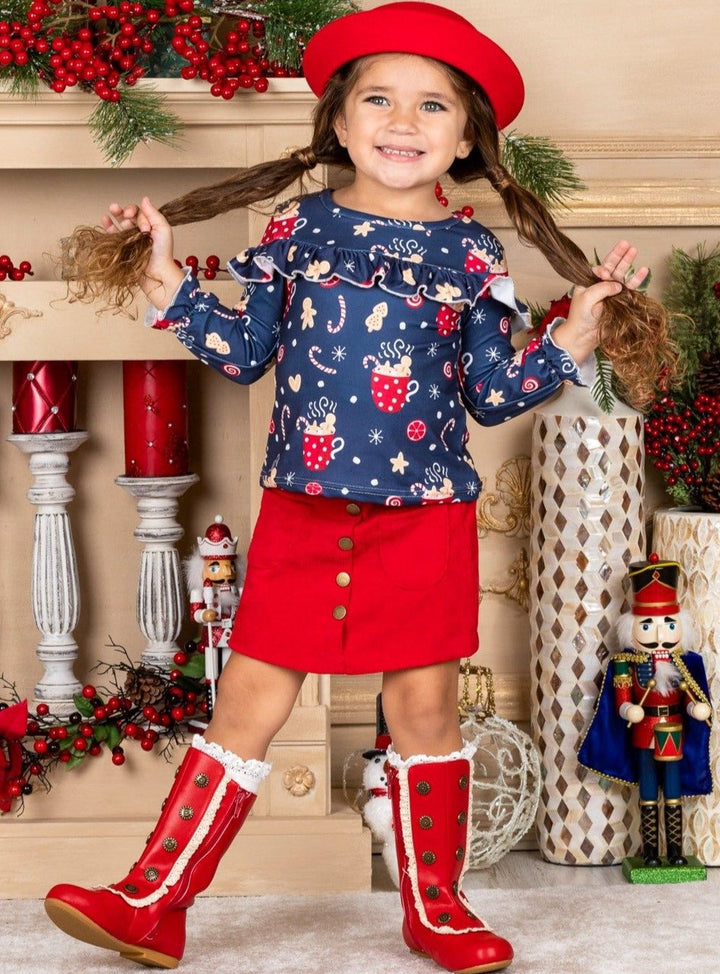Long-sleeve top with ruffled bib and cuffs, hot cocoa and winter treat graphic design and faux button skirt with two front pockets