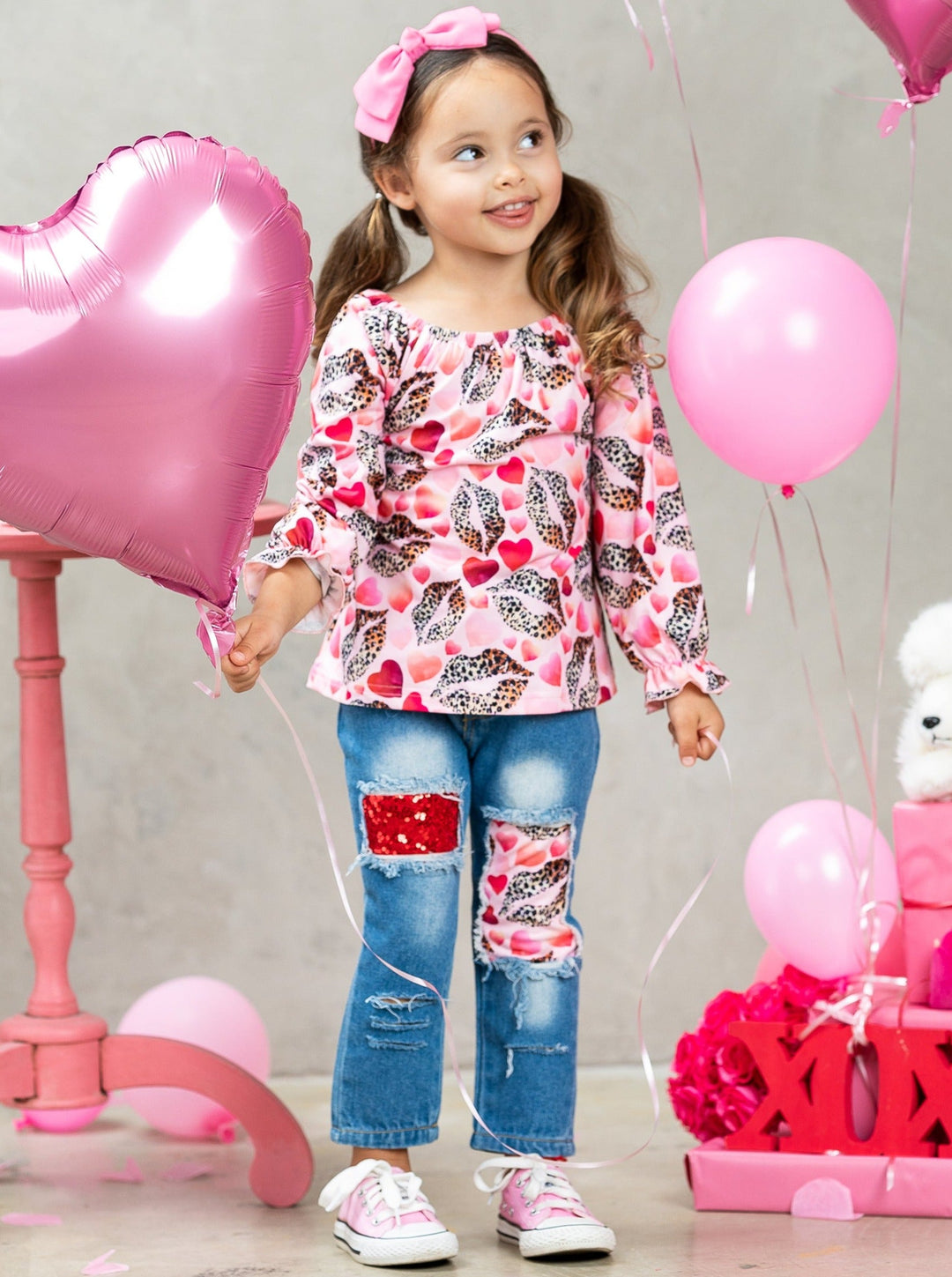 Cover your little girl with hearts and kisses for her next big Valentine's adventure. Made with love, our uber-comfy off-shoulder top covered in hearts and kissy lip prints is the cutest way to style your sweetheart with matching patchwork jeans. Pretty, chic, and always fashionable, this outfit was made for your diva.