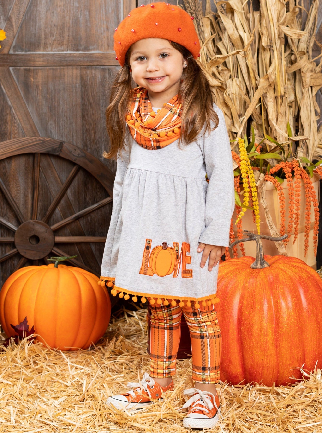 - Long-sleeve tunic with plaid pumpkin "Love" graphic applique on skirt, pom-pom tassel hem, plaid leggings, and a matching infinity wrap scarf