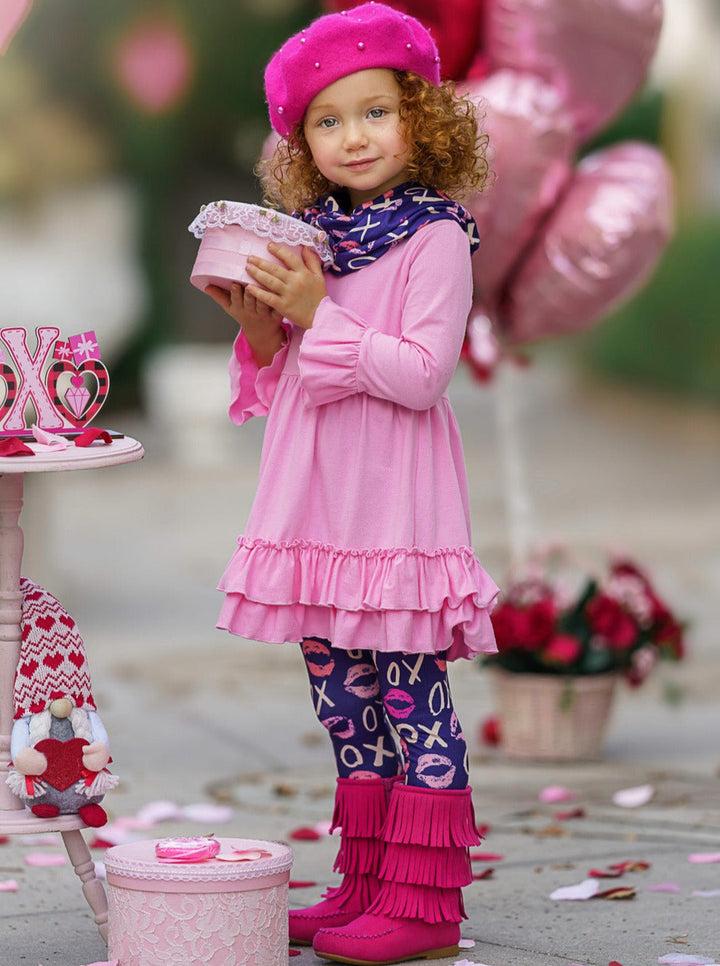 Flirty style bursting with love is waiting for your little girl to wear this Valentine's Day! X's, O's, and plenty of kisses make up the stretchy soft leggings and matching infinity wrap scarf. Leaving the pink tunic with a two-tier ruffle hem and cuffs to shine brightly.